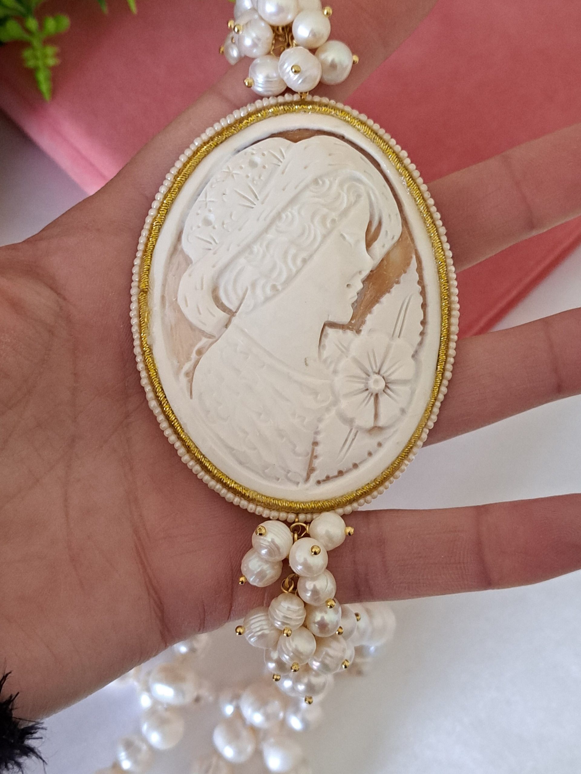 Collana cammeo conchiglia sardonica con perle bianche e catena dorata, gioielli italiani