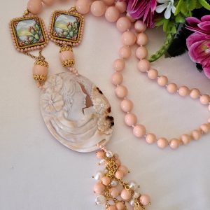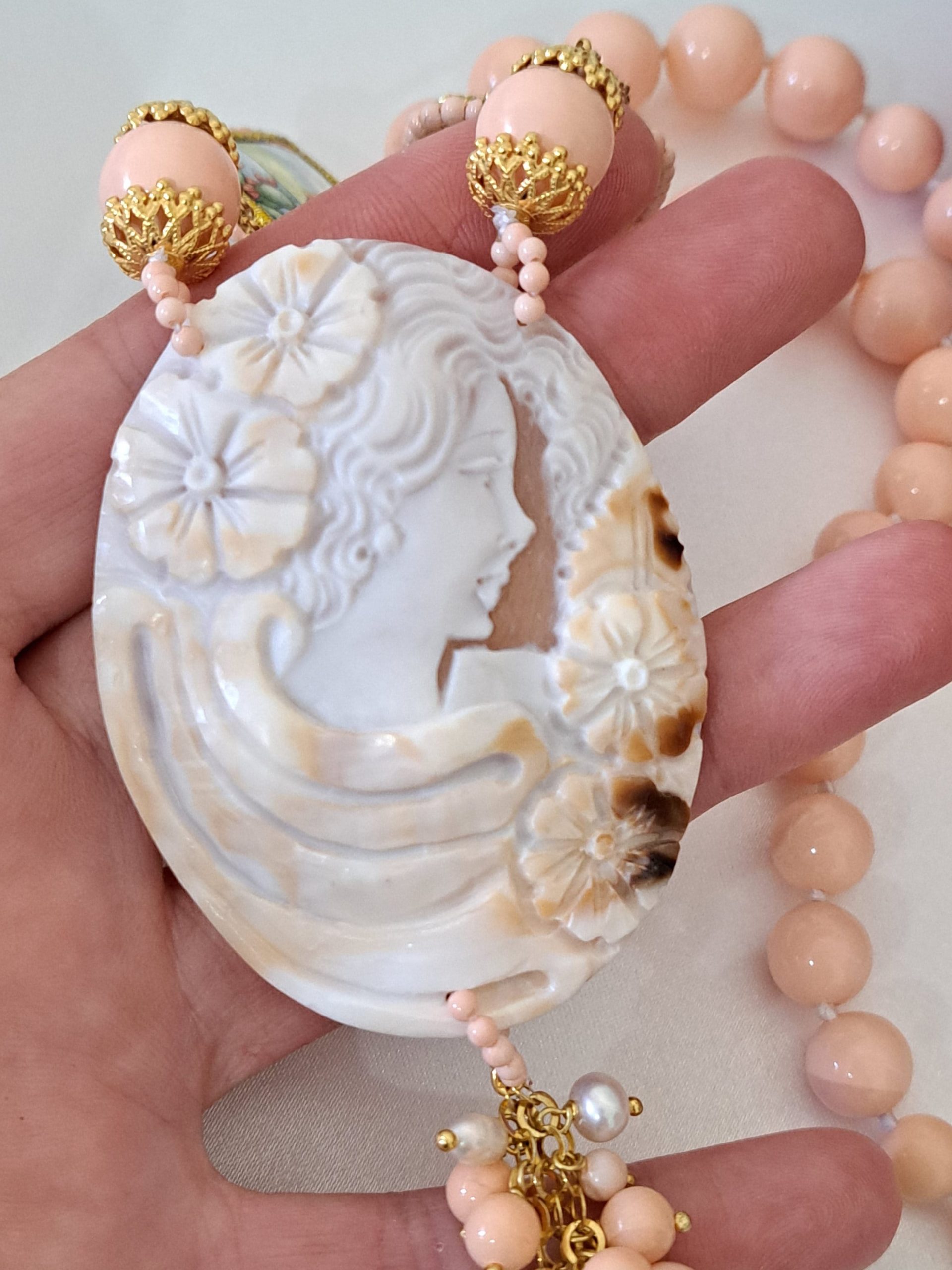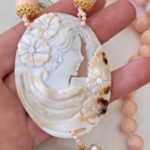Collana con perle pasta di corallo rosa imitazione annodate a mano con cammeo autentico in conchiglia sardonica scolpita a mano a Torre del greco 7×5 cm dimensioni raffigurante volto di donna, pendente in argento 925 placcato oro con perle bianche naturali e perle pasta di corallo rosa e con 2 piastrelle in pietra lavica smaltata con motivi Caltagirone con cornice perline rosa 2×2 cm dimensioni .