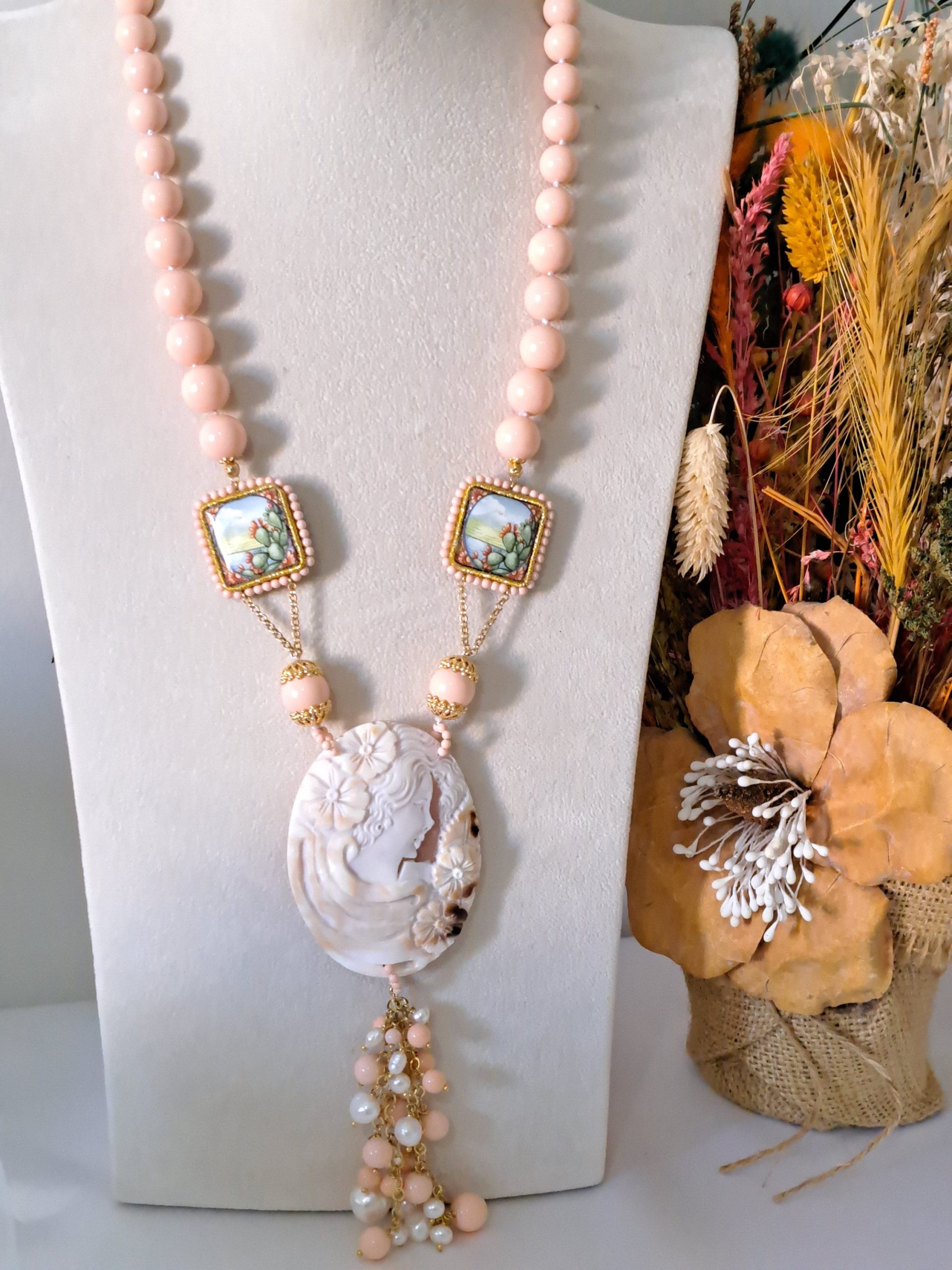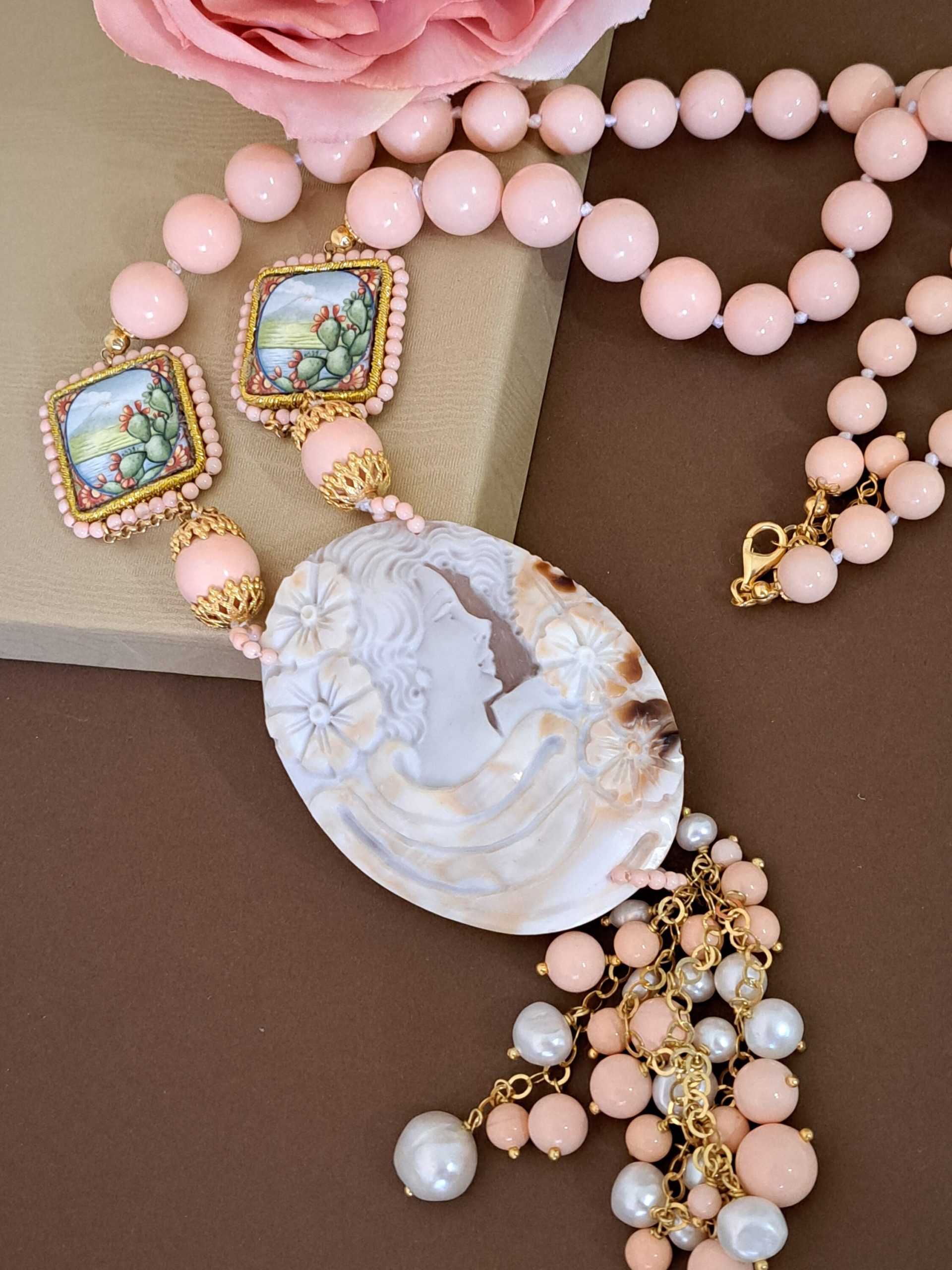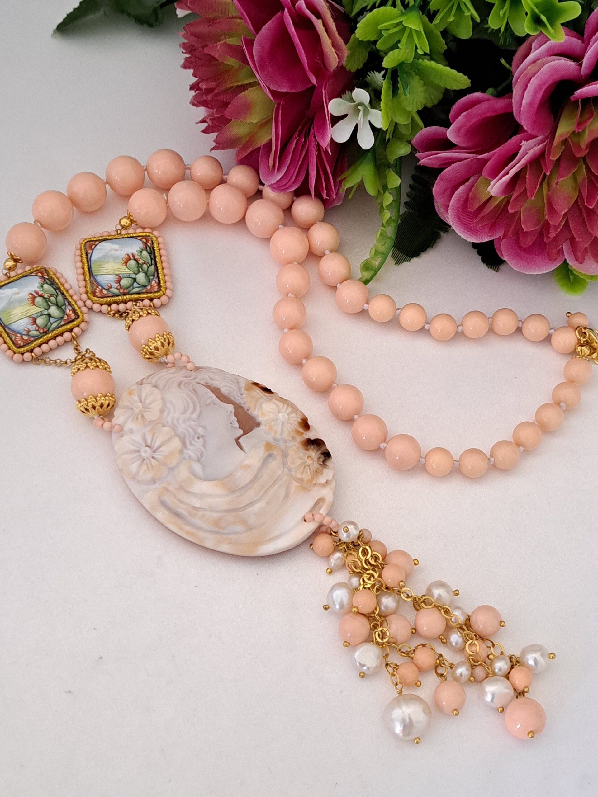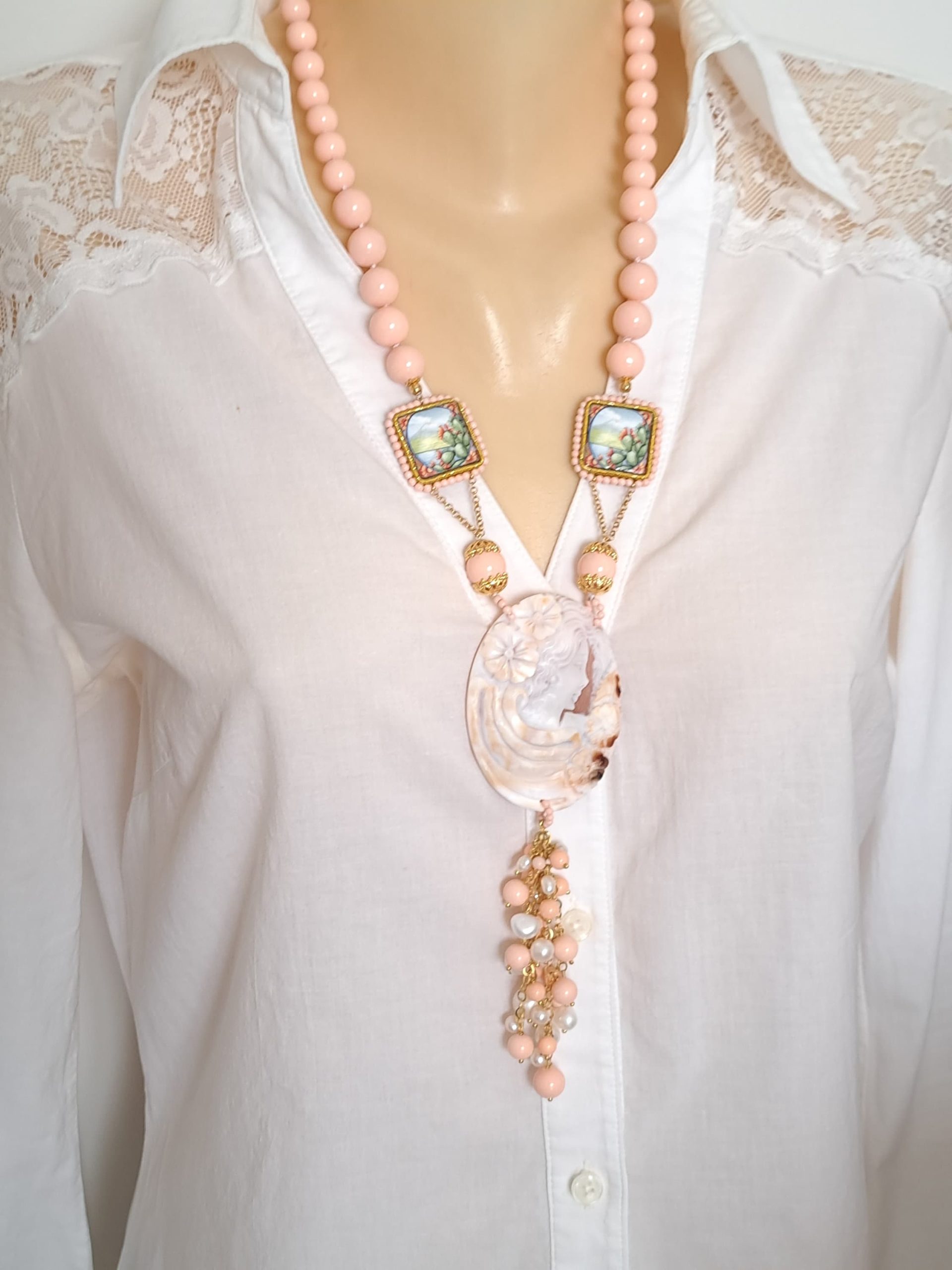Collana cammeo conchiglia sardonica, piastrelle ceramica Caltagirone e perle pasta di corallo rosa , gioielli italiani