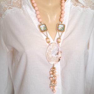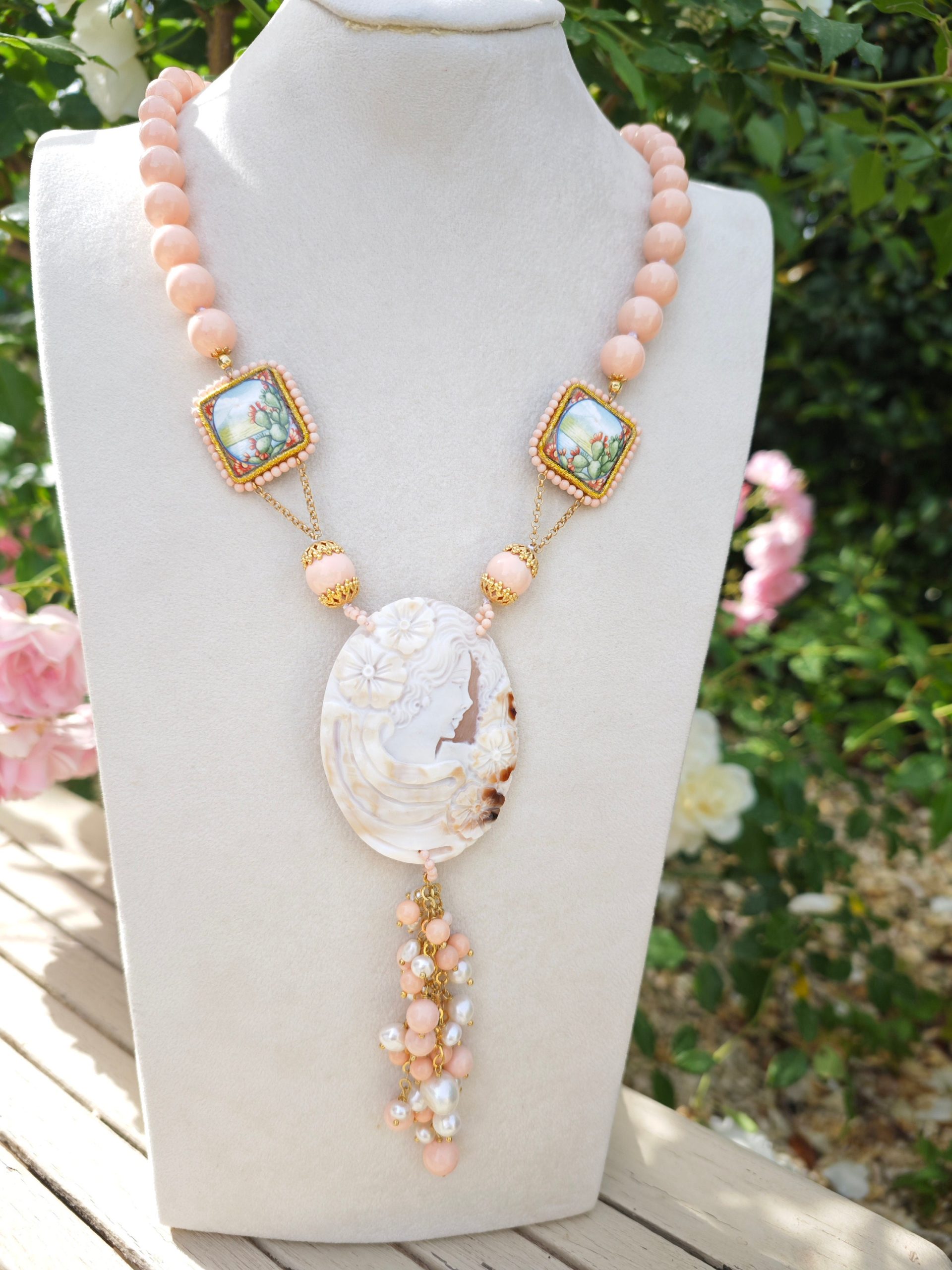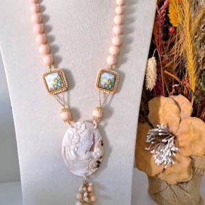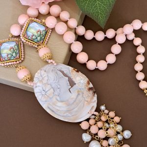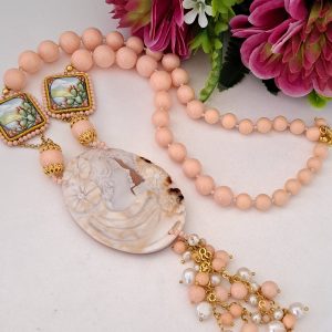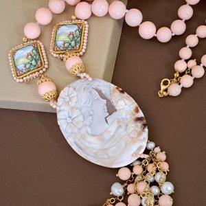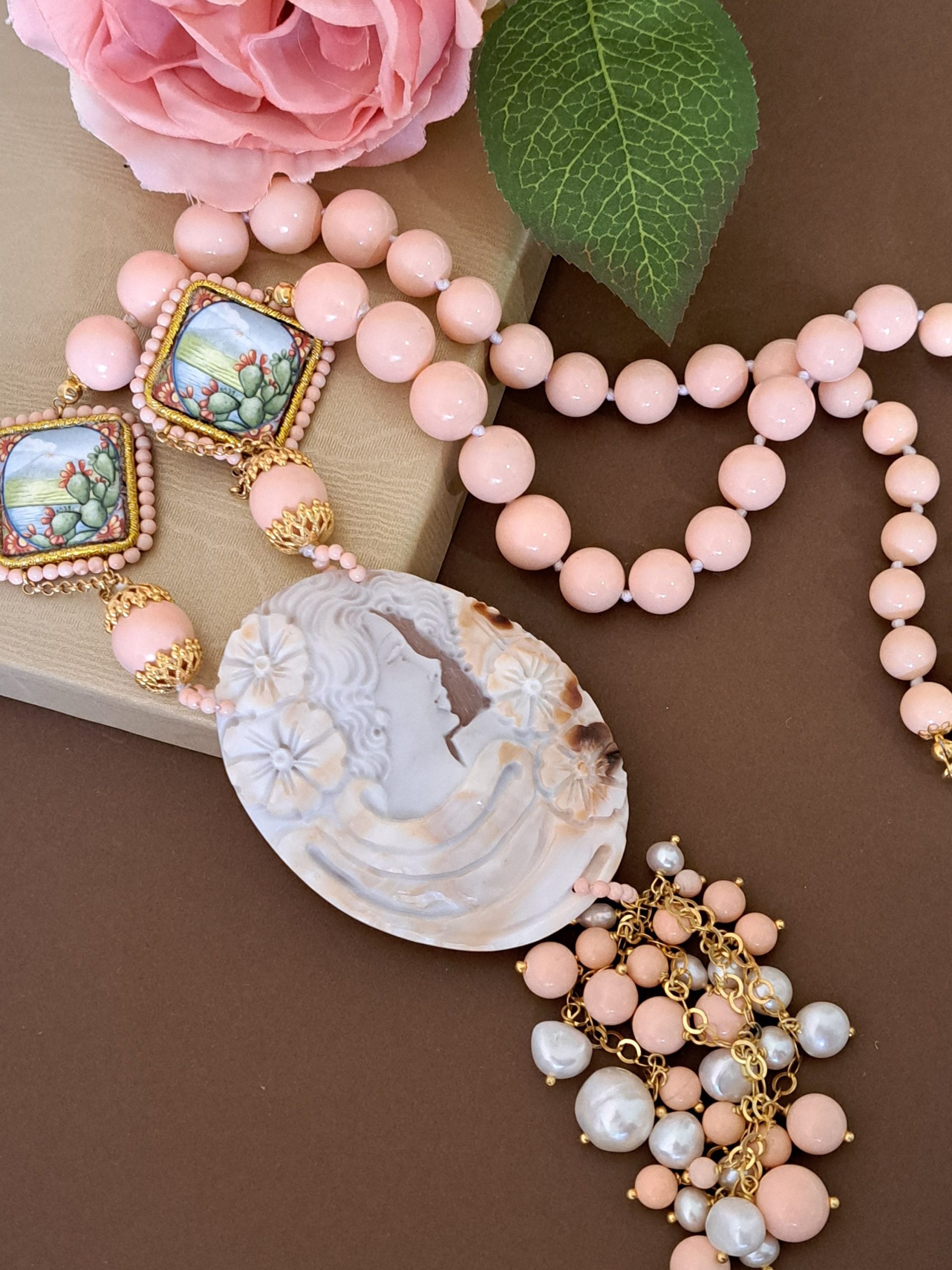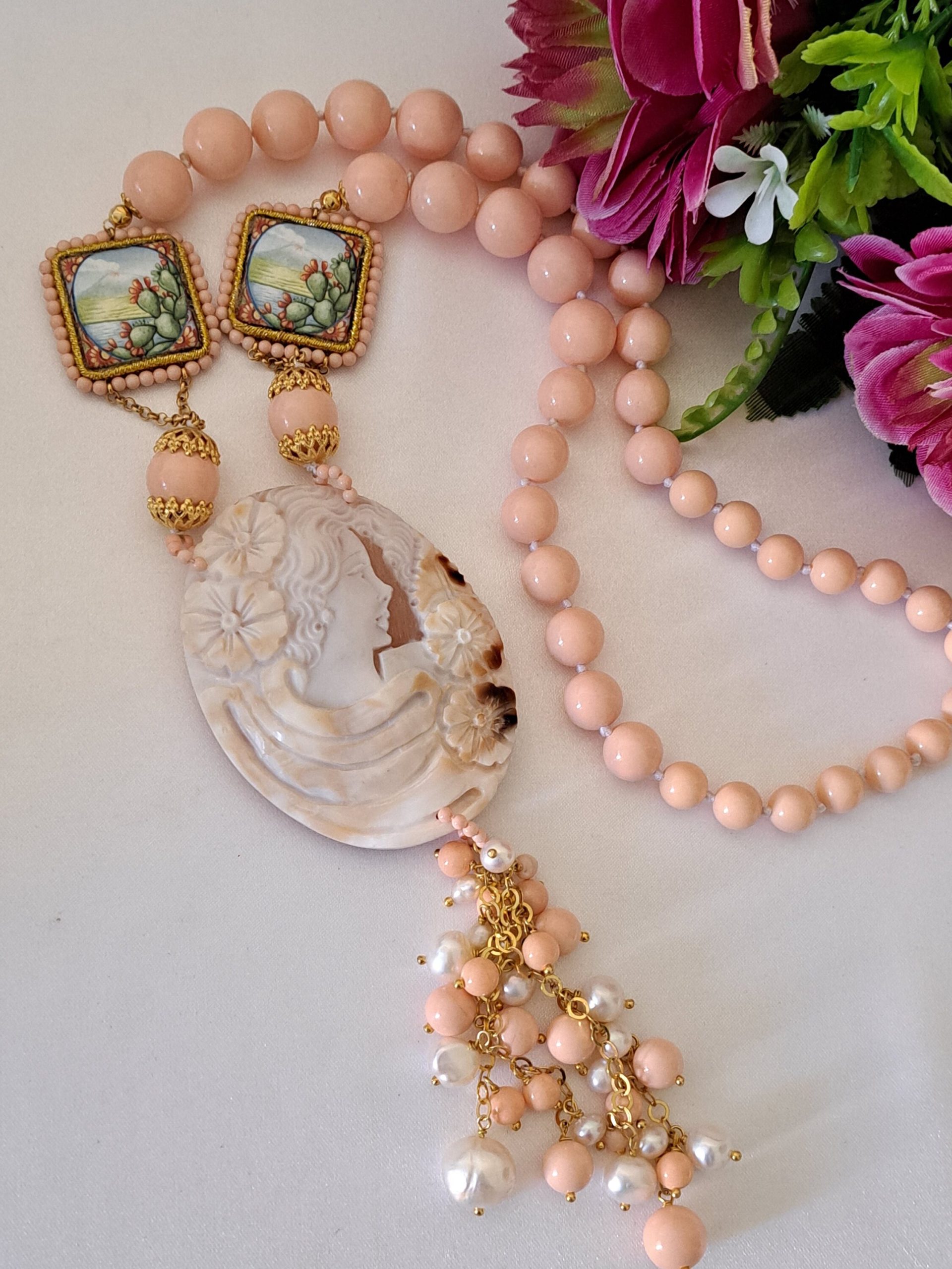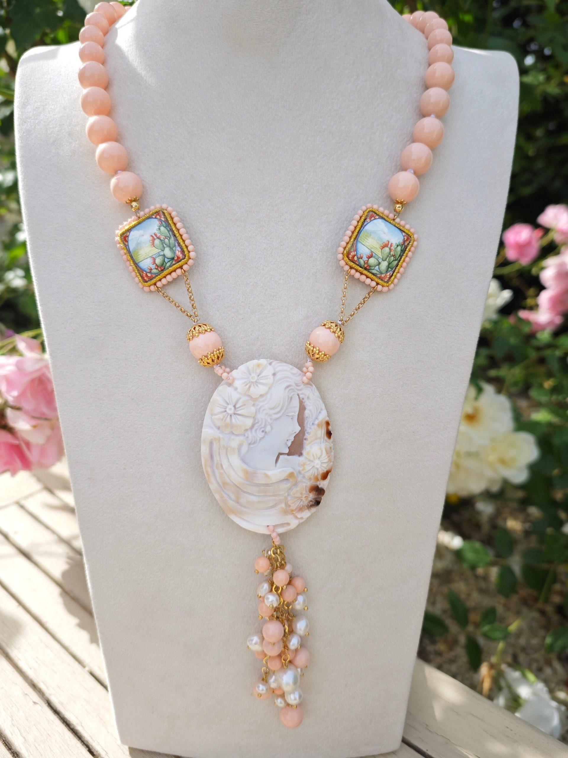 Collana cammeo conchiglia sardonica, piastrelle ceramica Caltagirone e perle pasta di corallo rosa , gioielli italiani