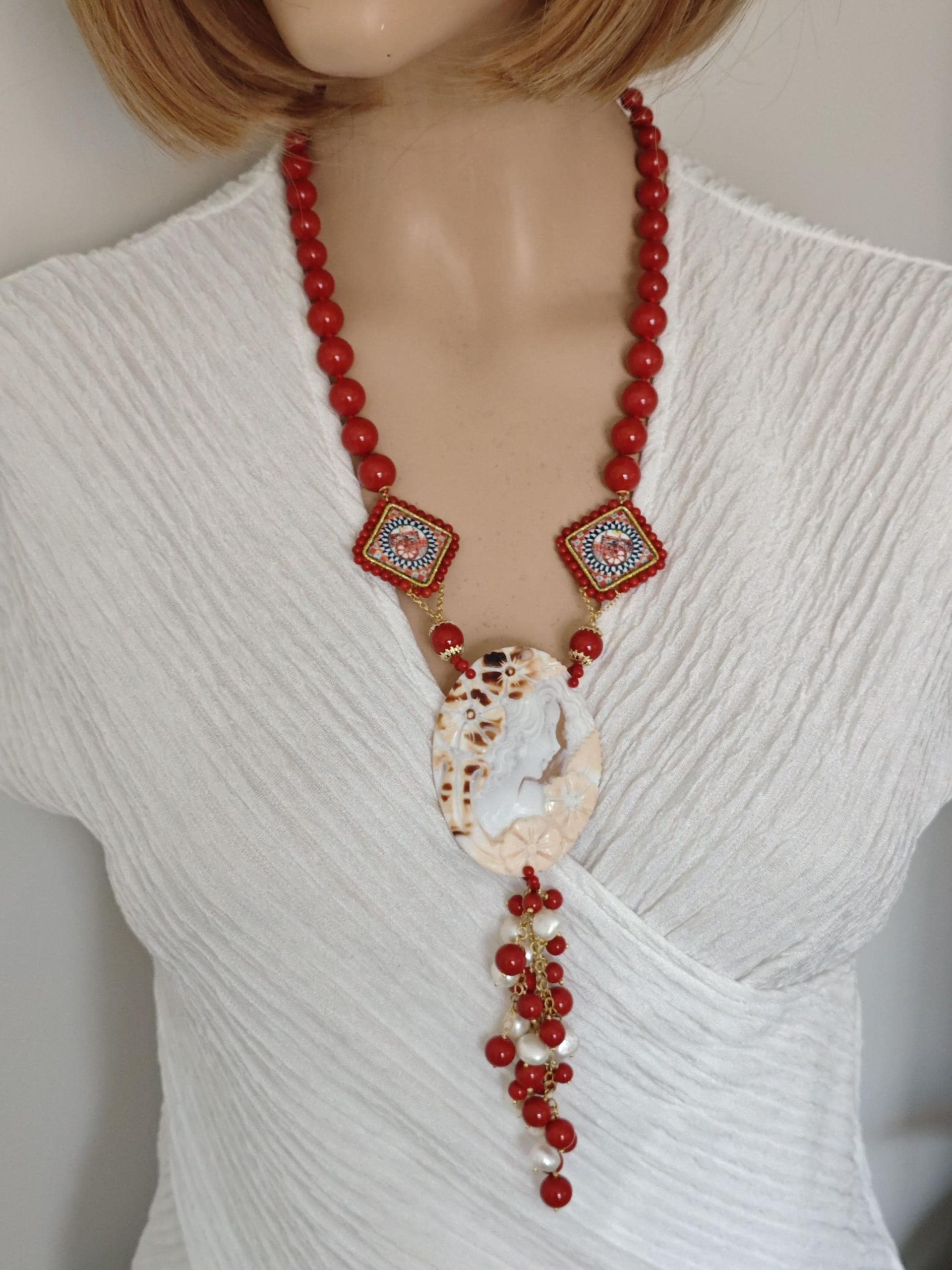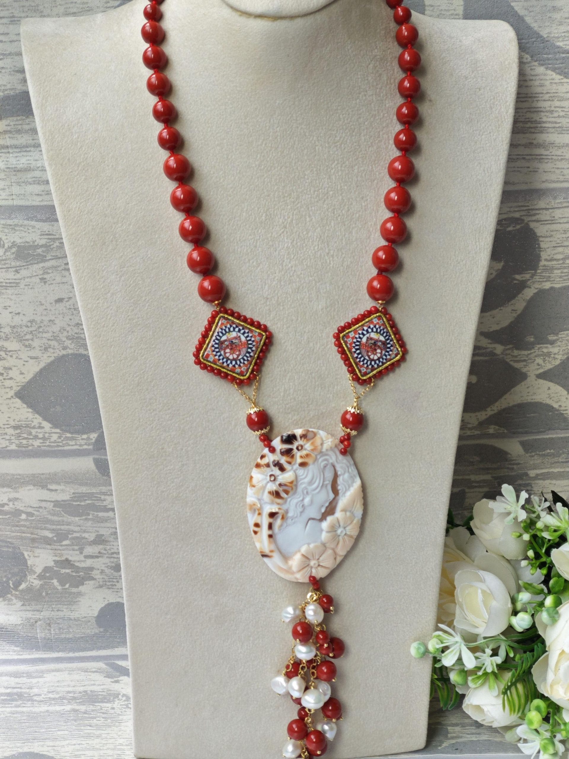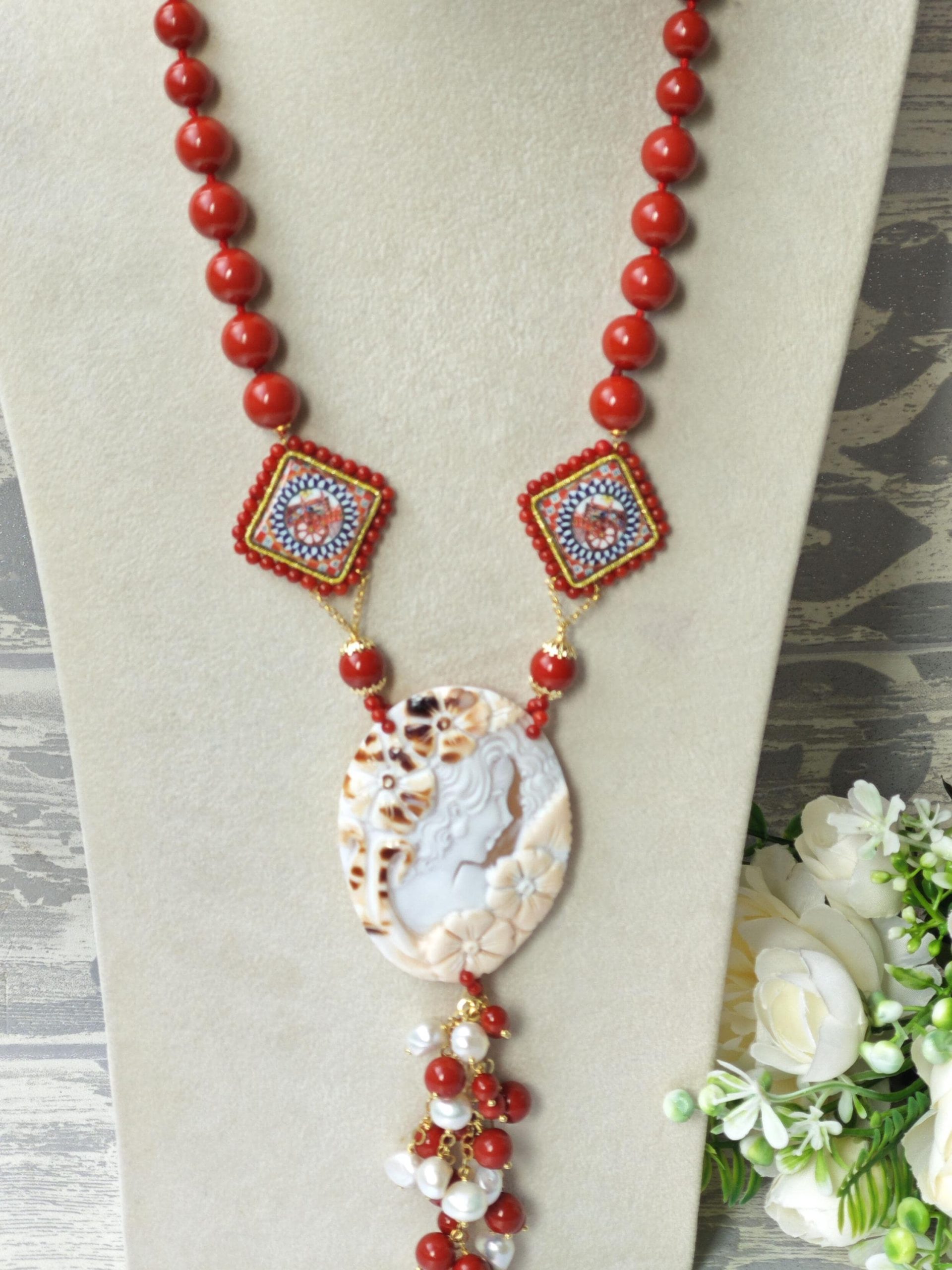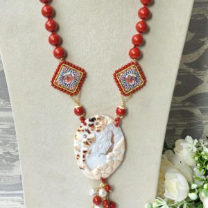Collana cammeo conchiglia sardonica, piastrelle ceramica Caltagirone e perle pasta di corallo rosso , gioielli italiani
