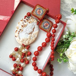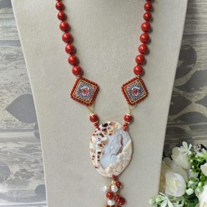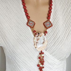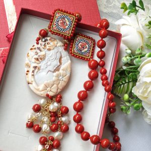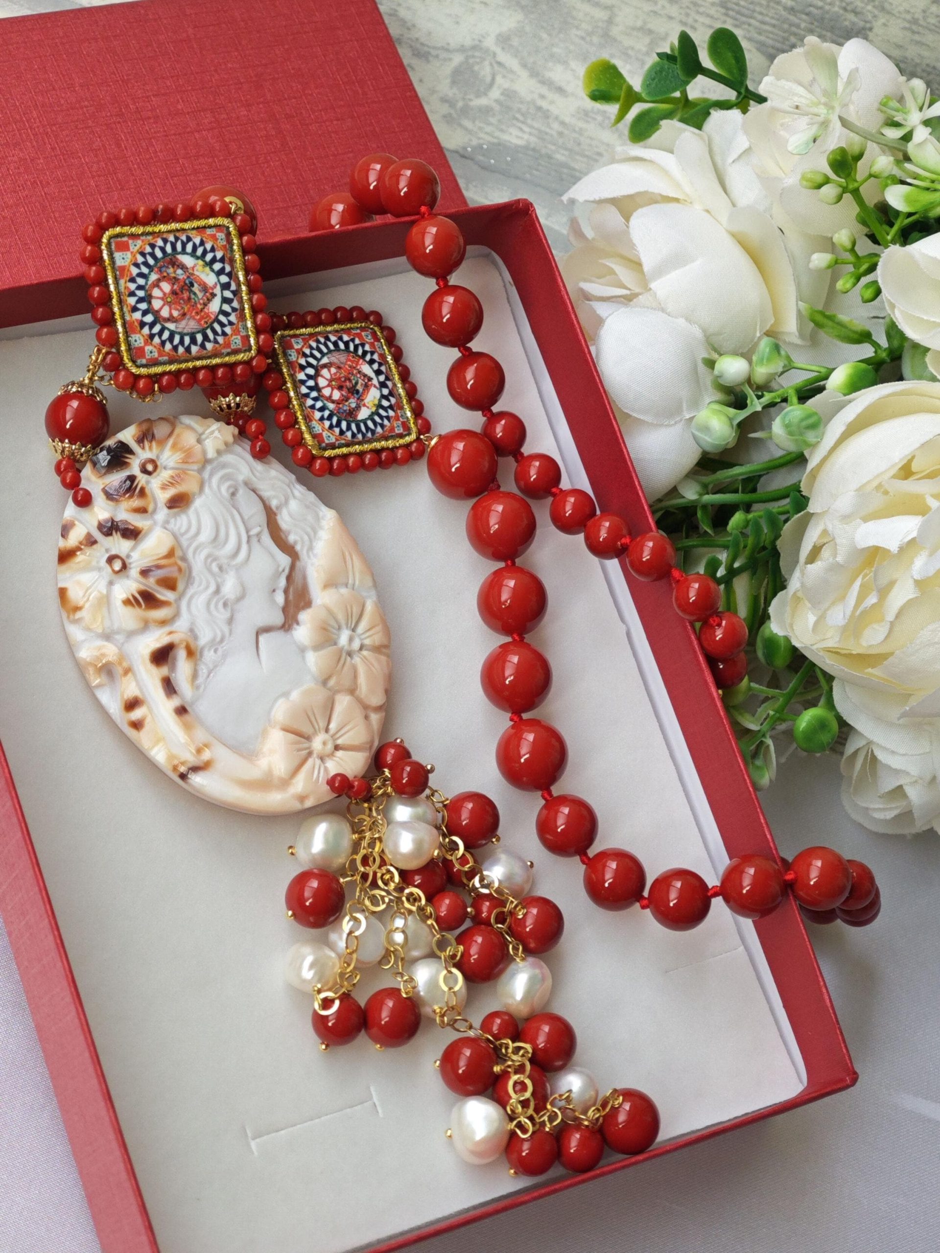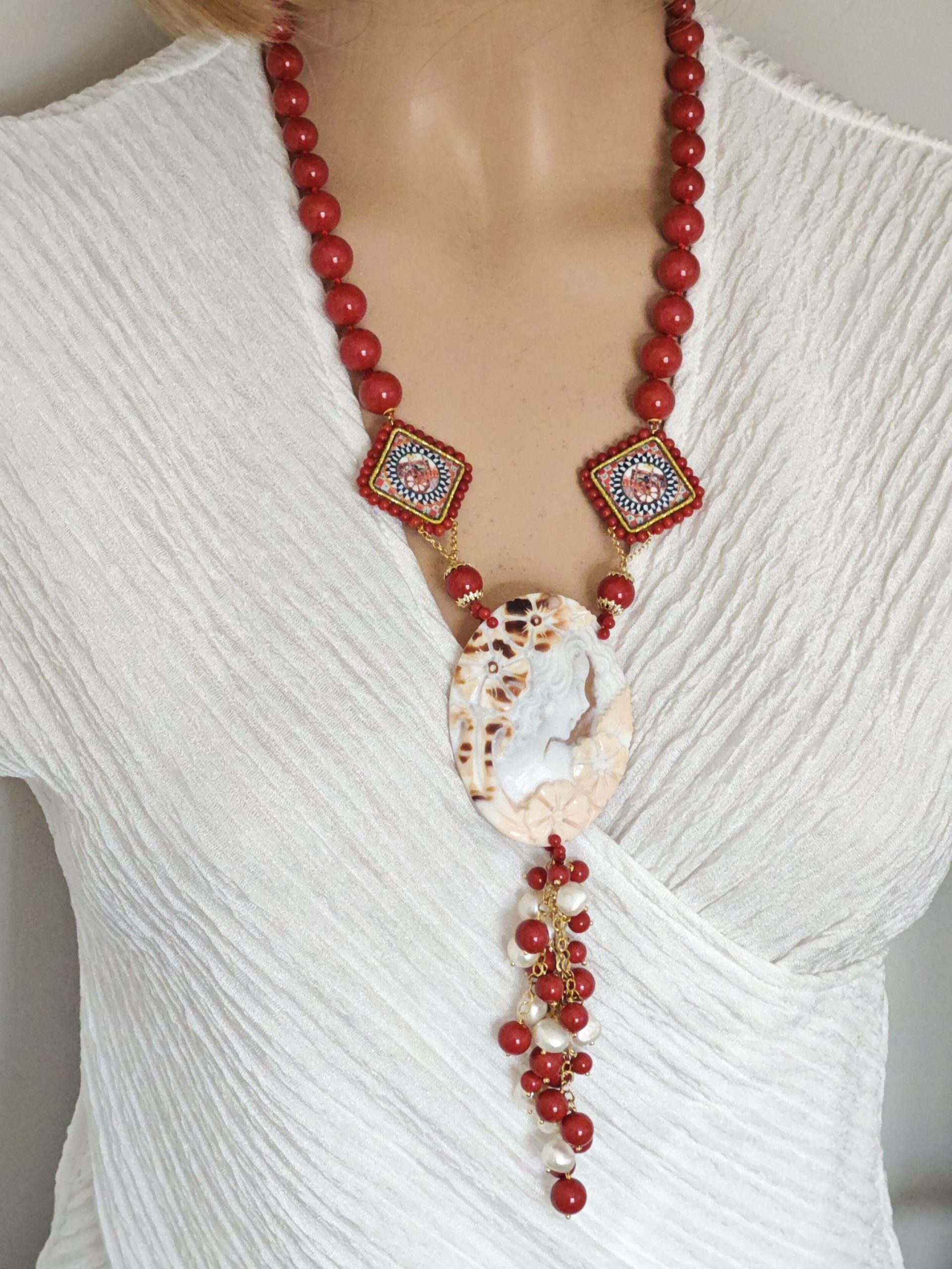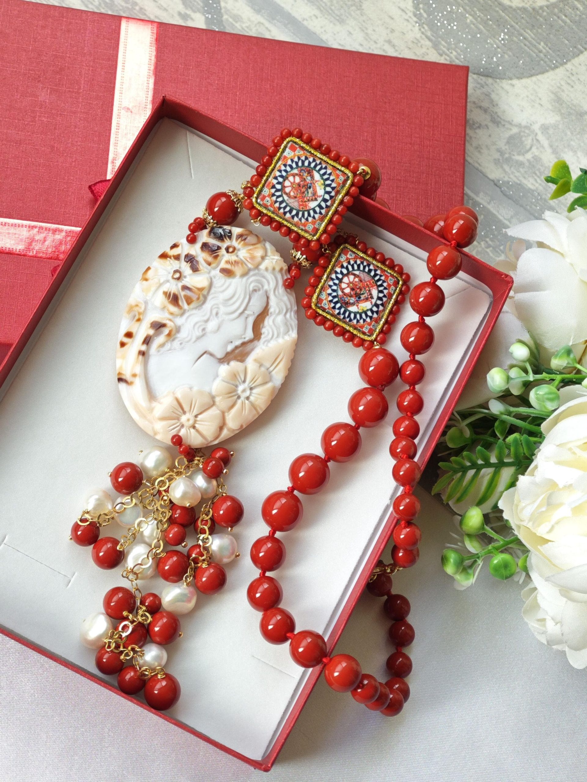 Collana cammeo conchiglia sardonica, piastrelle ceramica Caltagirone e perle pasta di corallo rosso , gioielli italiani