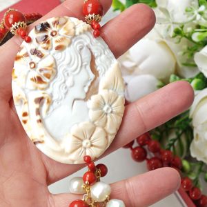 Collana con perle pasta di corallo rosso imitazione annodate a mano con cammeo autentico in conchiglia sardonica scolpita a mano a Torre del greco 7×5 cm dimensioni raffigurante volto di donna, pendente in argento 925 placcato oro con perle bianche naturali e perle pasta di corallo rosso e con 2 piastrelle in pietra lavica smaltata con motivi Caltagirone con cornice perline rosse 2×2 cm dimensioni .