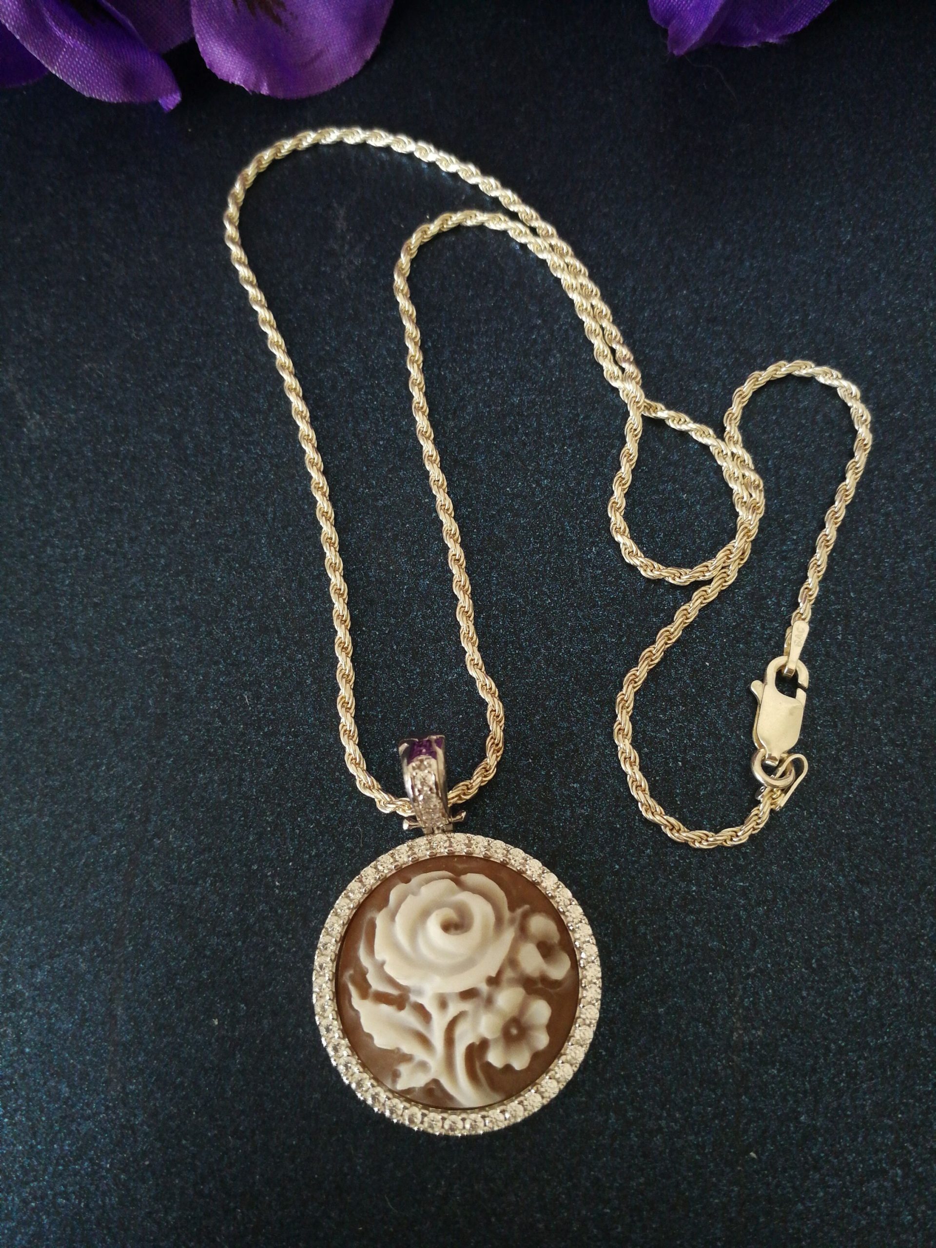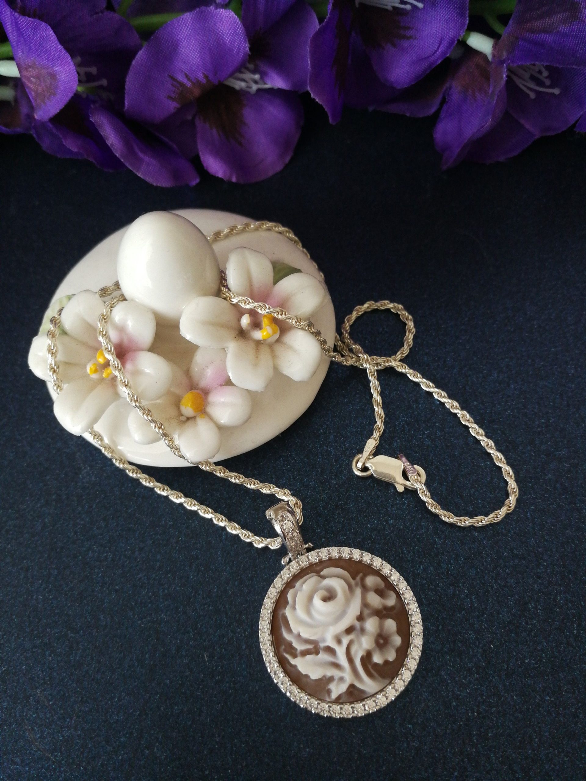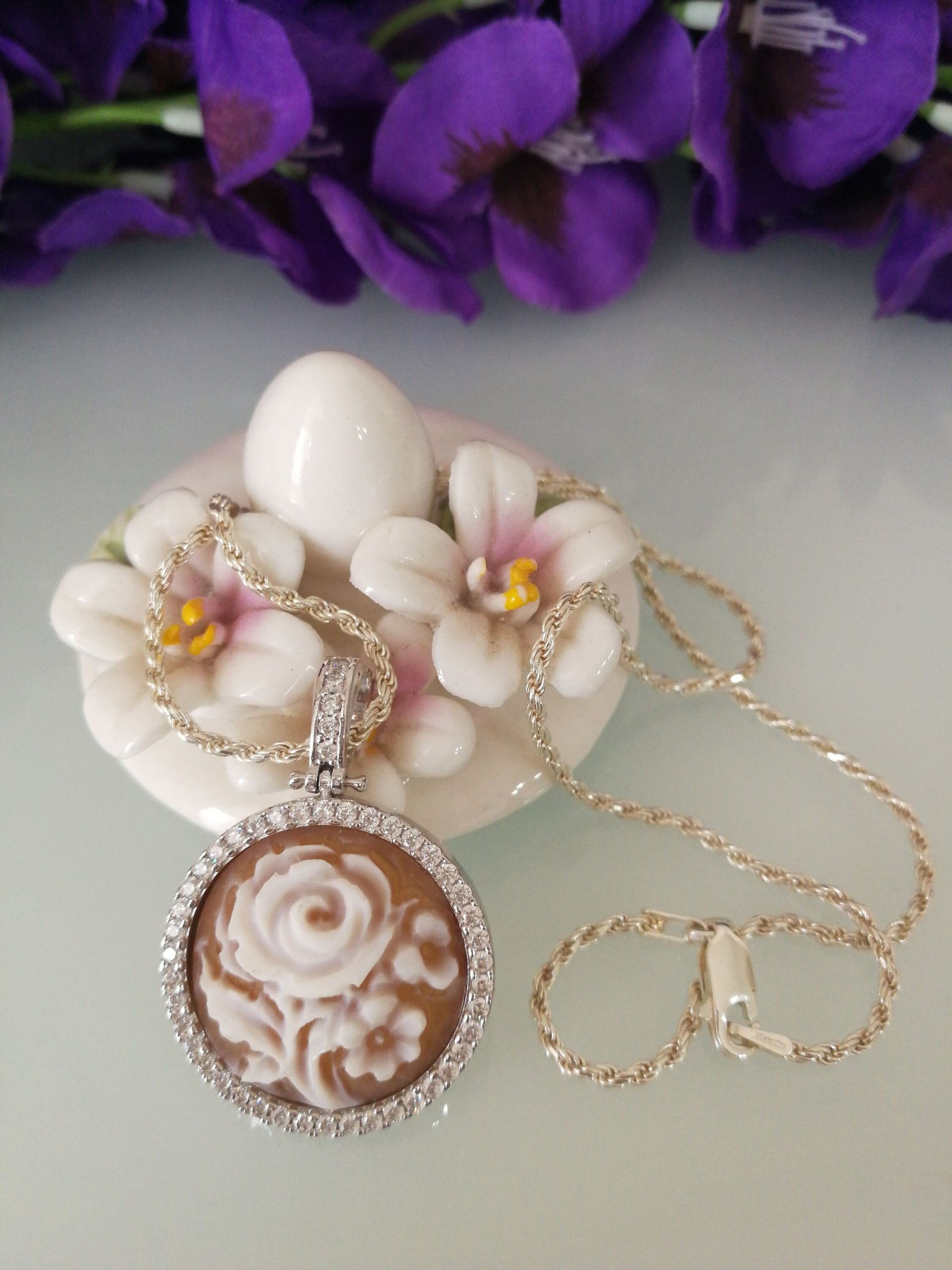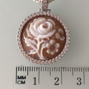 Collana esclusiva girocollo con ciondolo cammeo conchiglia originale di Torre del Greco Italia raffigura fiore di rosa incastonato su montatura in argento , contornato da piccoli zirconi bianchi.Gancio in argento 925 con zirconi bianchi. Catenina in argento 925 . Misura cammeo diametro 2,5 cm.Lunghezza collana 40 cm.