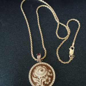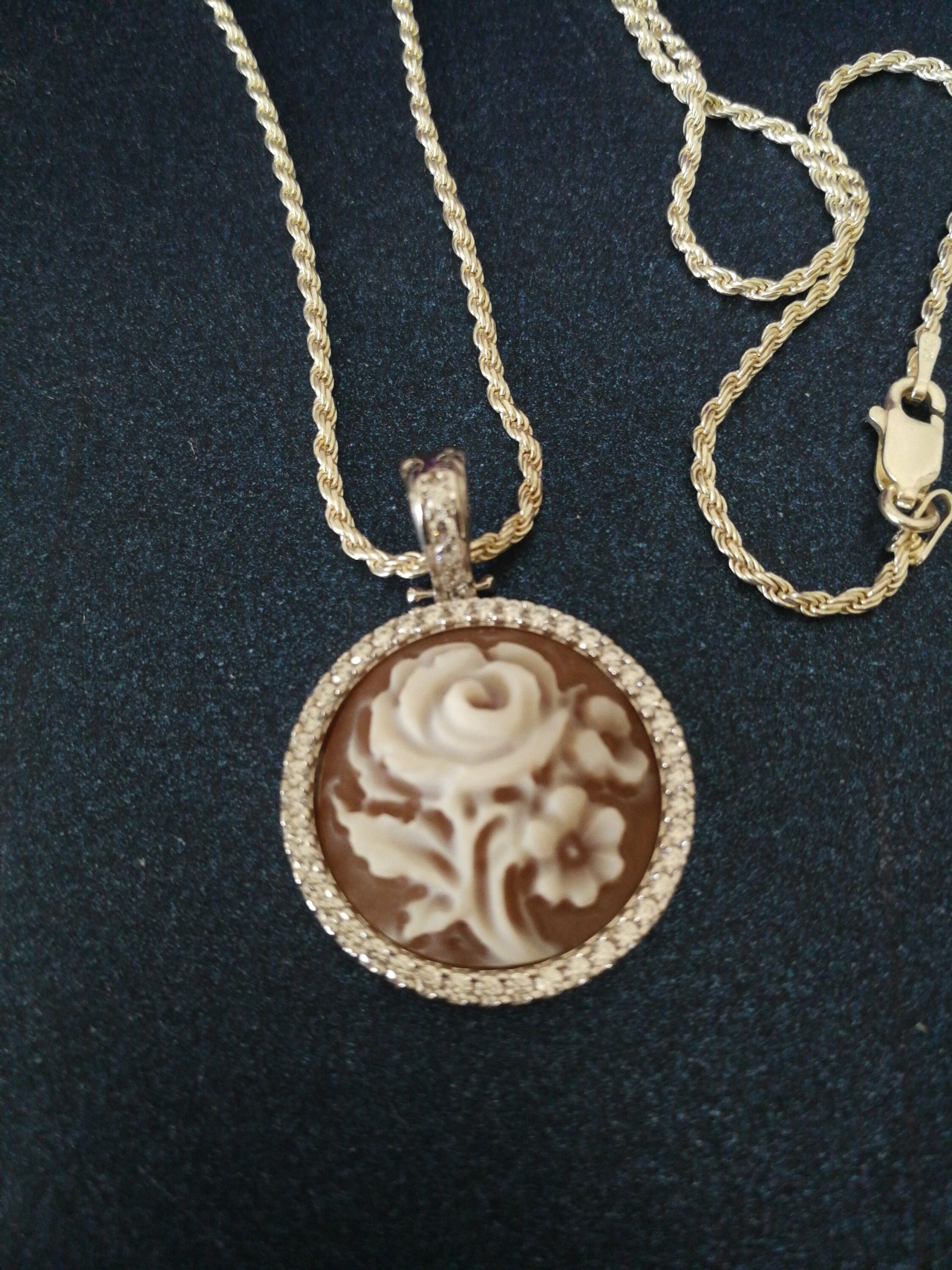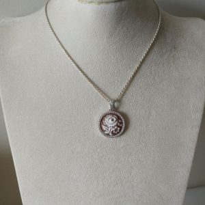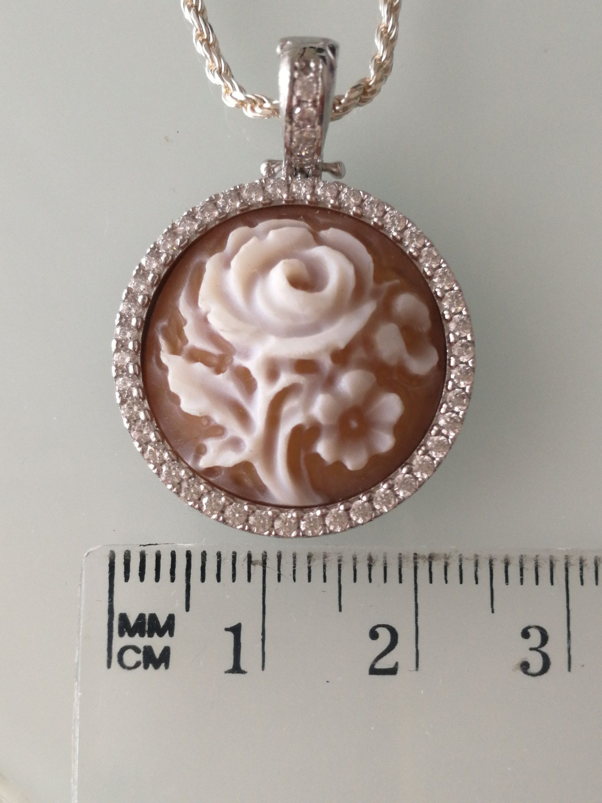 Collana esclusiva girocollo con ciondolo cammeo conchiglia originale di Torre del Greco Italia raffigura fiore di rosa incastonato su montatura in argento , contornato da piccoli zirconi bianchi.Gancio in argento 925 con zirconi bianchi. Catenina in argento 925 . Misura cammeo diametro 2,5 cm.Lunghezza collana 40 cm.