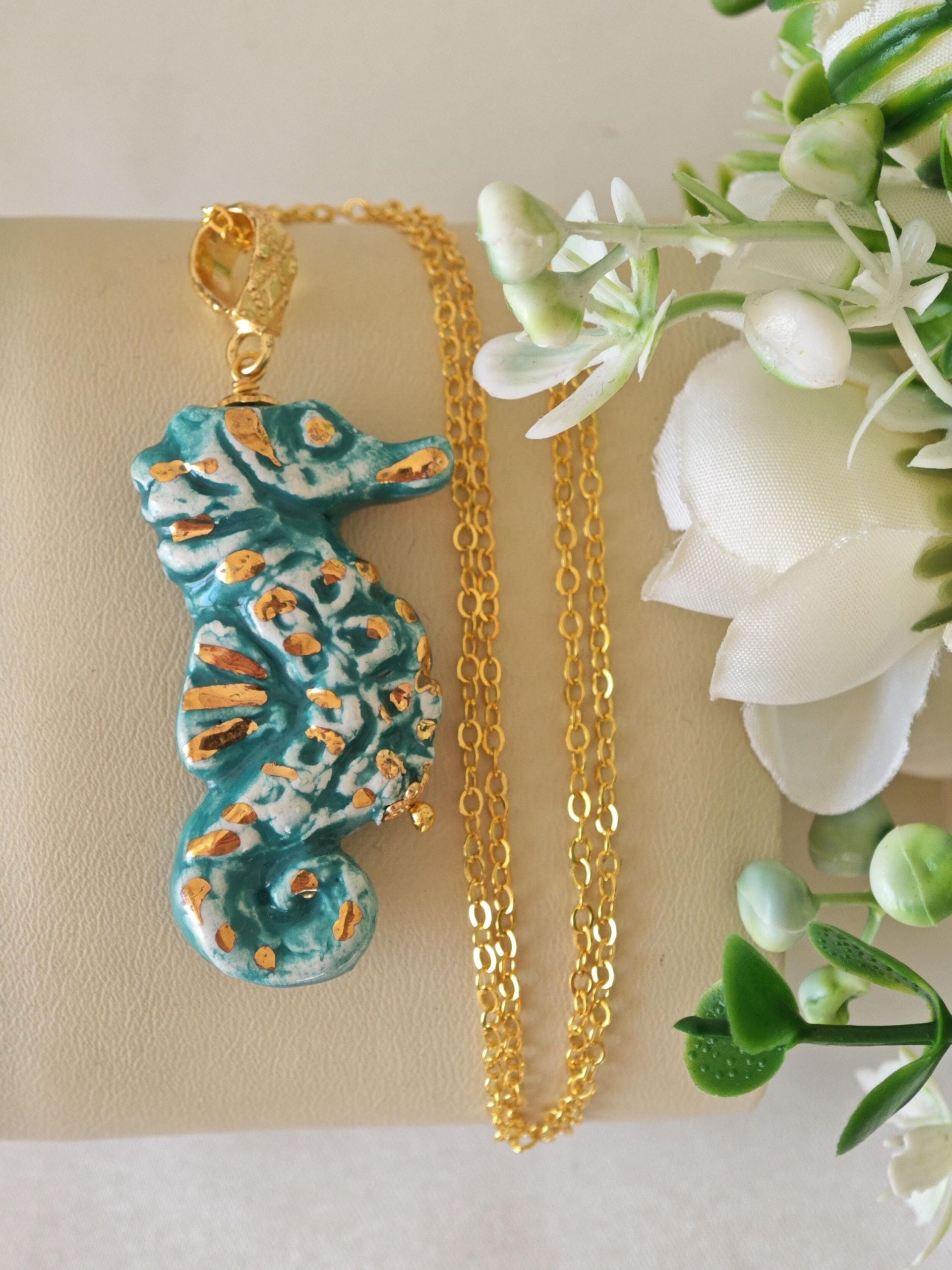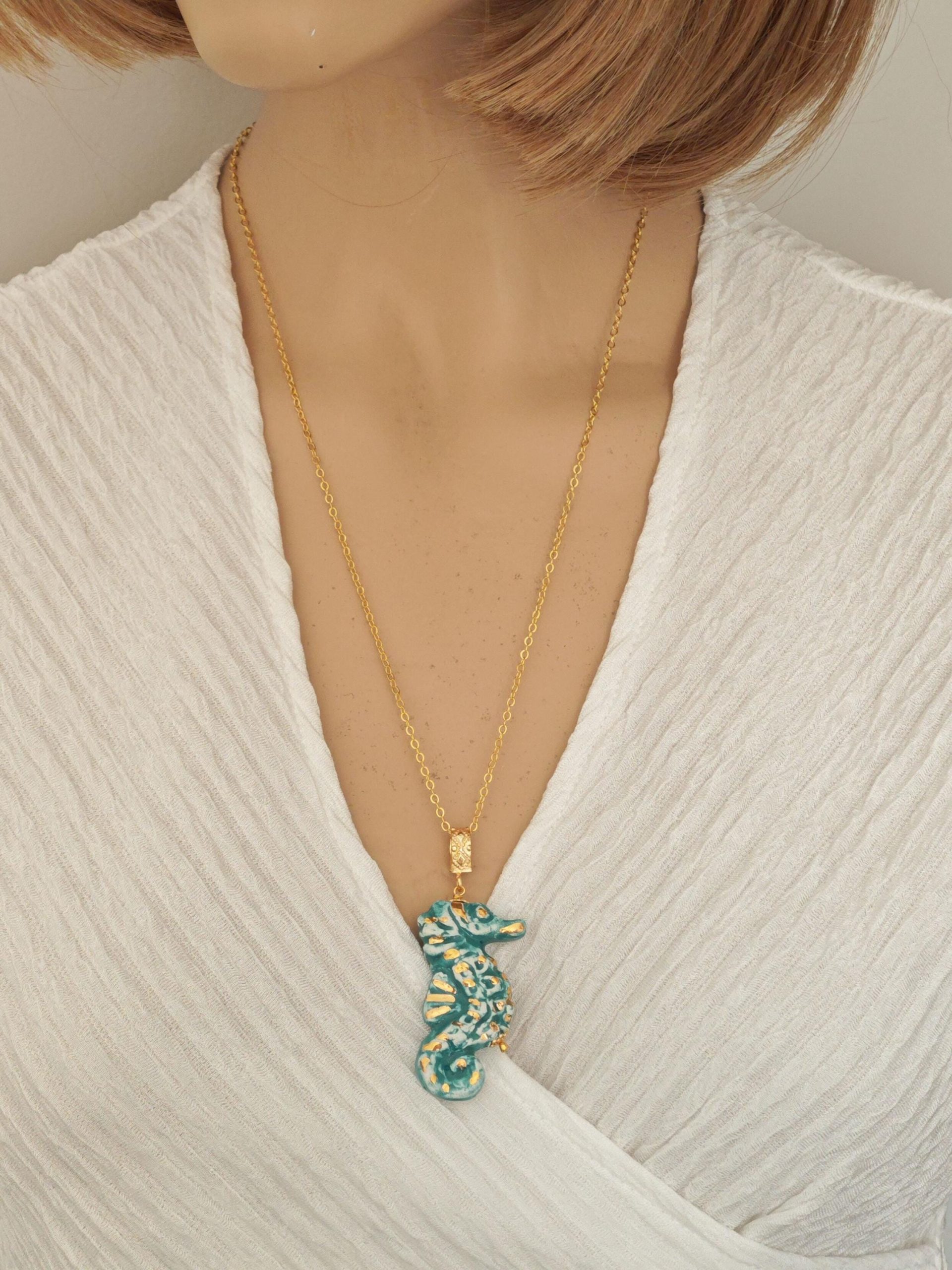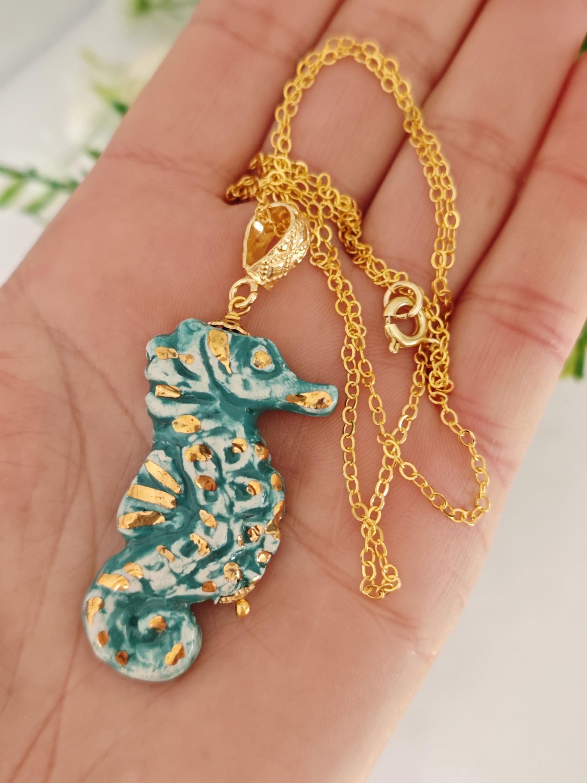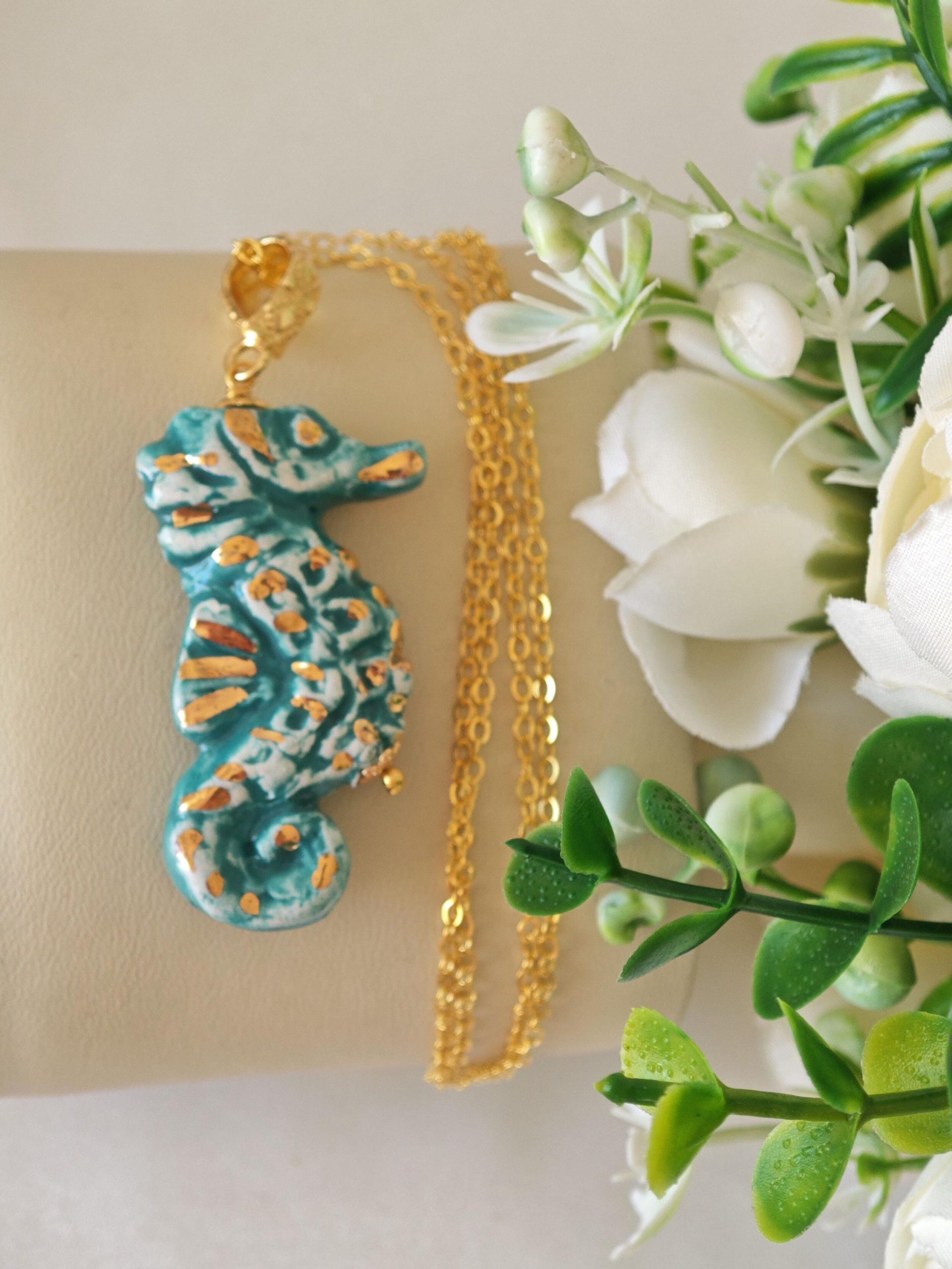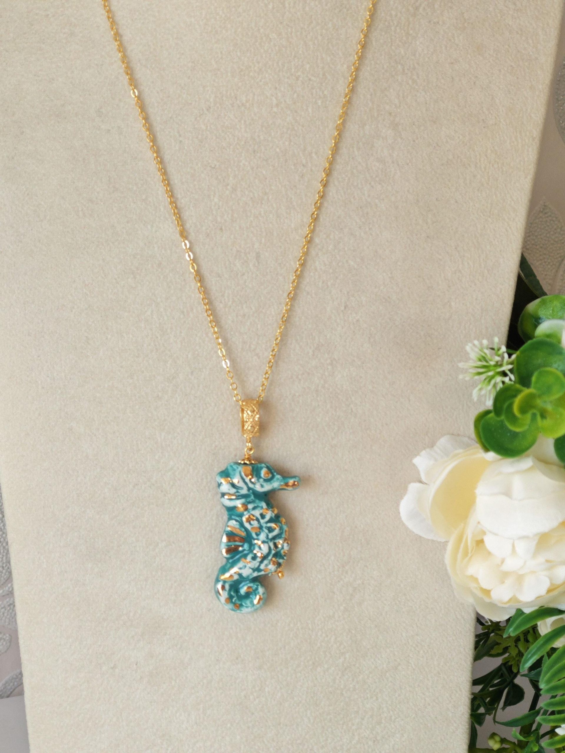 Collana girocollo realizzata con catena acciaio dorato e pendente cavalluccio marino in ceramica di Caltagirone realizzata a mano con applicazioni foglia oro 22kt, 4,5 cm dimensioni, chiusura a moschettone in ottone dorato , lunghezza totale collana 50 cm.