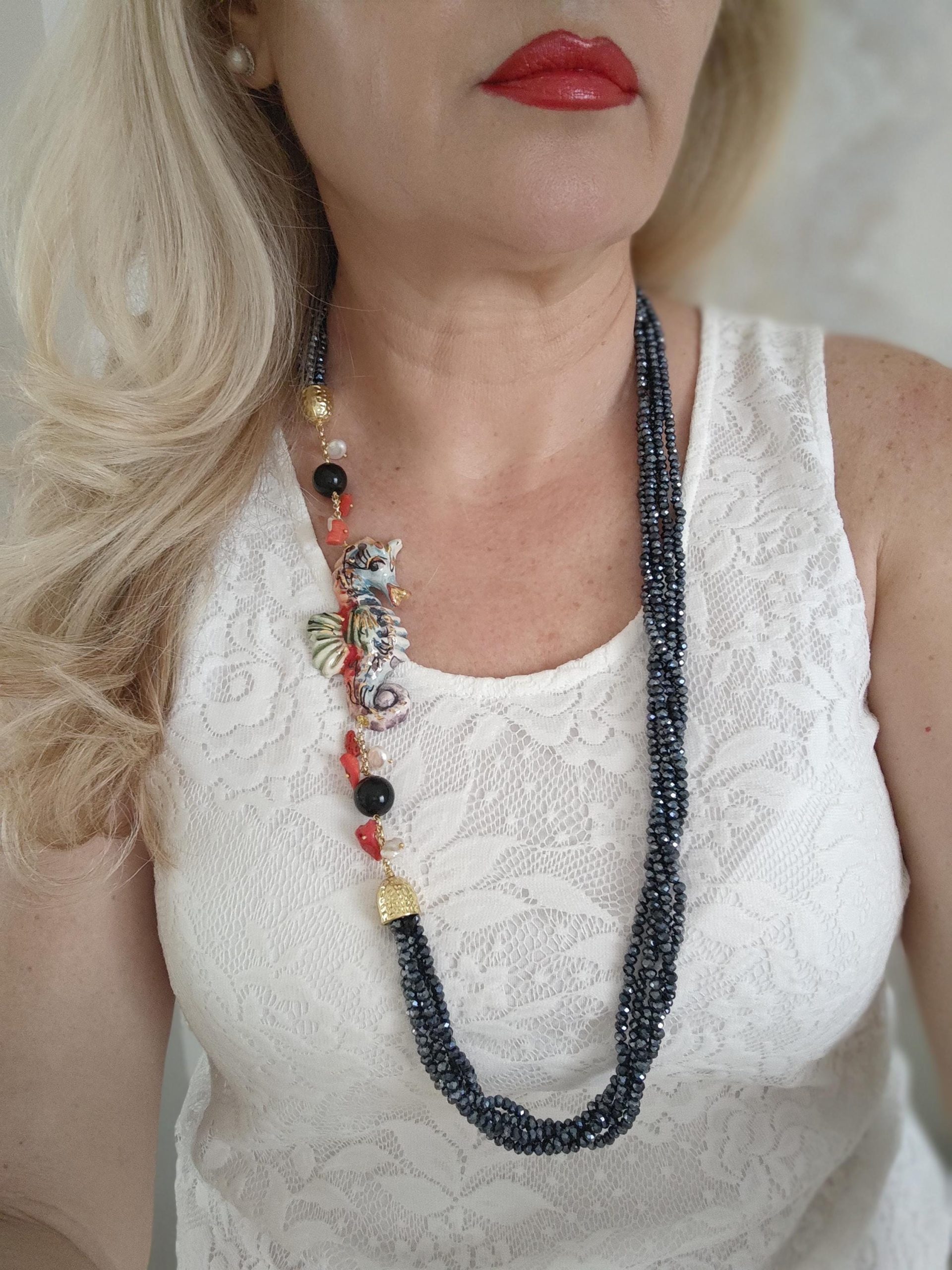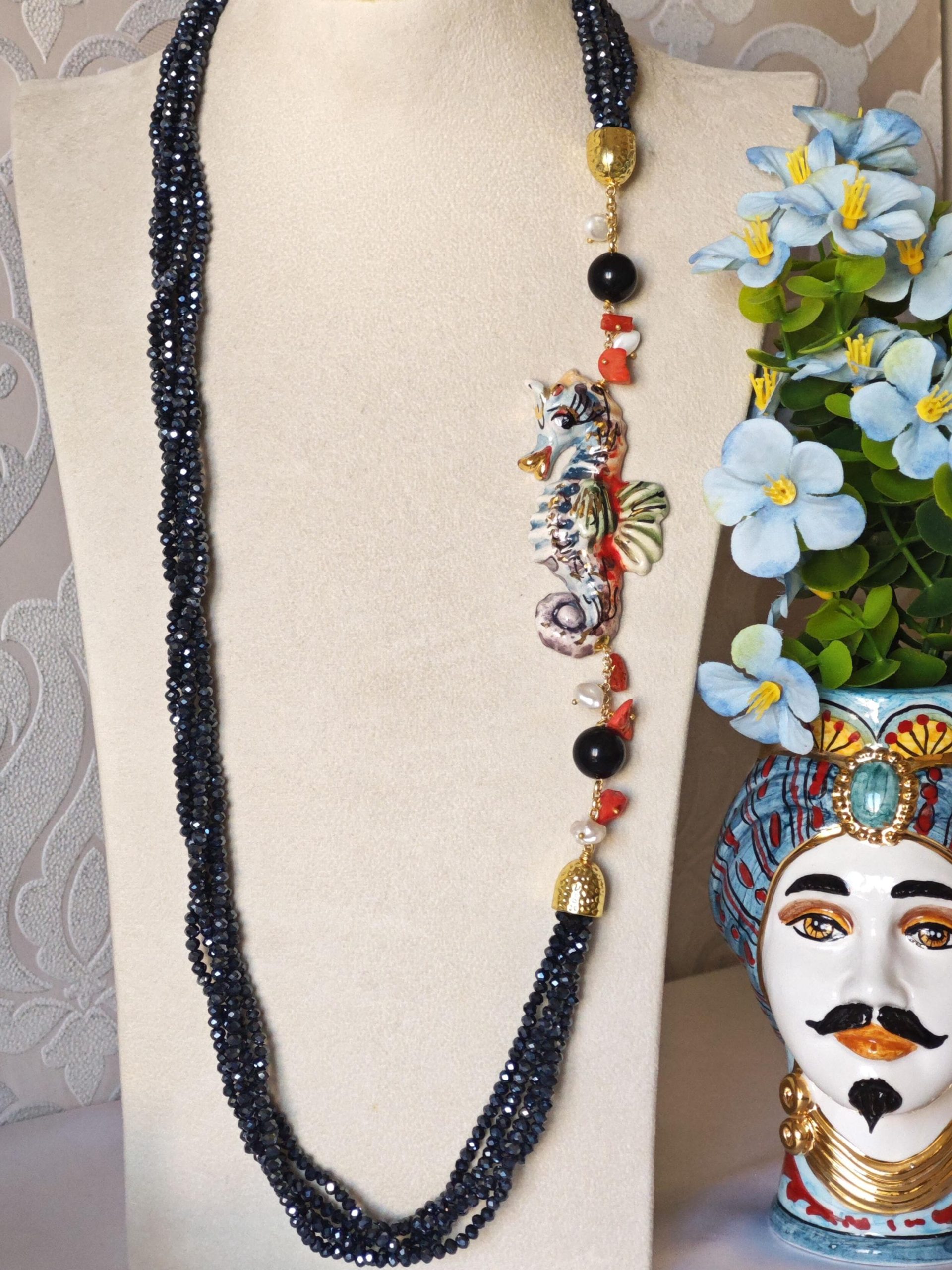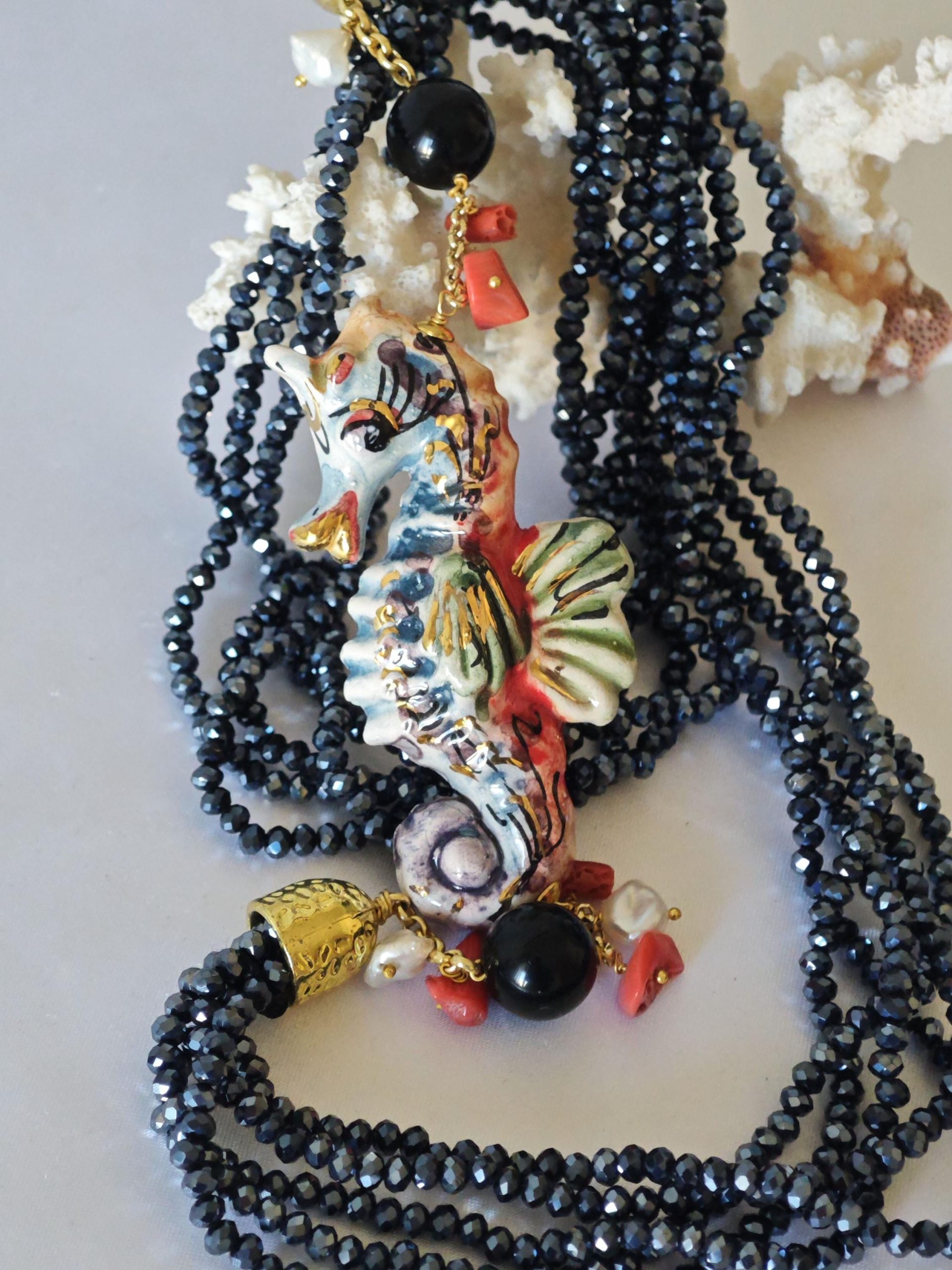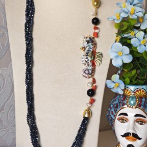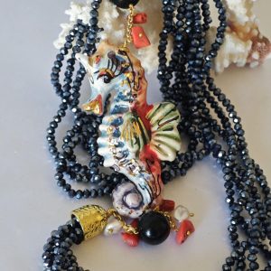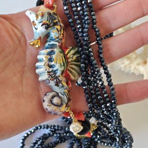 Collana cavalluccio marino in ceramica di Caltagirone, collana multifilo cristalli blu, collana siciliana