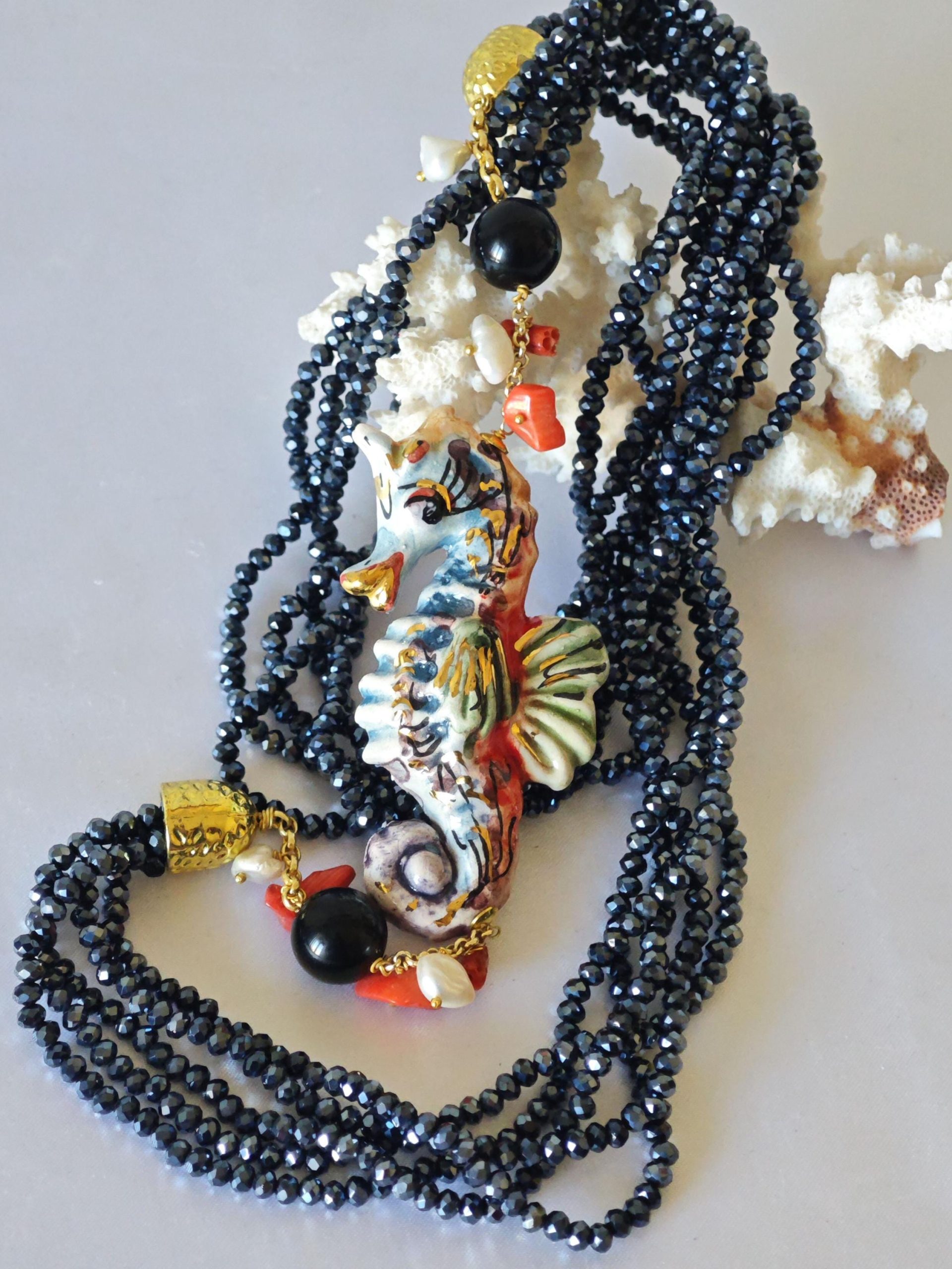 Collana artigianale realizzato con 5 fili cristalli blu notte, perle bianche e corallo rosso mediterraneo naturale con cavalluccio marino in ceramica di Caltagirone realizzata e dipinta a mano 7 cm dimensioni , lunghezza totale collana 80 cm.