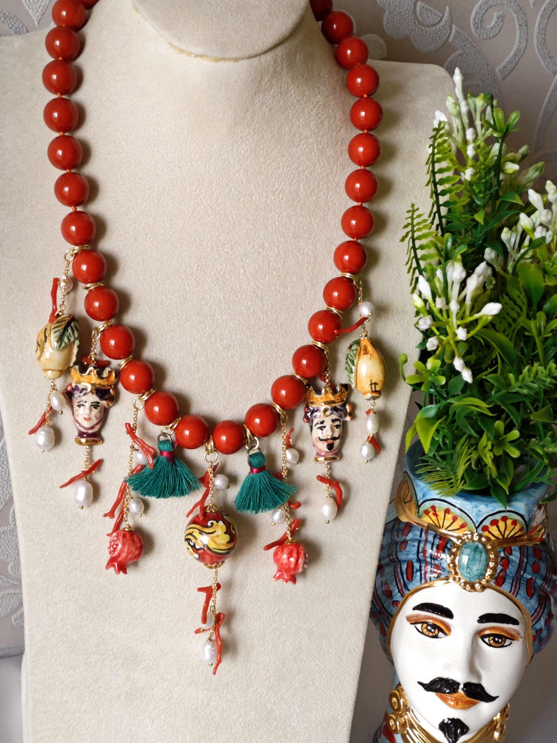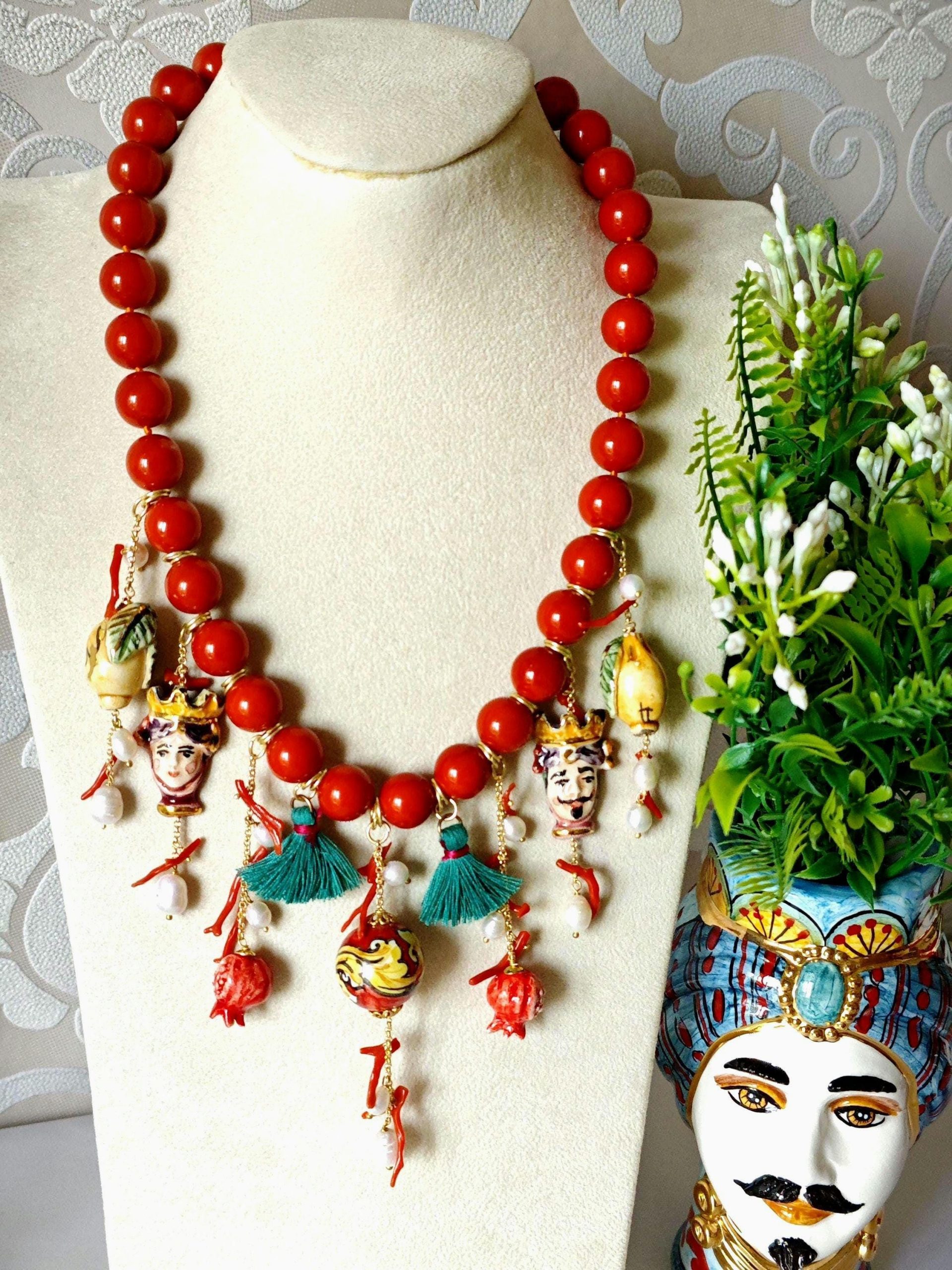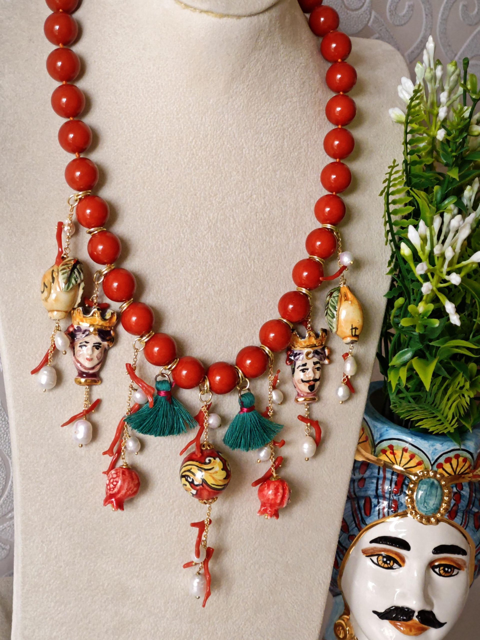 Collana ceramica Caltagirone, collana perle pasta di corallo, rametti corallo naturale e perle bianche , collana siciliana