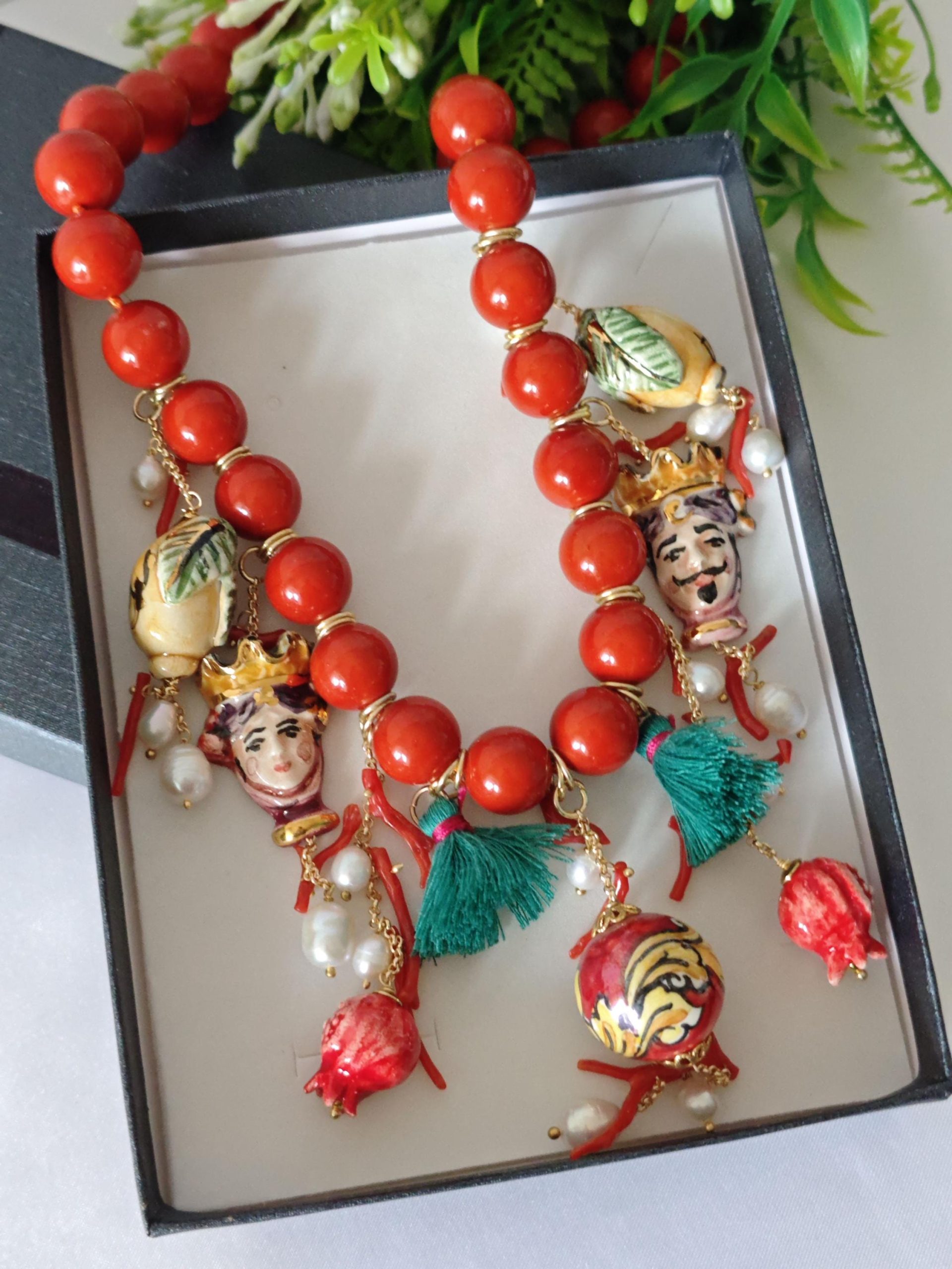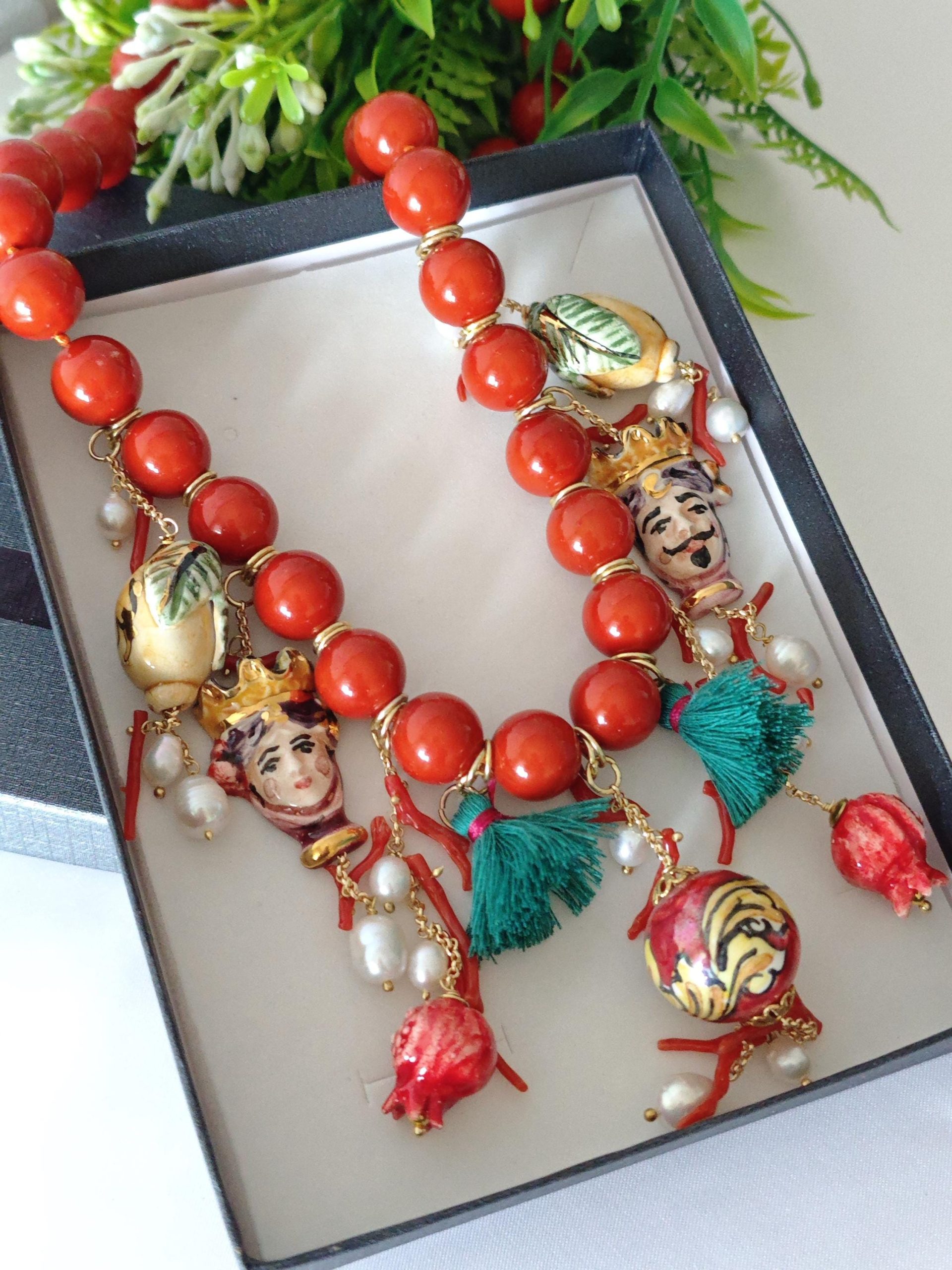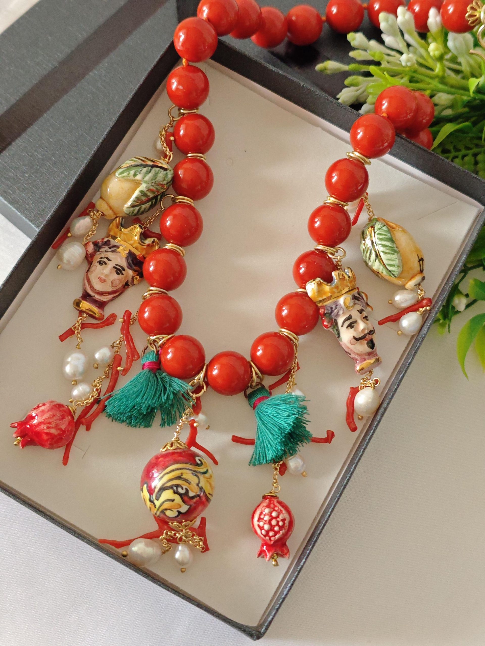 Collana ceramica Caltagirone, collana perle pasta di corallo, rametti corallo naturale e perle bianche , collana siciliana