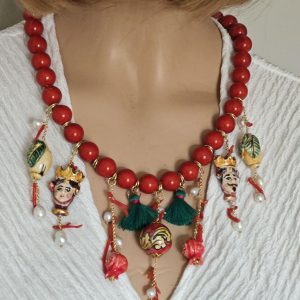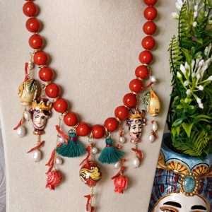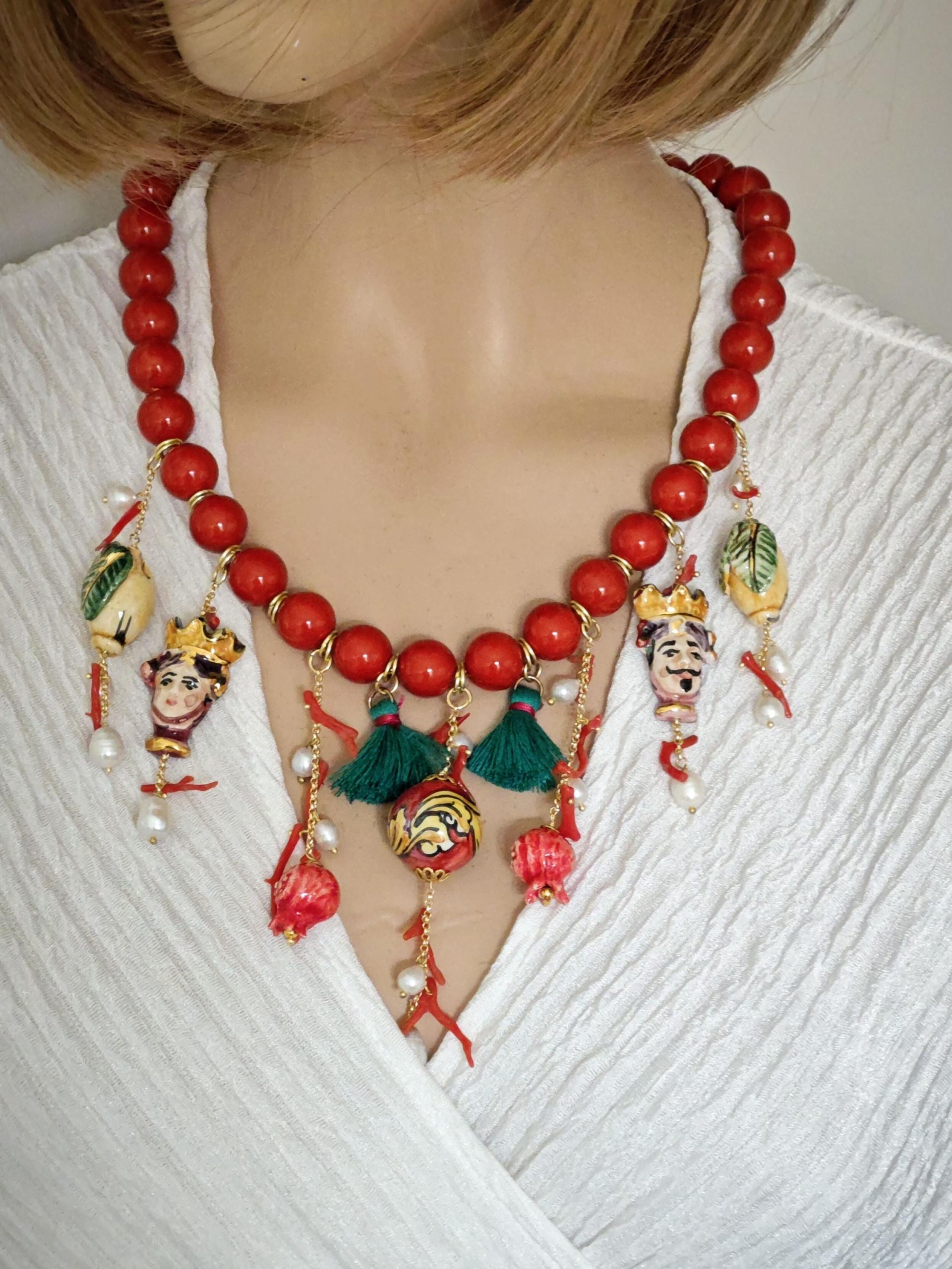 Collana maxi con perle pasta di corallo rosso imitazione 14 mm annodate a mano decorata con 2 ciondoli teste di moro siciliano ,2 limoni ,2 melograni e una perla in ceramica di Caltagirone realizzata e dipinta a mano con applicazioni foglia oro 22 kt, perle bianche naturali e corallo rosso mediterraneo e nappe cotone