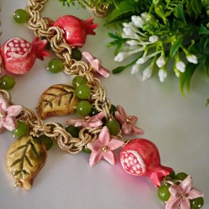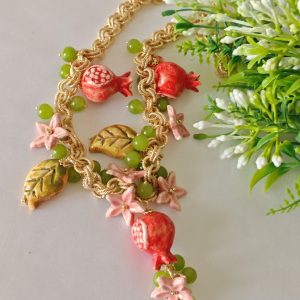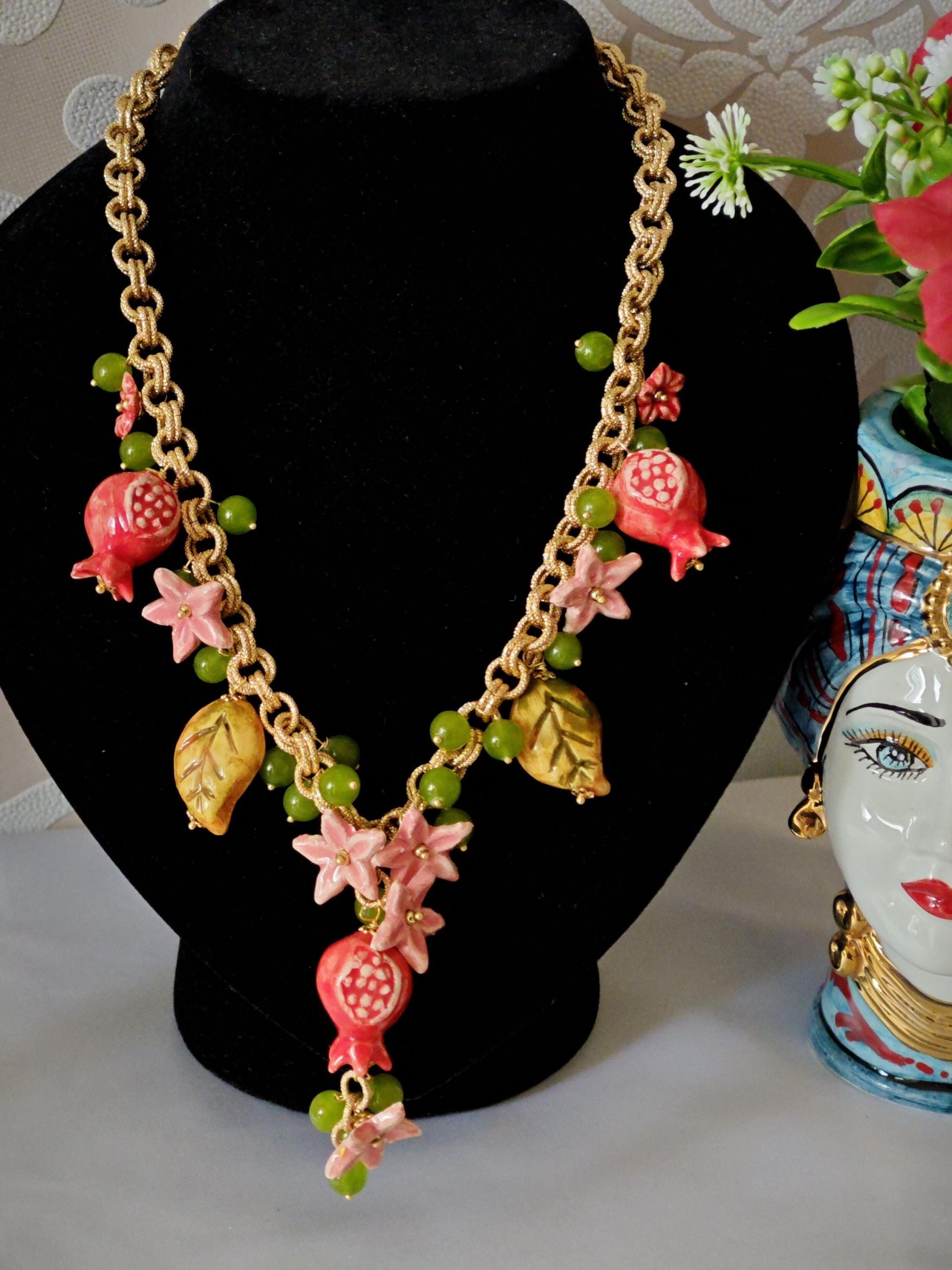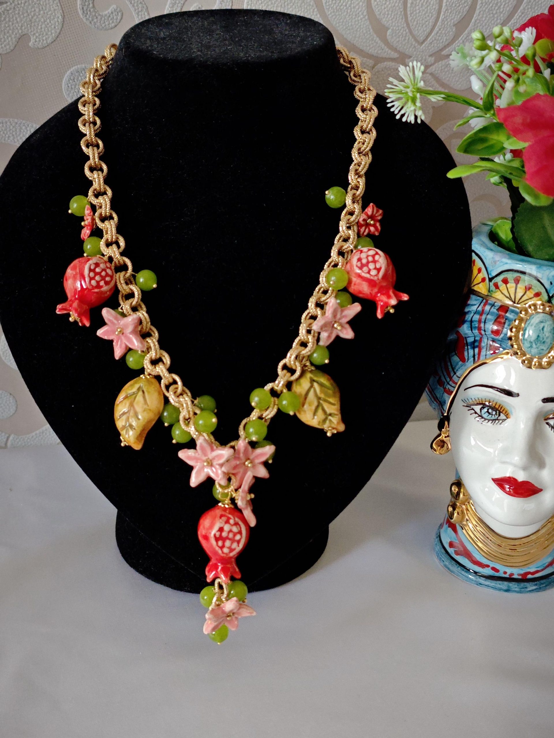 Collana ceramica Caltagirone, collana siciliana fiori e melograni con pietre dure peridoto verde
