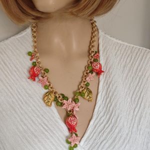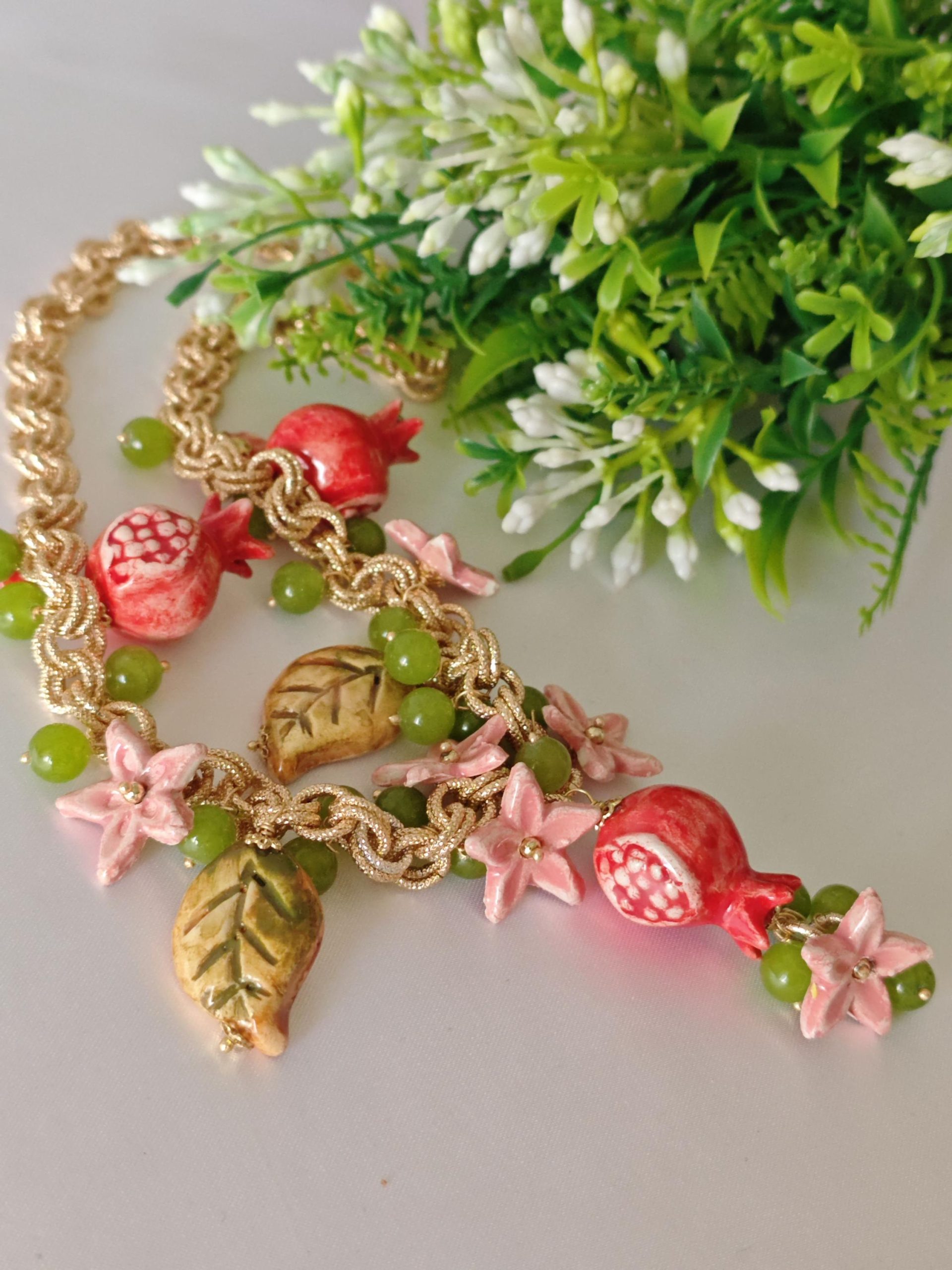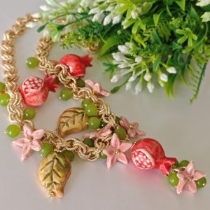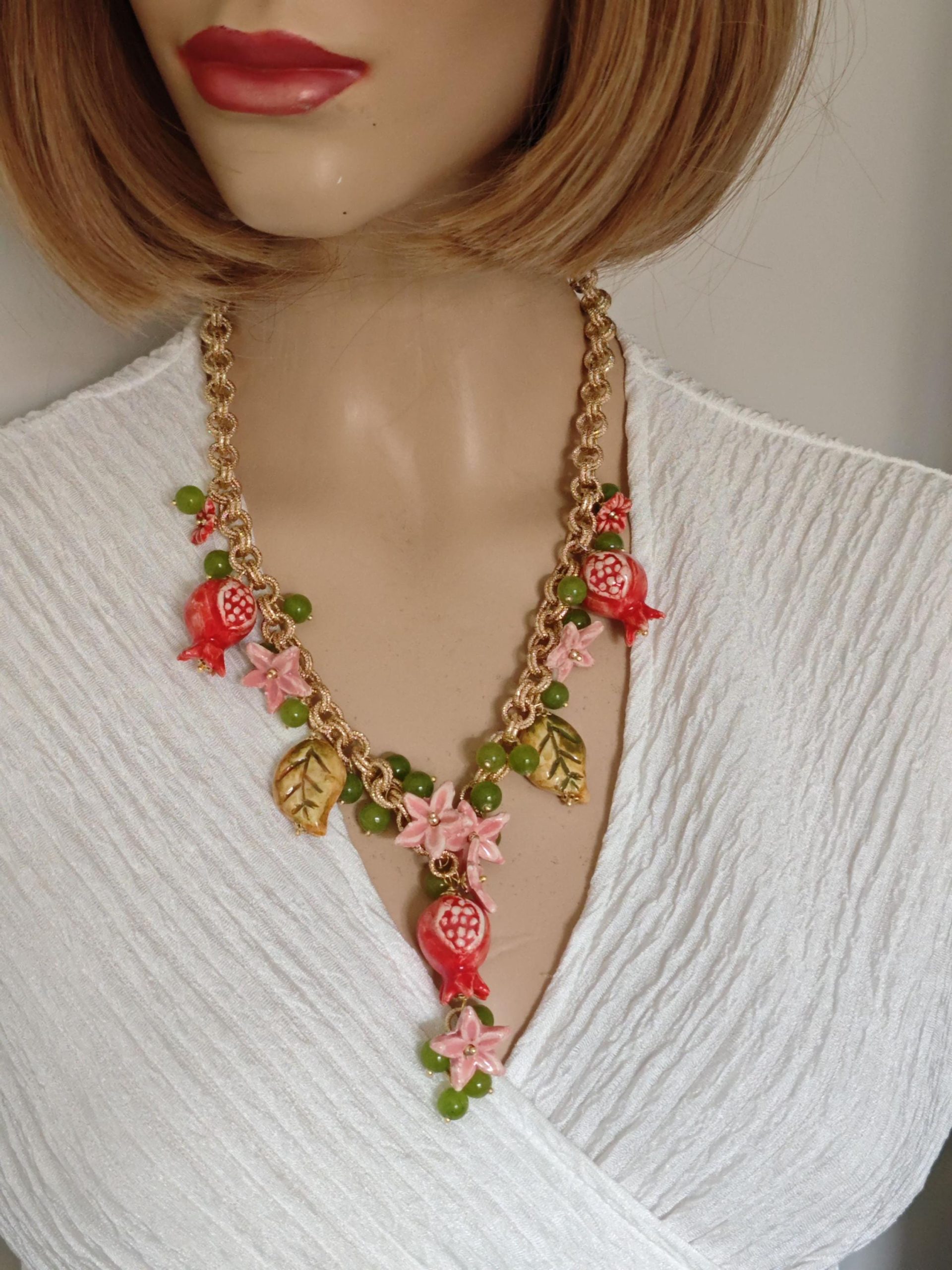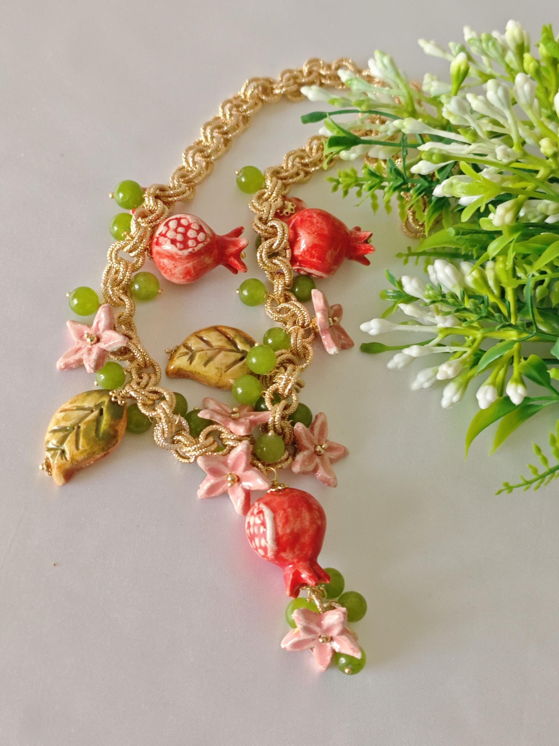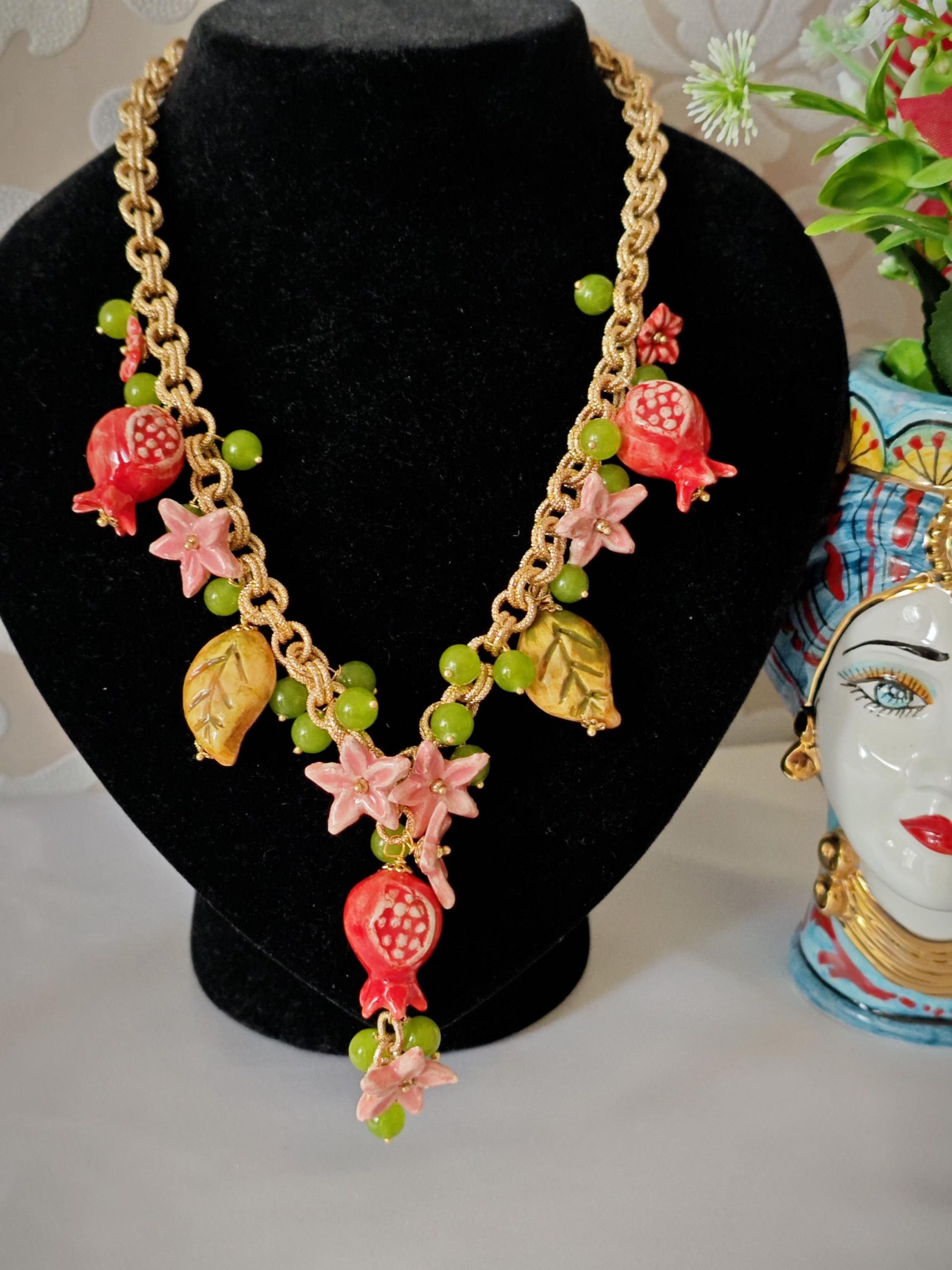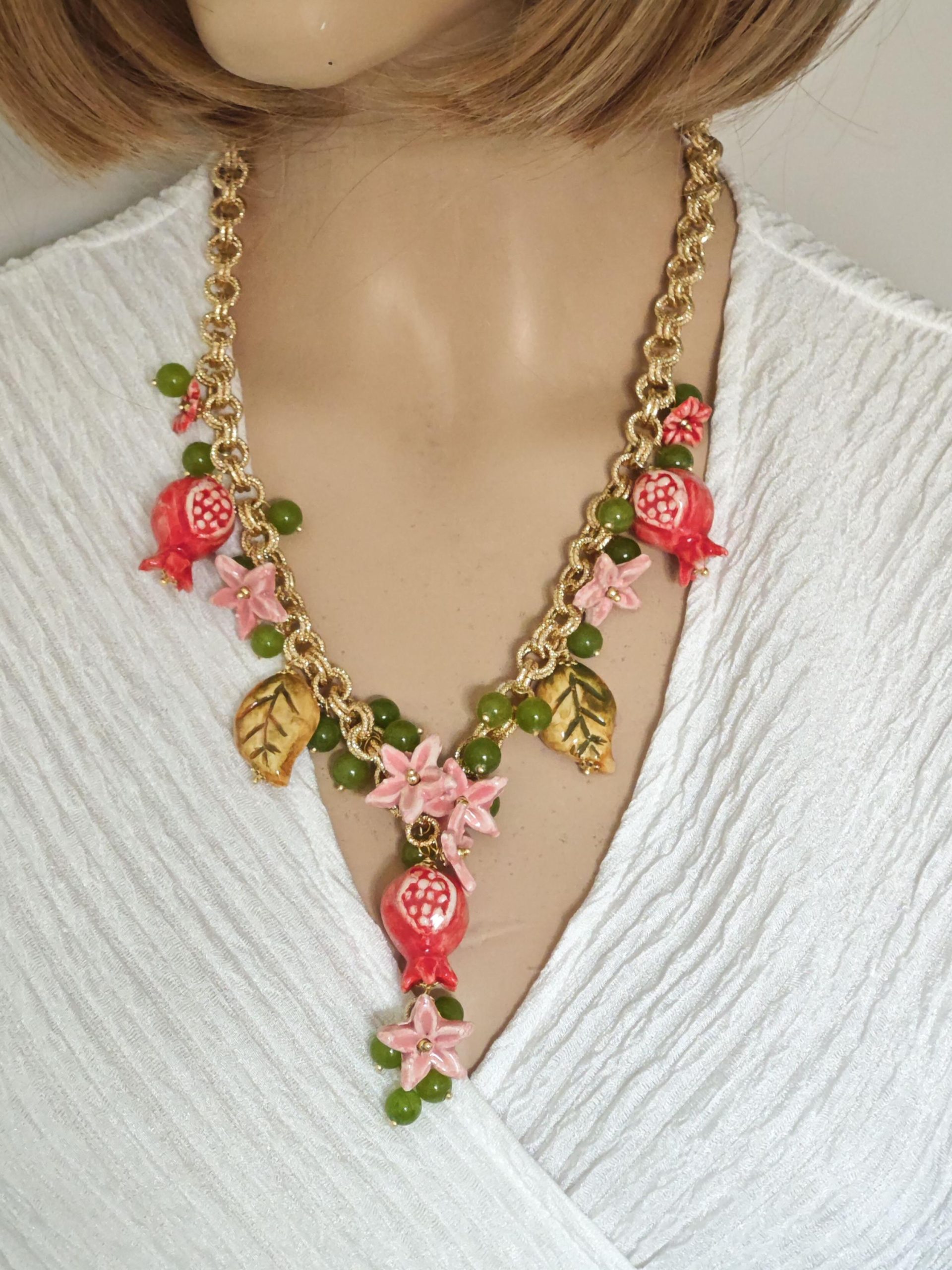 Collana girocollo realizzata con catena alluminio dorato smerigliato con pendenti melograno , foglie e fiori in ceramica di Caltagirone realizzata e dipinta a mano con applicazioni foglia oro 22kt, con pietre dure peridoto verde 10 mm , chiusura a moschettone in ottone dorato , lunghezza collana 50 cm.