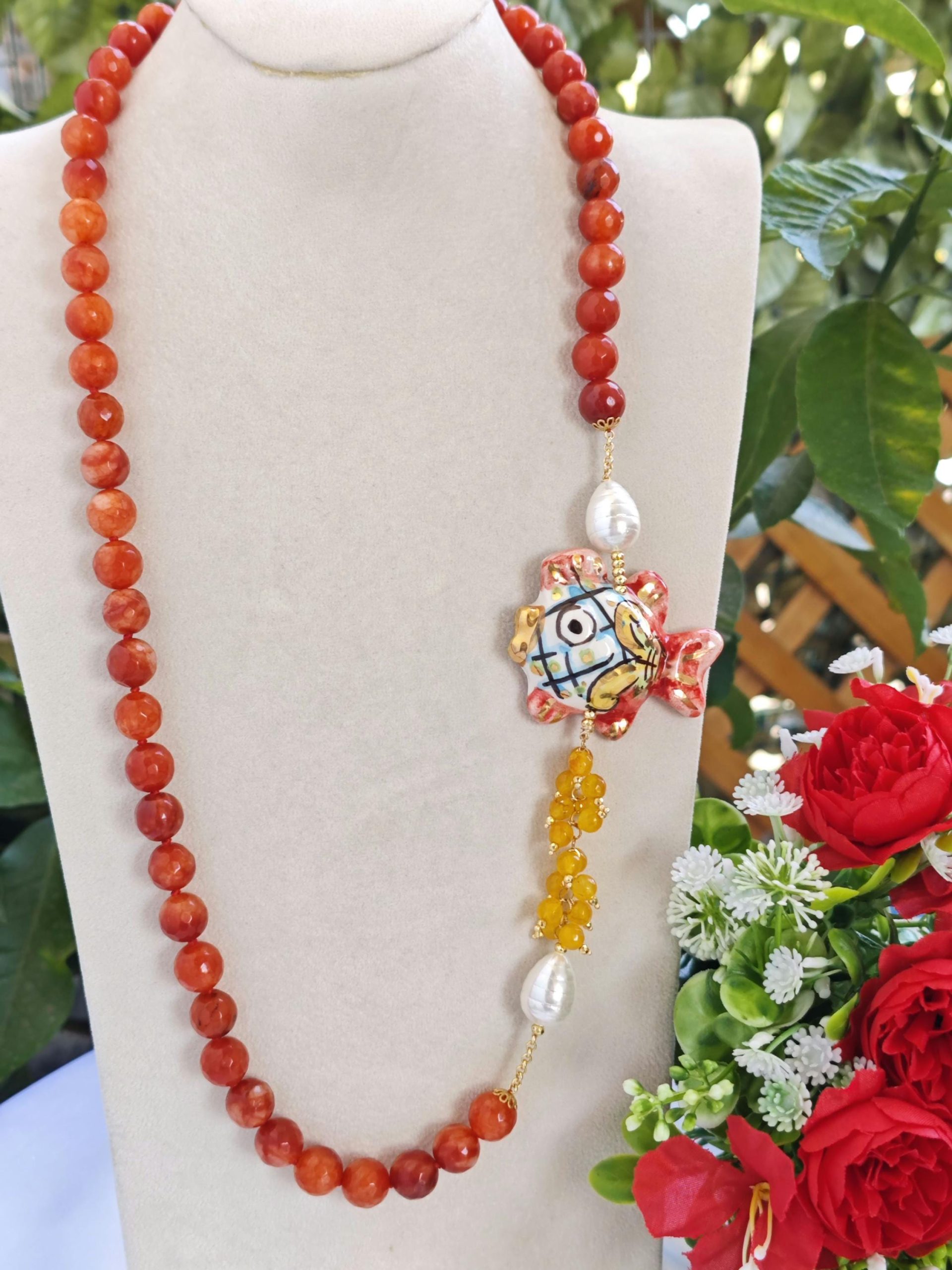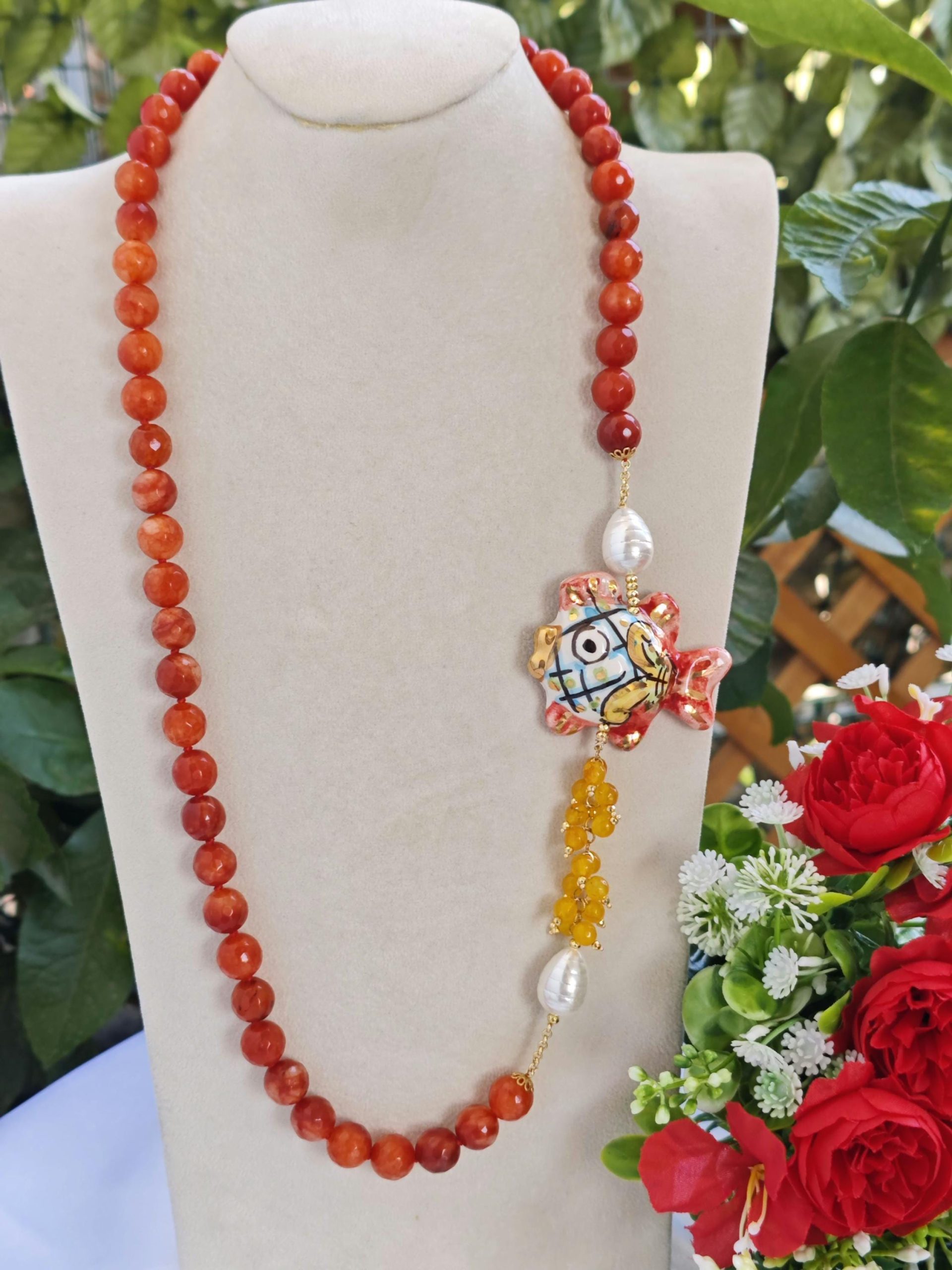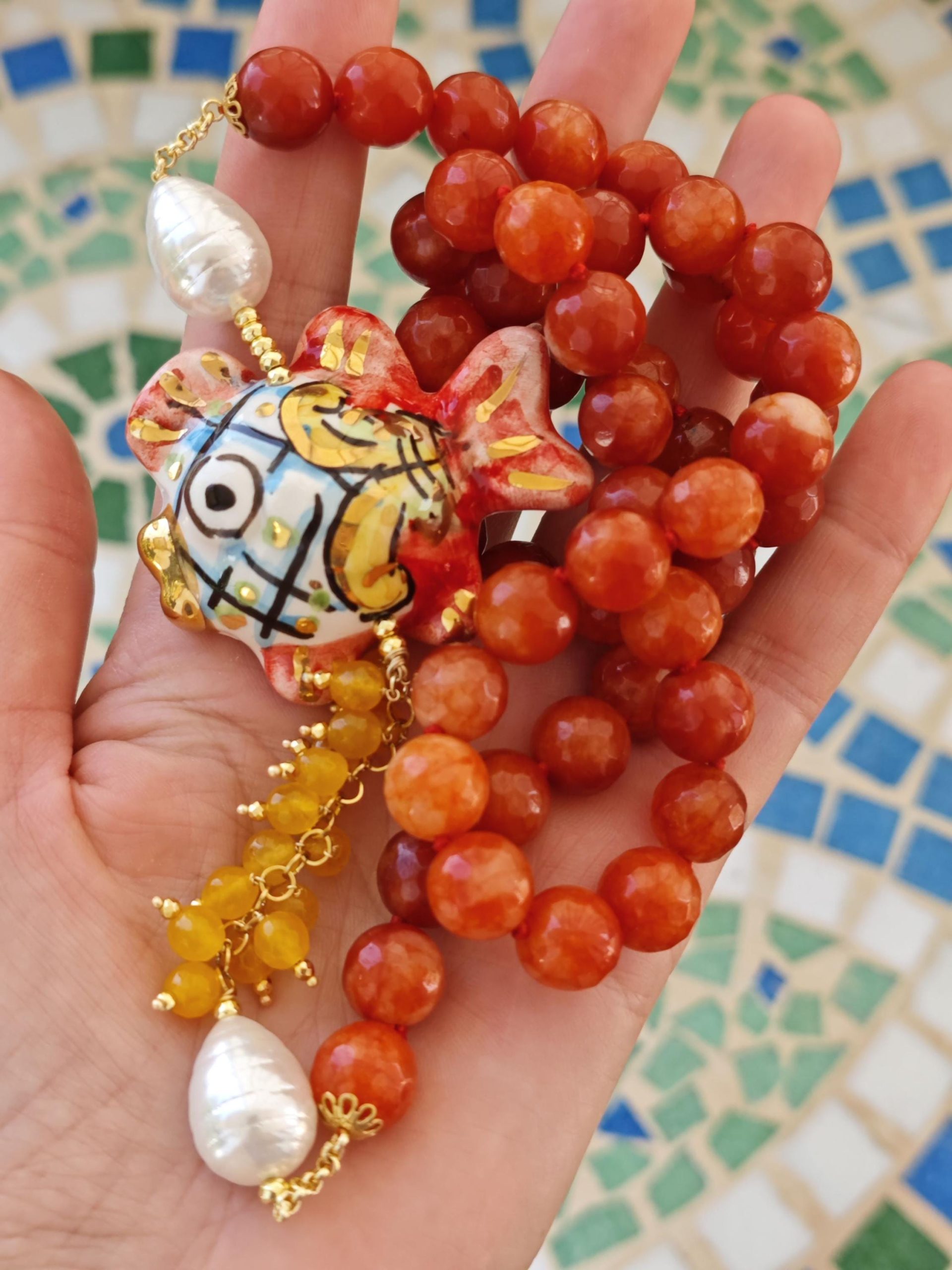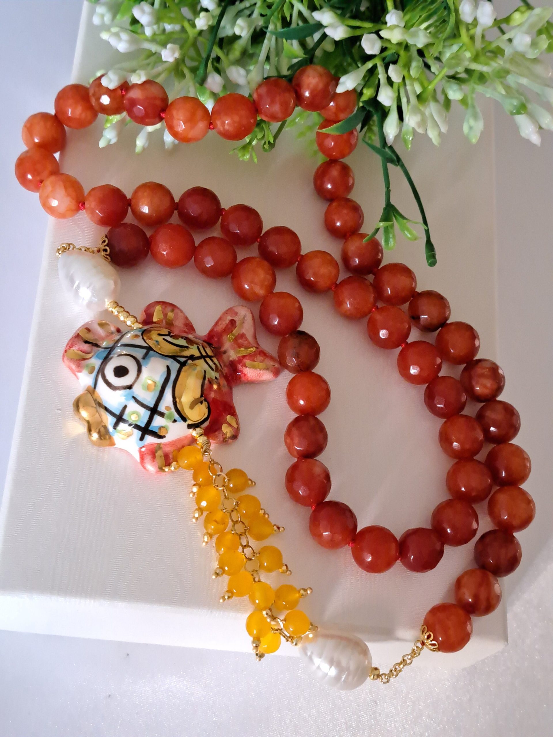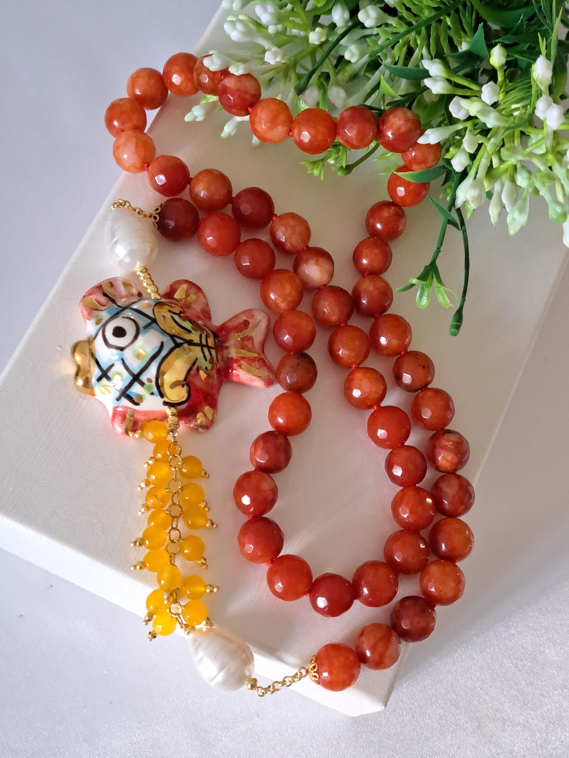 Collana annodata a mano con pietre dure sfaccettate agata arancione 12 mm ,grappolo pietre agata gialla e 2 perle bianche barocche madreperlate imitazione, e con pesciolino in ceramica di Caltagirone realizzata e dipinta a mano con applicazioni foglia oro 22 kt, 5×4 cm dimensioni, corallo rosso mediterraneo e perle naturali bianche.