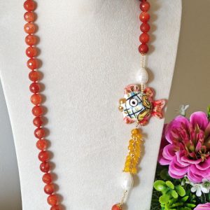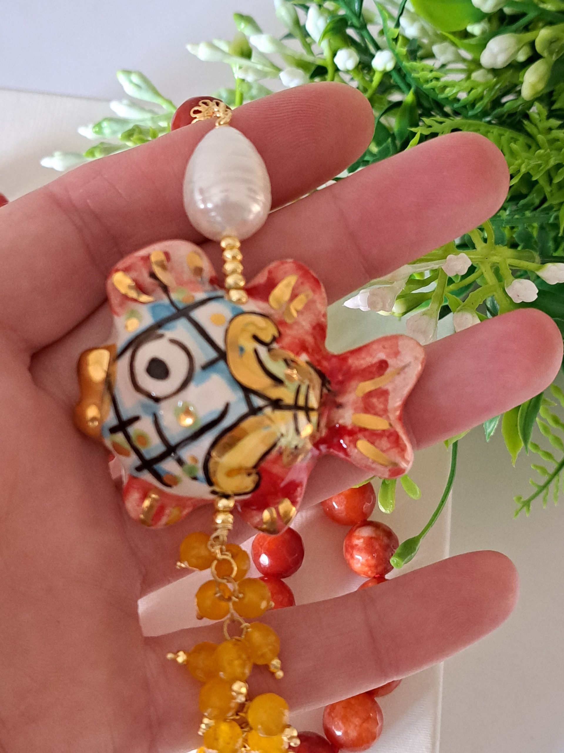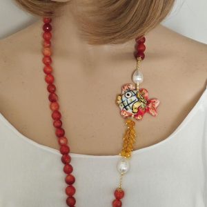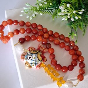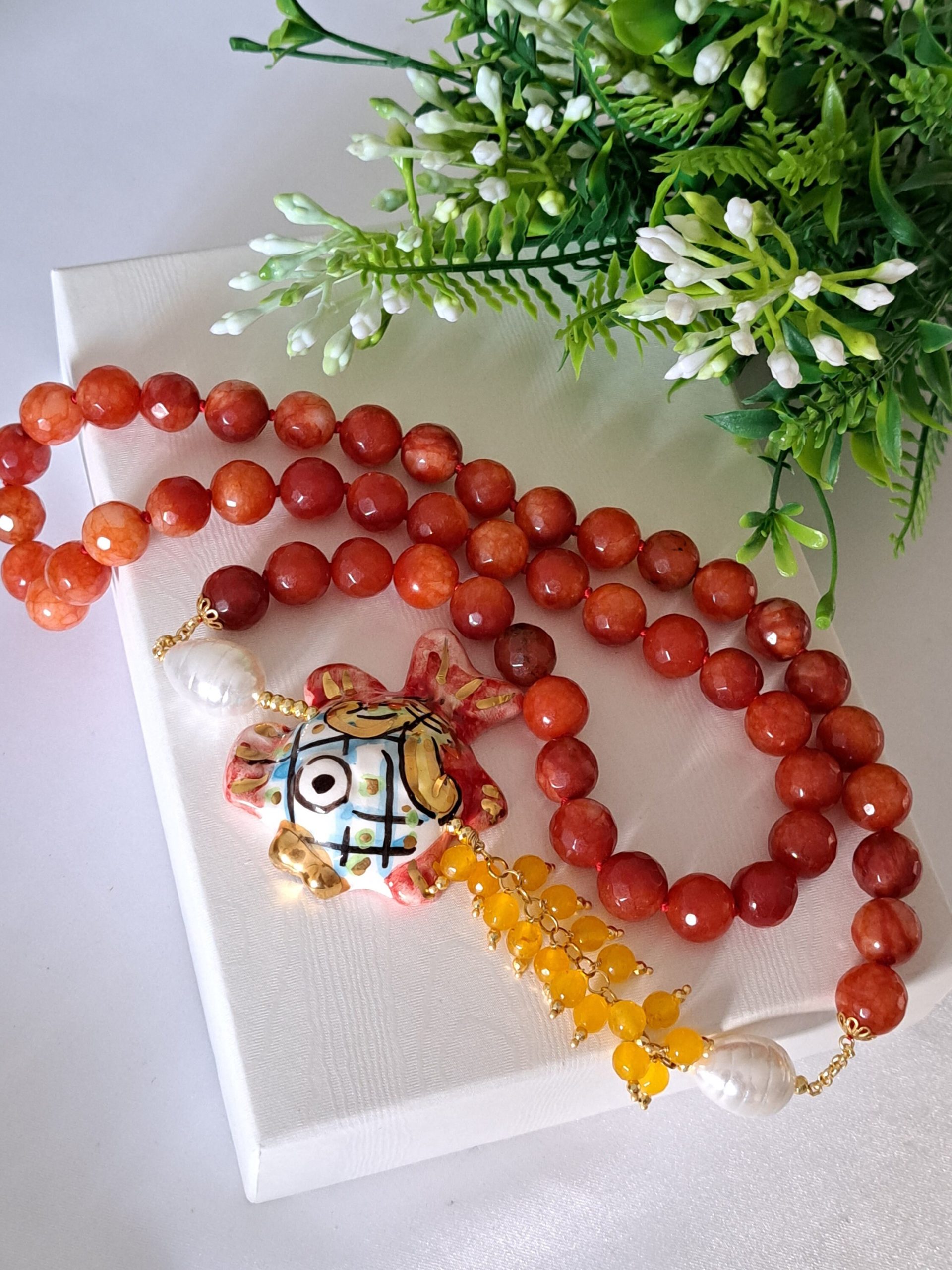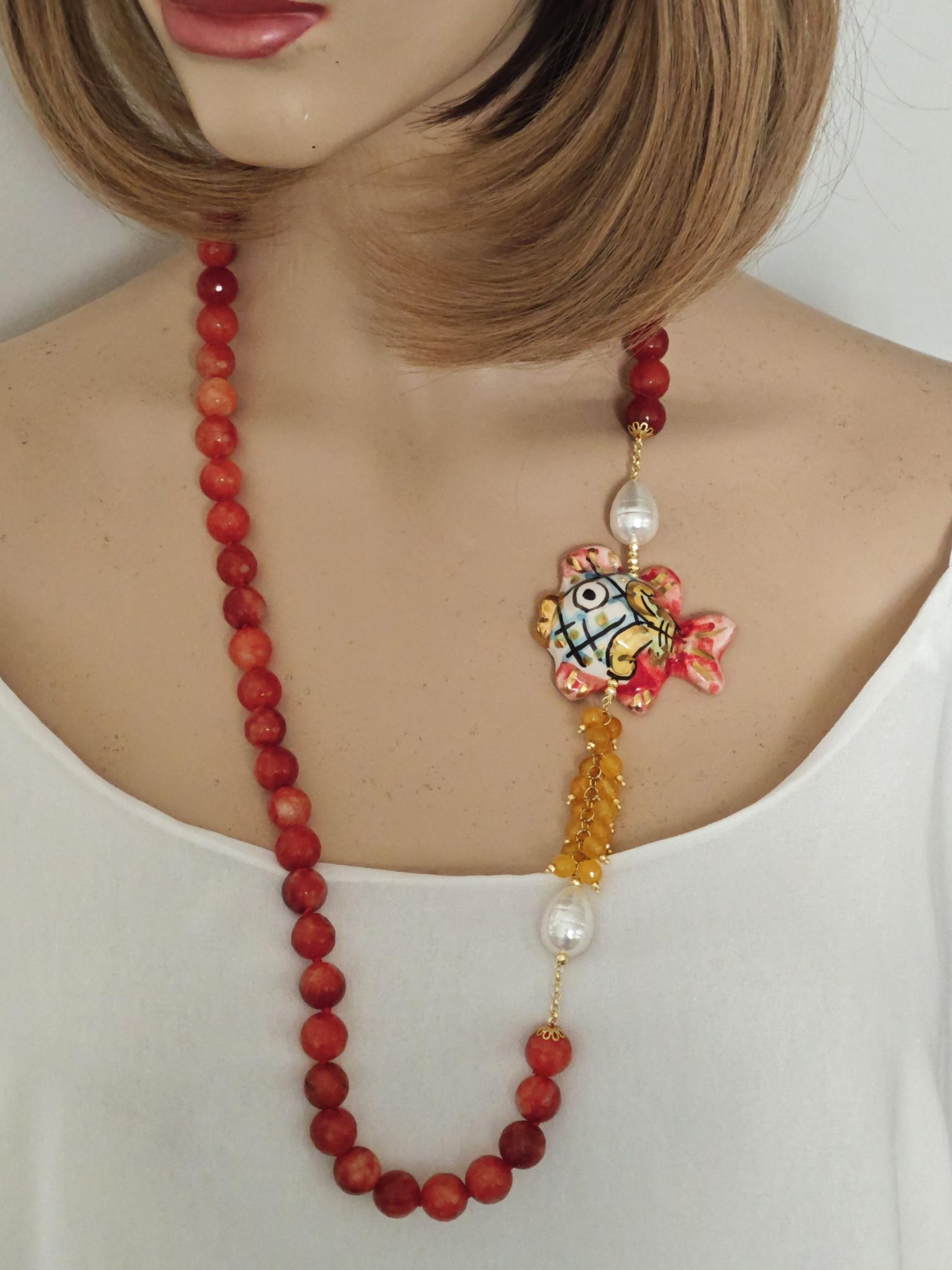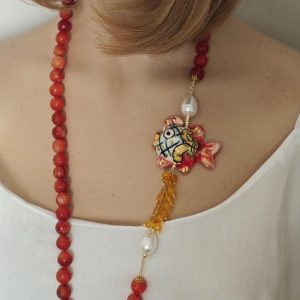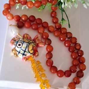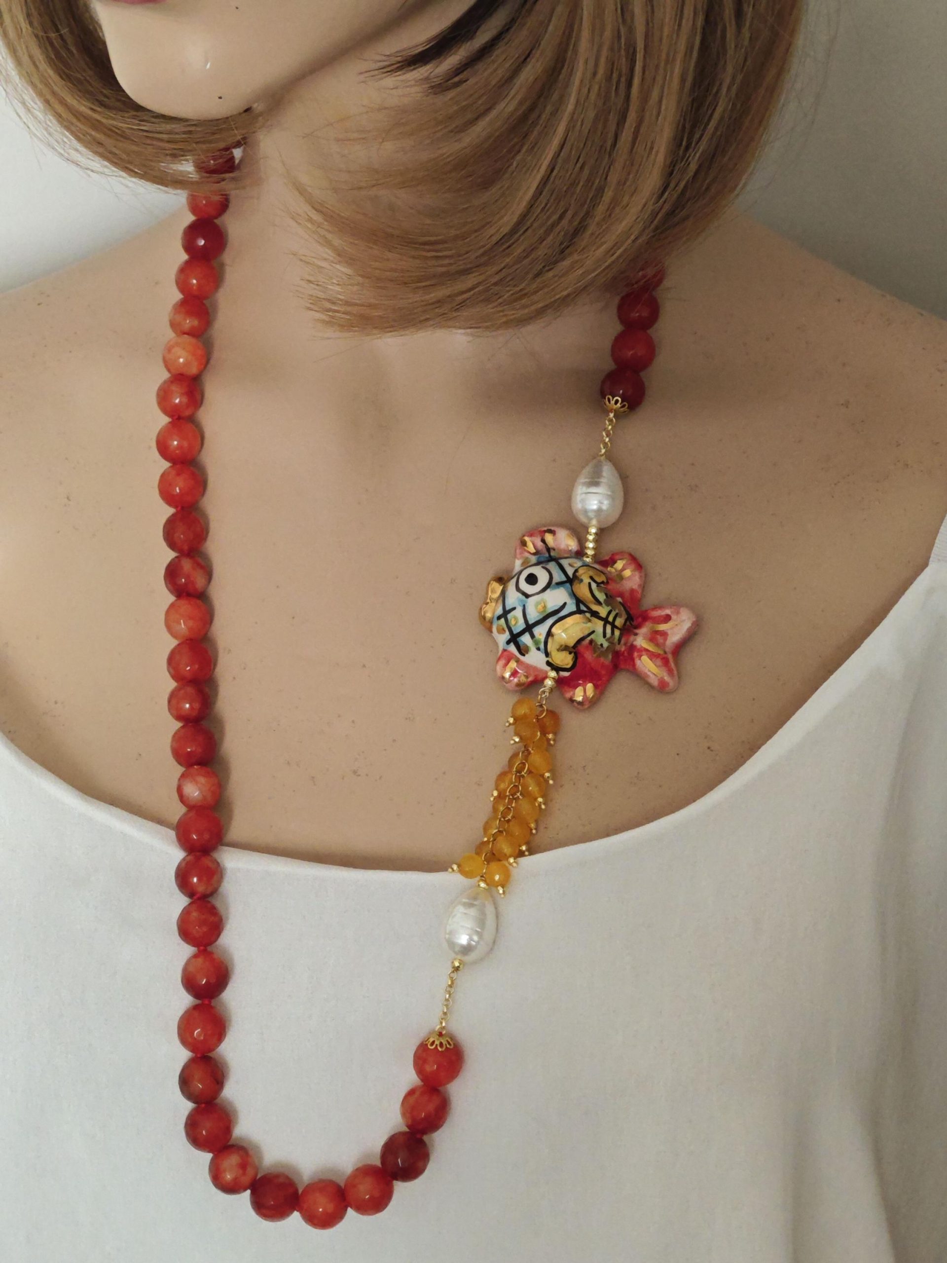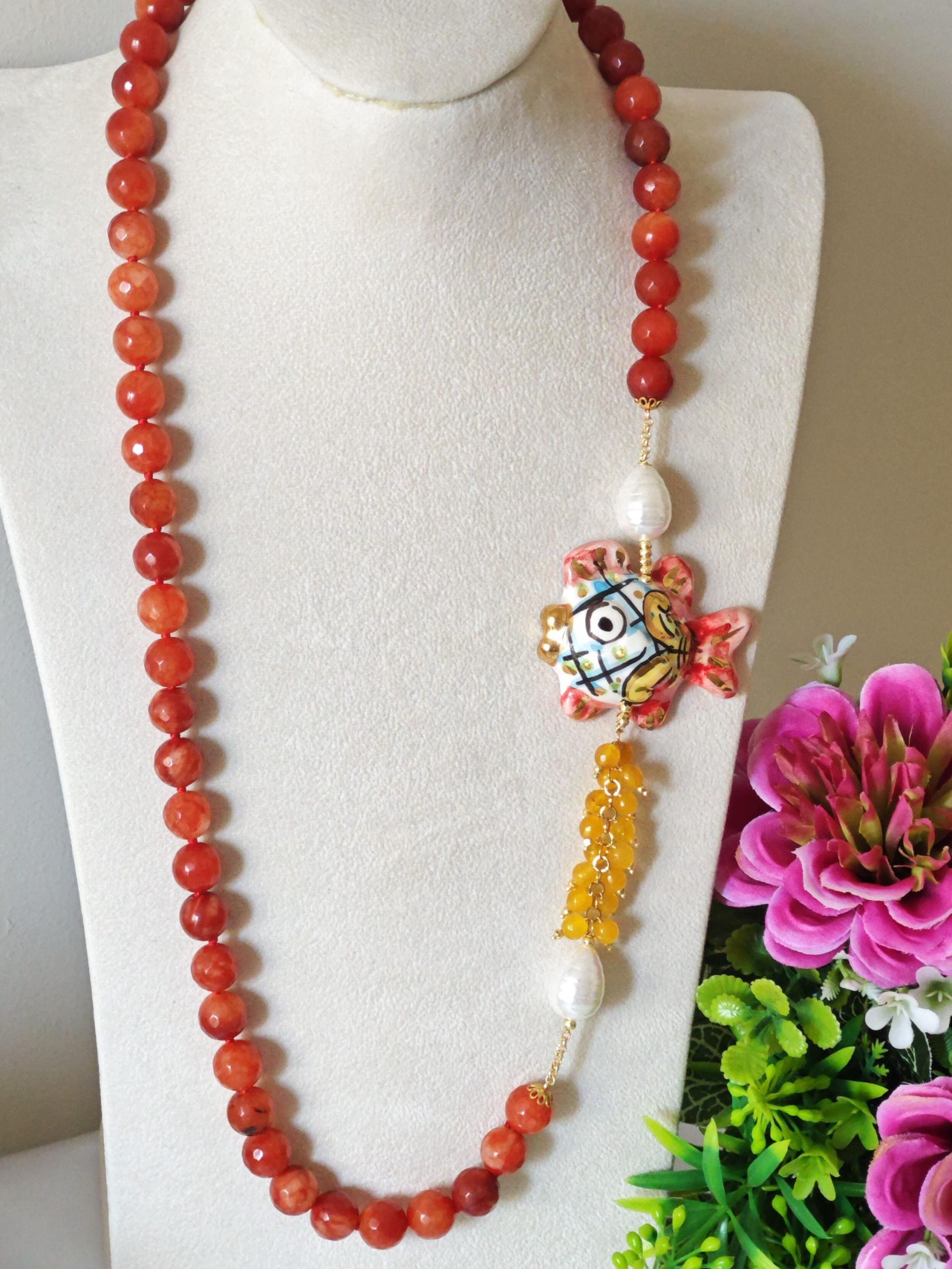 Collana annodata a mano con pietre dure sfaccettate agata arancione 12 mm ,grappolo pietre agata gialla e 2 perle bianche barocche madreperlate imitazione, e con pesciolino in ceramica di Caltagirone realizzata e dipinta a mano con applicazioni foglia oro 22 kt, 5×4 cm dimensioni, corallo rosso mediterraneo e perle naturali bianche.