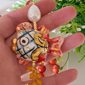 Orecchini con pesci ceramica Caltagirone, corallo rosso naturale e perle bianche, orecchini siciliani