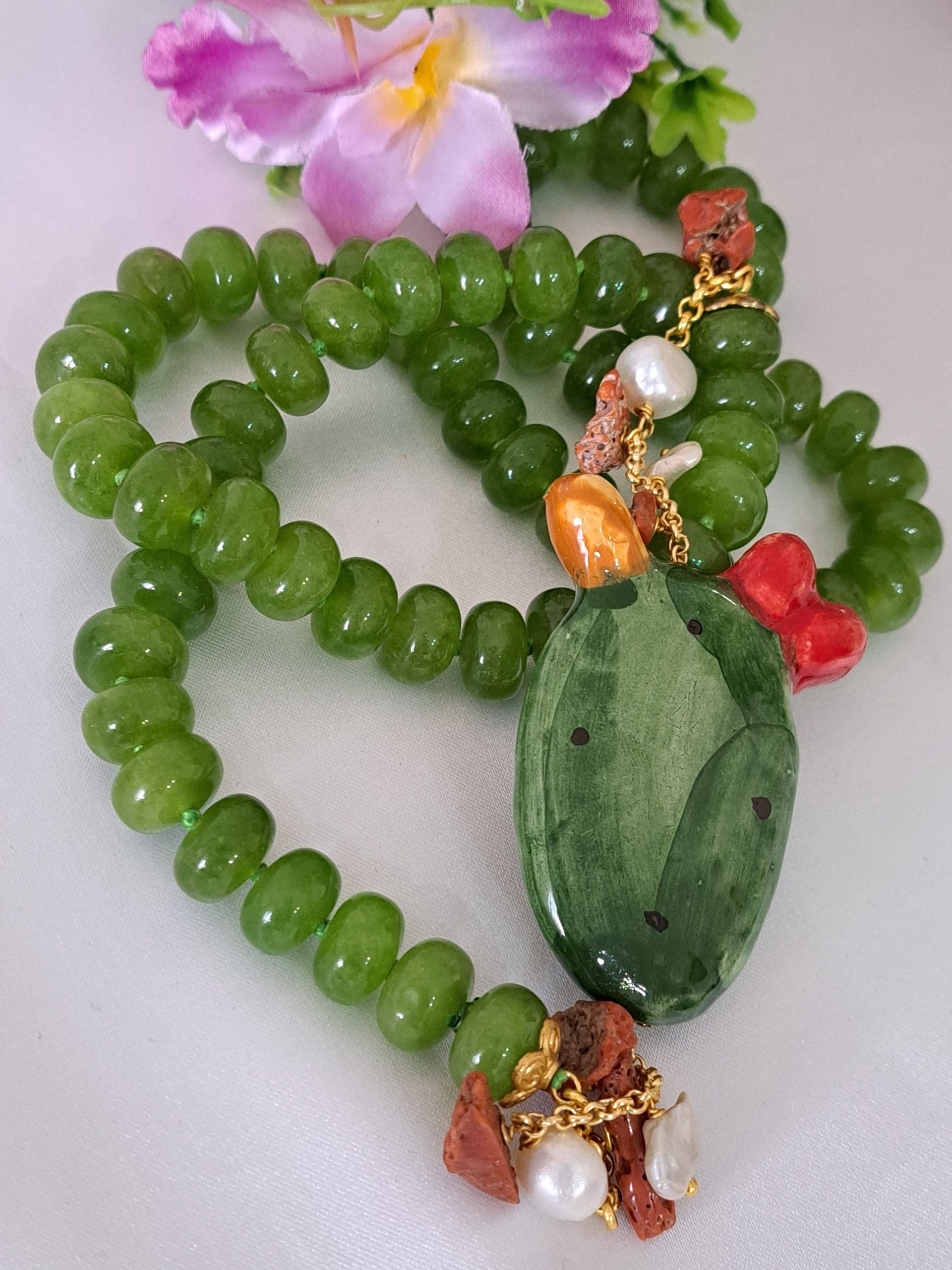 Collana realizzata con pietre dure a rondella peridoto verde annodate a mano 14 mm , fico d’india in ceramica di Caltagirone realizzata e dipinta a mano, con applicazioni foglia oro 22 kt, 6 cm dimensioni, perle bianche e corallo rosso mediterraneo ,