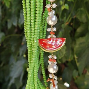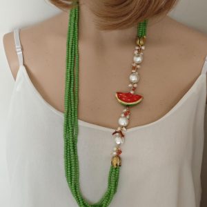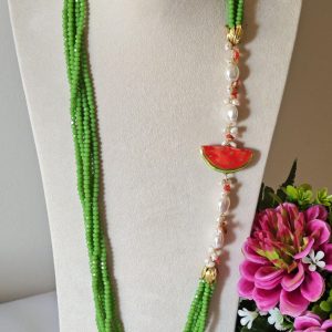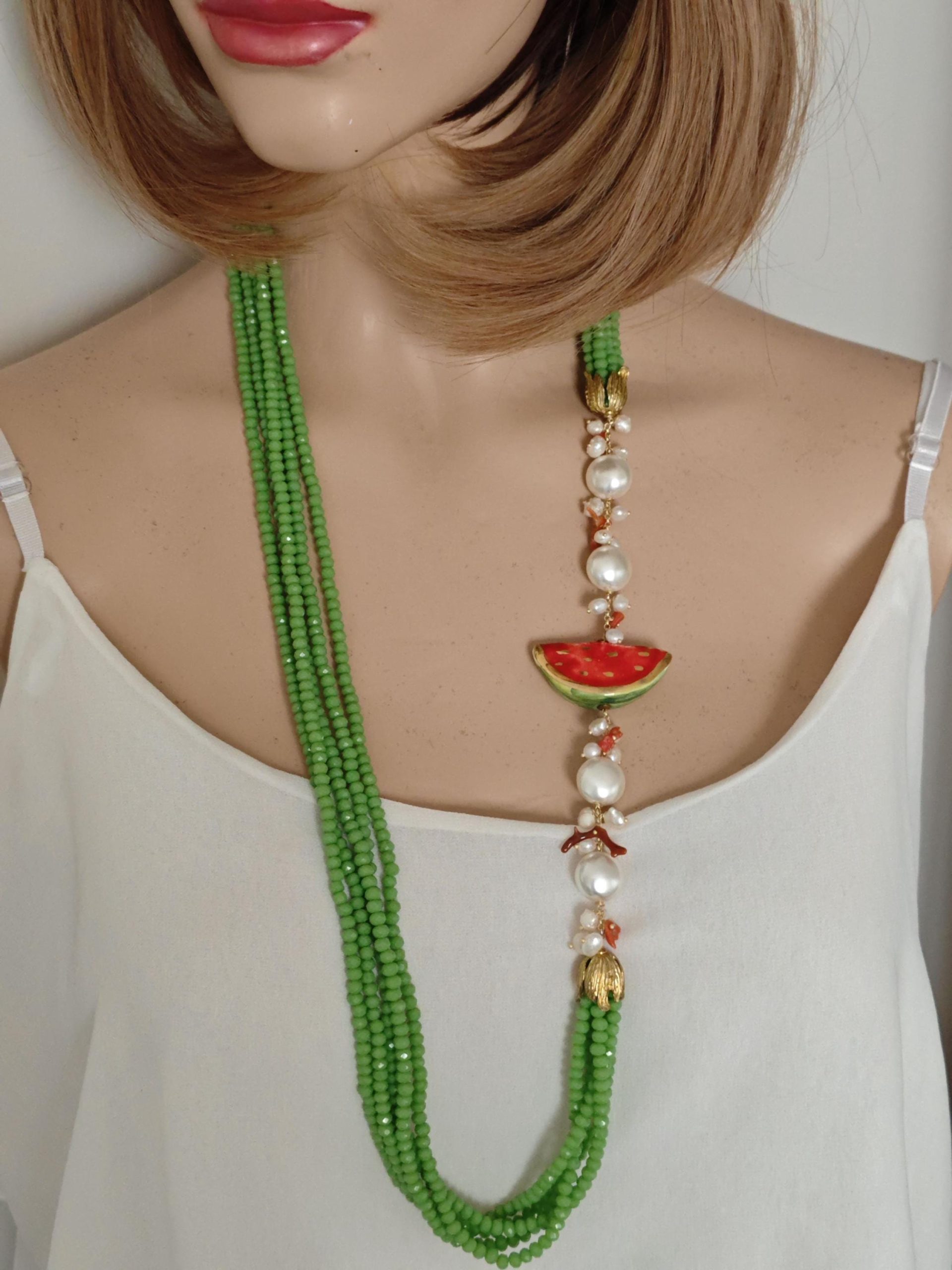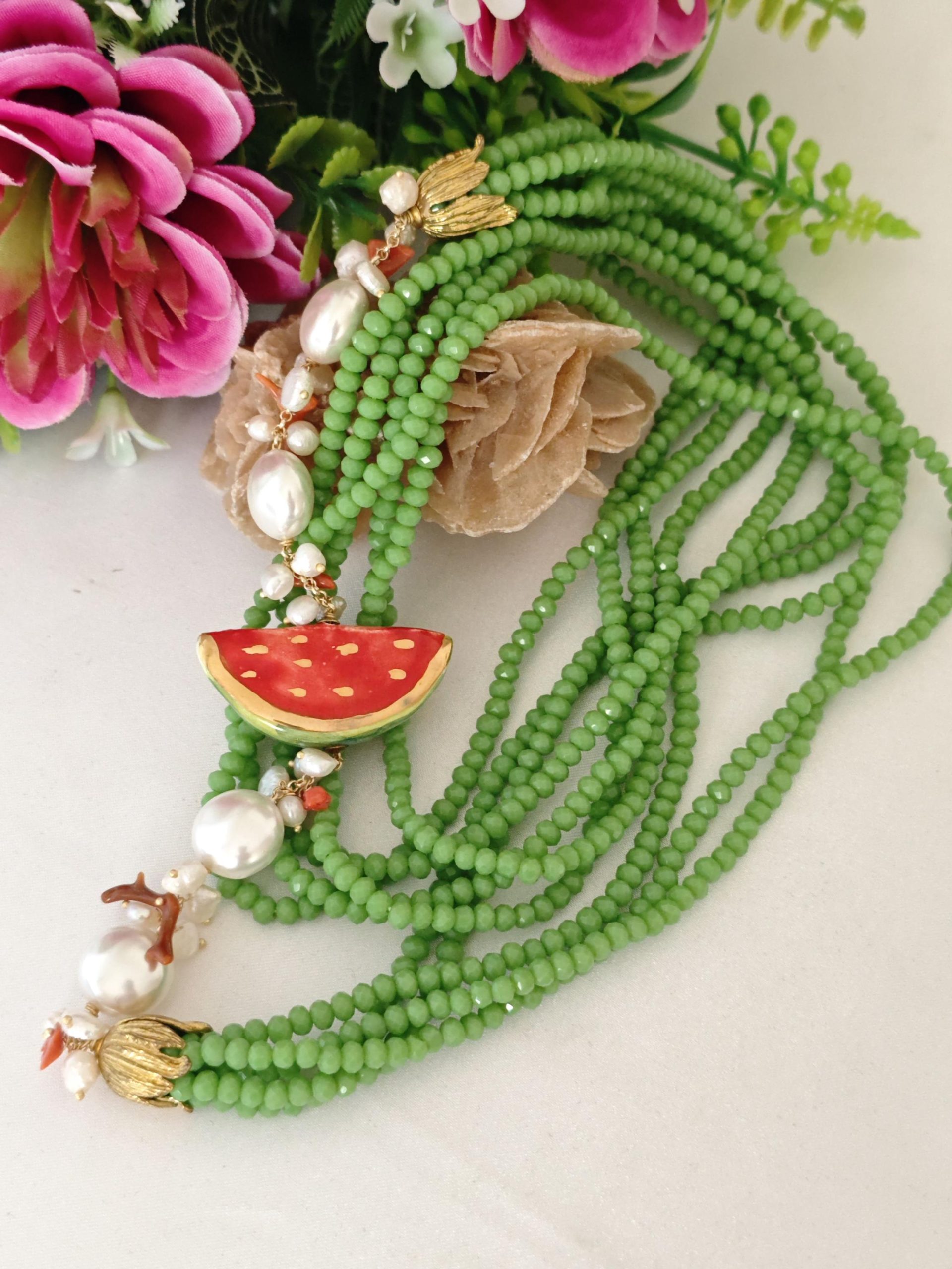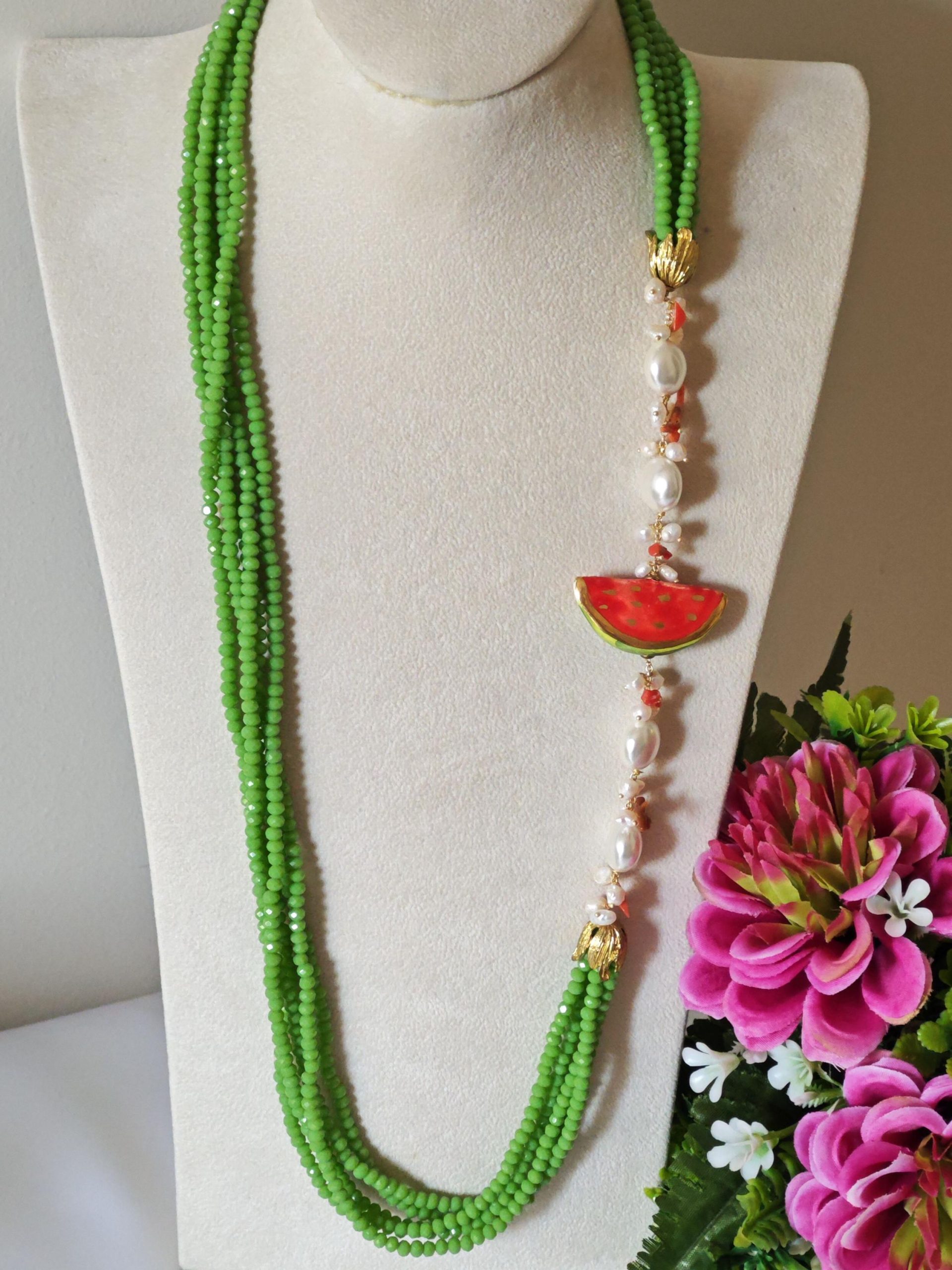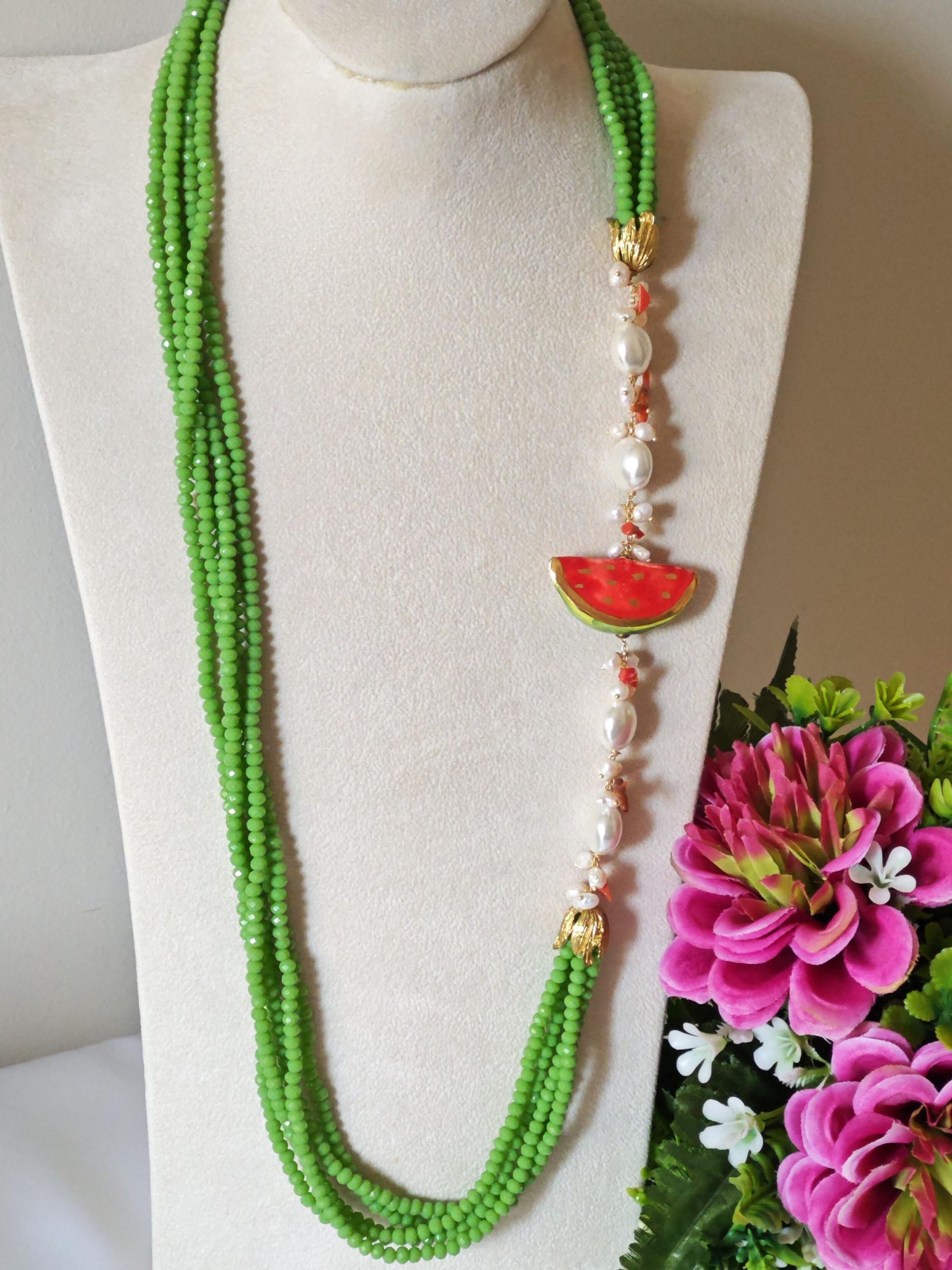 Collana artigianale realizzato con 5 fili cristalli verdi, perle bianche imitazione e corallo rosso naturale mediterraneo con Fetta anguria in ceramica di Caltagirone realizzata e dipinta a mano 4×2 cm dimensioni, con applicazioni foglia d’oro 22 kt.