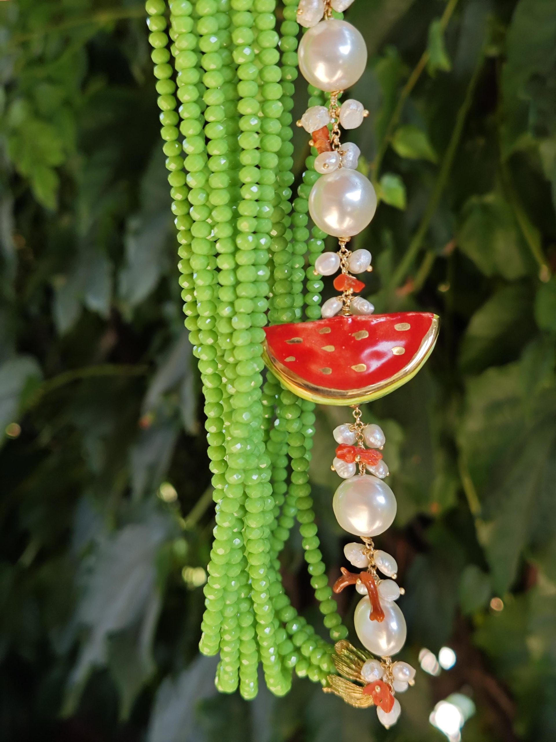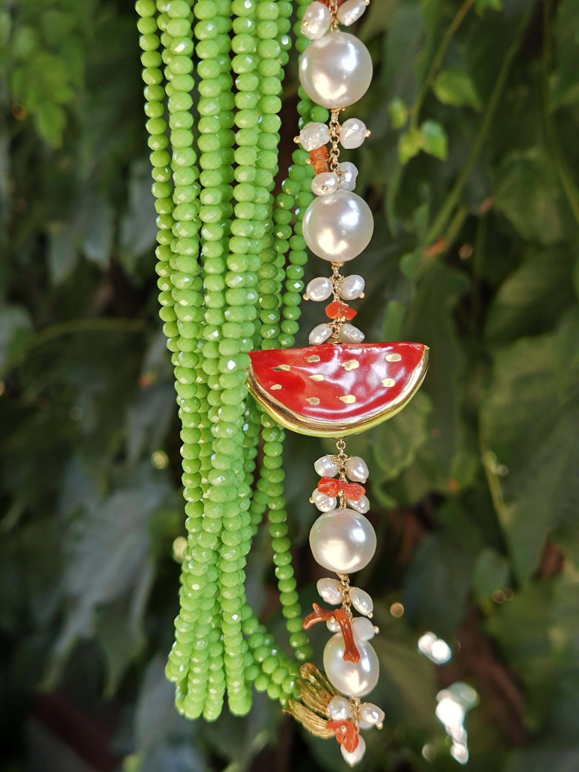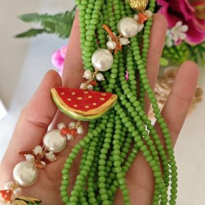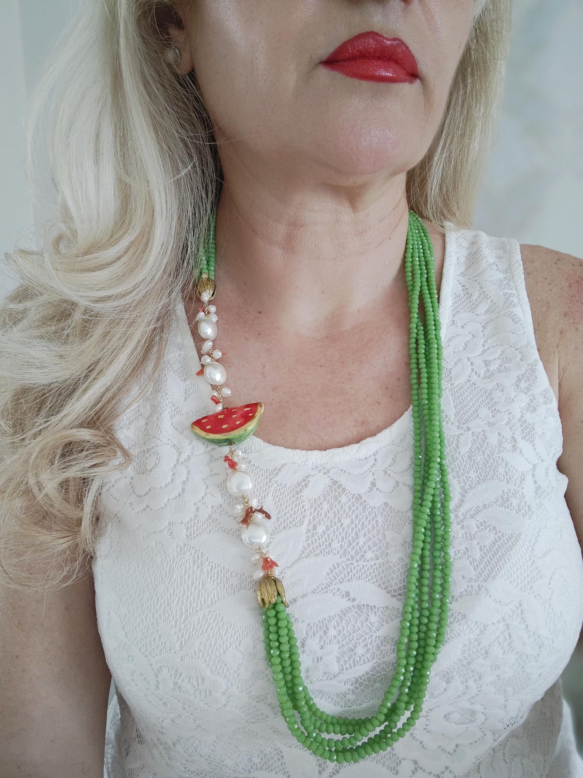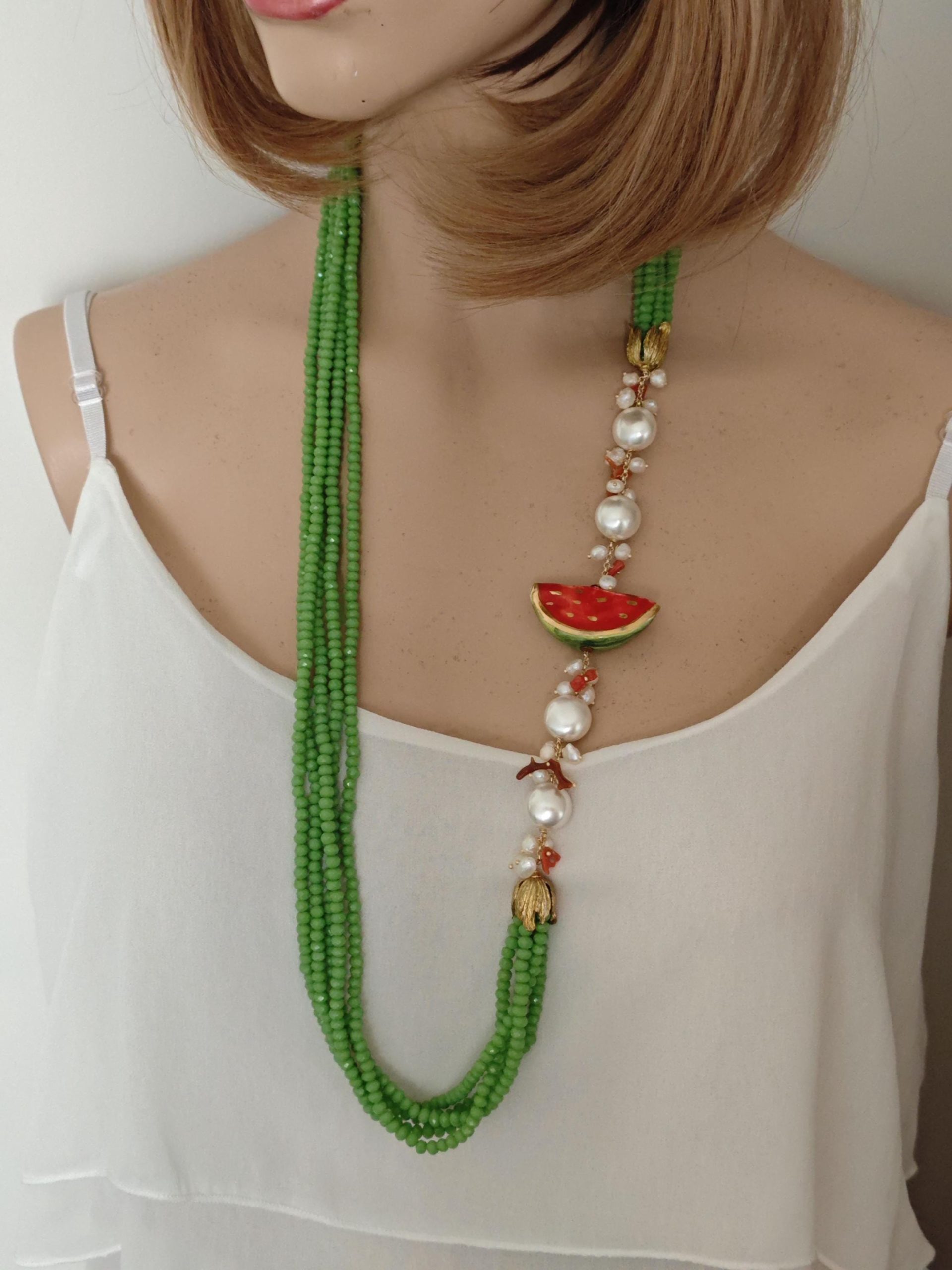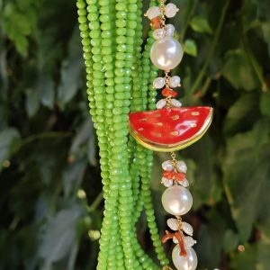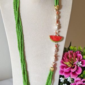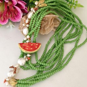 Collana artigianale realizzato con 5 fili cristalli verdi, perle bianche imitazione e corallo rosso naturale mediterraneo con Fetta anguria in ceramica di Caltagirone realizzata e dipinta a mano 4×2 cm dimensioni, con applicazioni foglia d’oro 22 kt.
