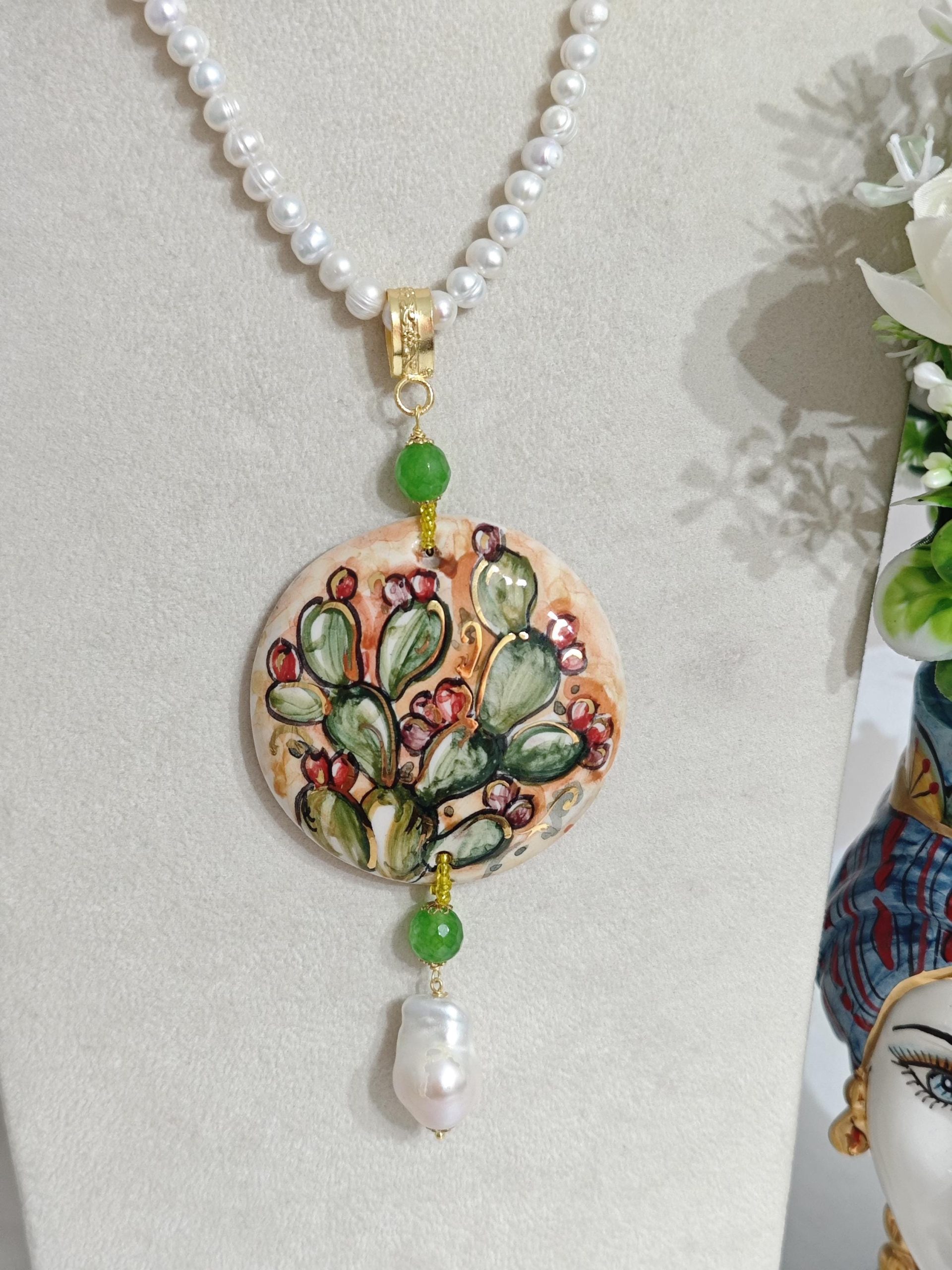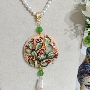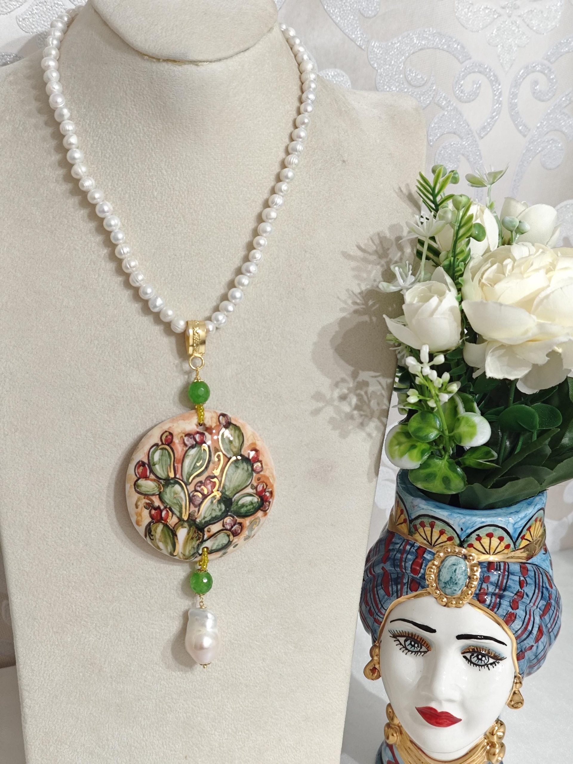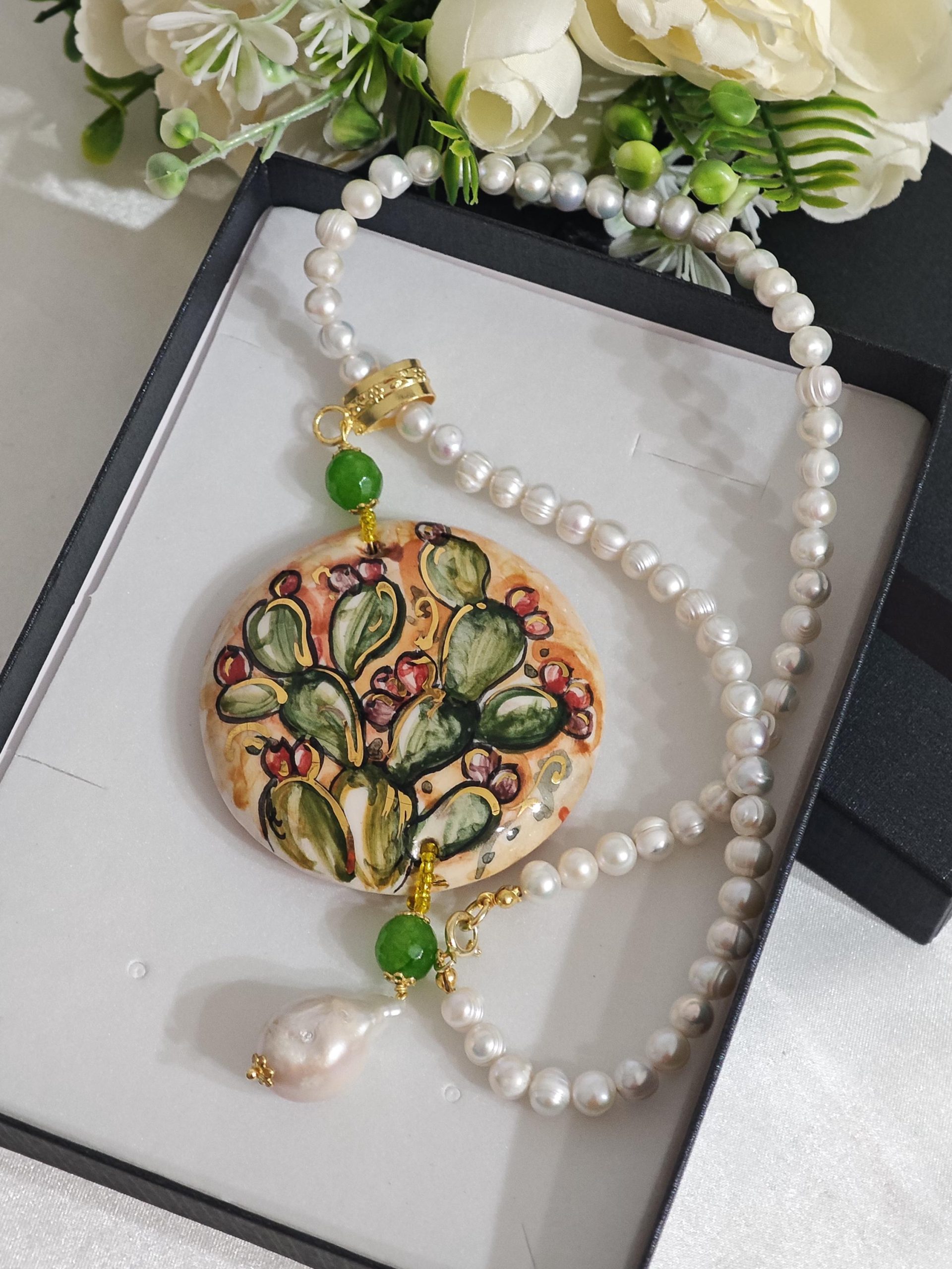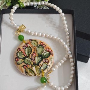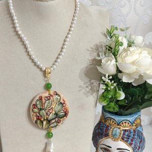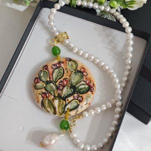 Un’elegante collana di perle bianche naturali arricchita da un medaglione in ceramica di Caltagirone grande 6 cm diametro, interamente dipinto a mano con maestria artigianale. Il pendente raffigura un cactus con frutti rossi, simbolo di forza e vitalità, tipico dell’iconografia siciliana.