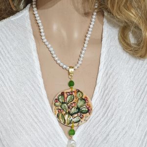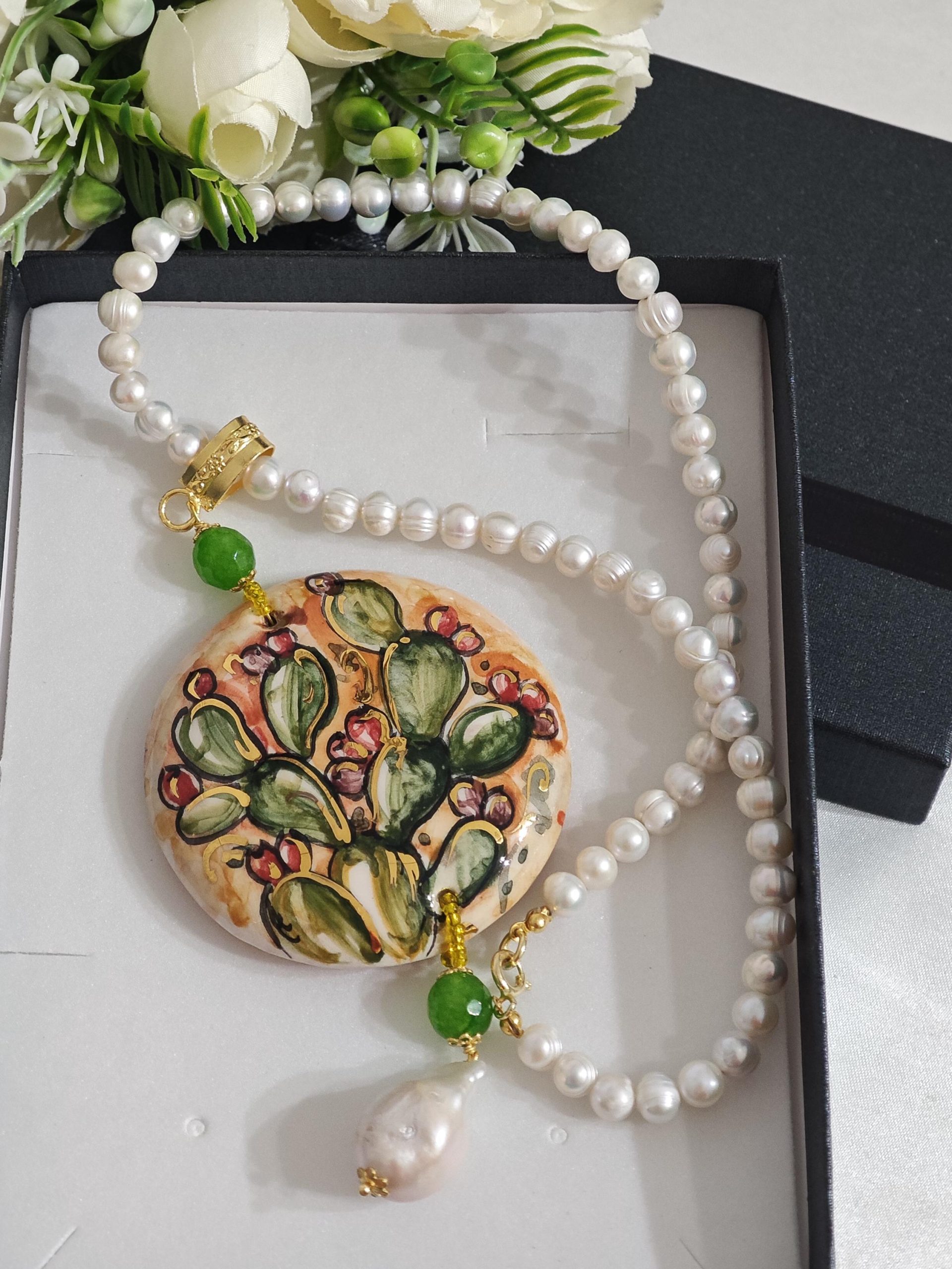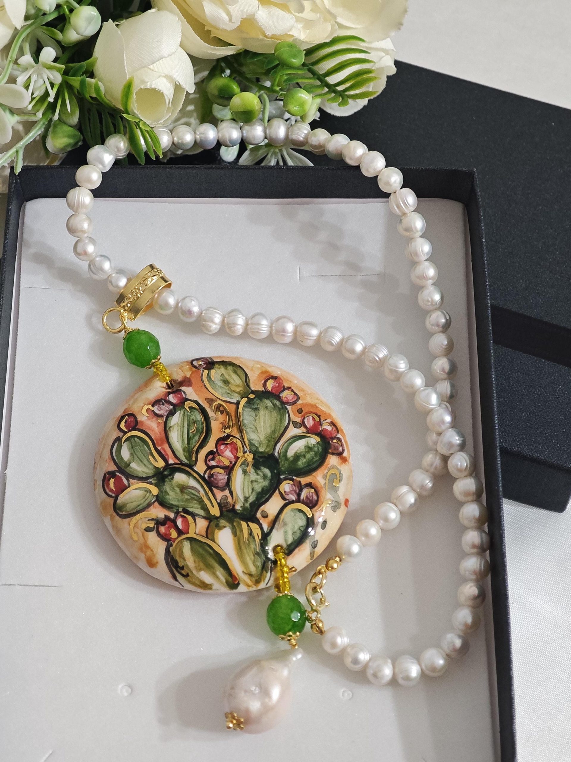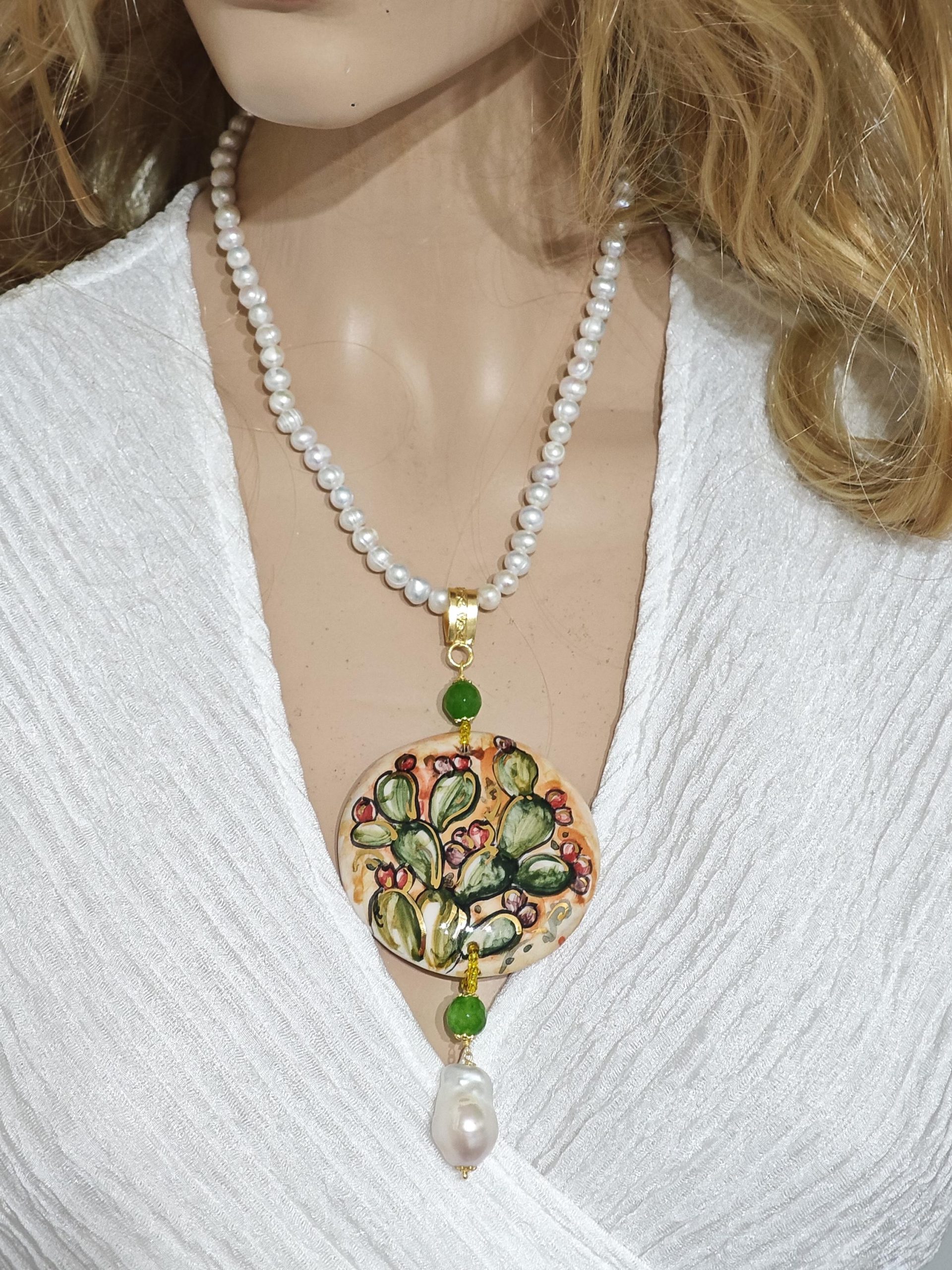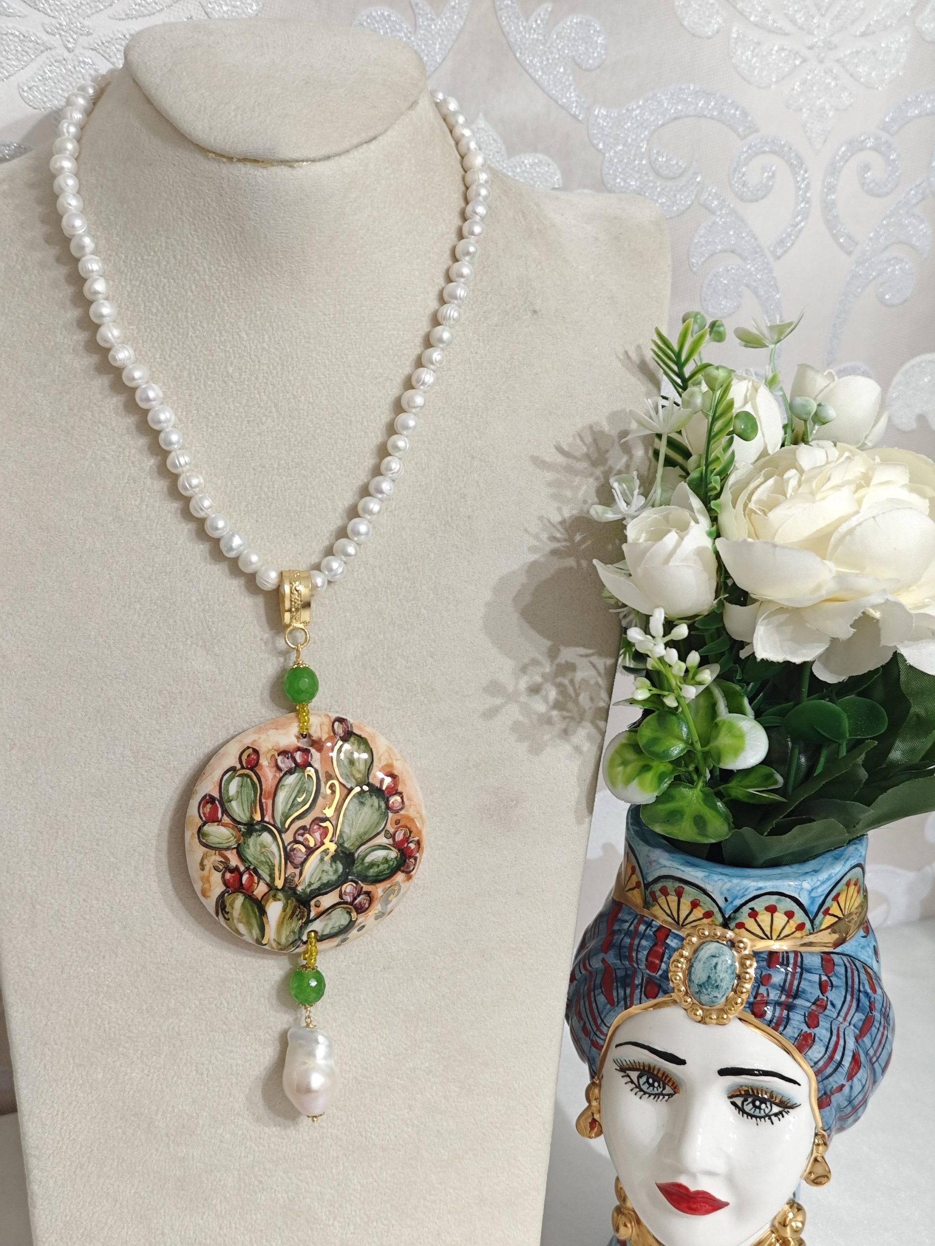 Un’elegante collana di perle bianche naturali arricchita da un medaglione in ceramica di Caltagirone grande 6 cm diametro, interamente dipinto a mano con maestria artigianale. Il pendente raffigura un cactus con frutti rossi, simbolo di forza e vitalità, tipico dell’iconografia siciliana.
