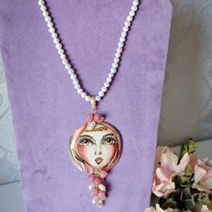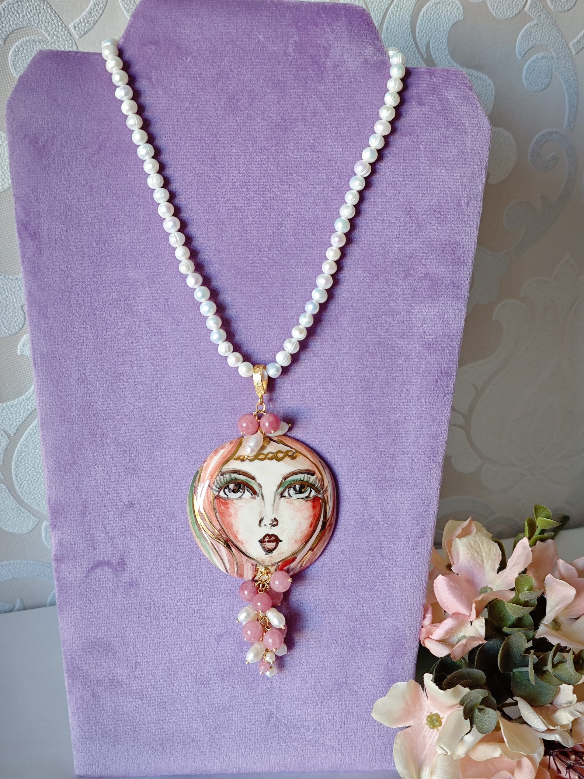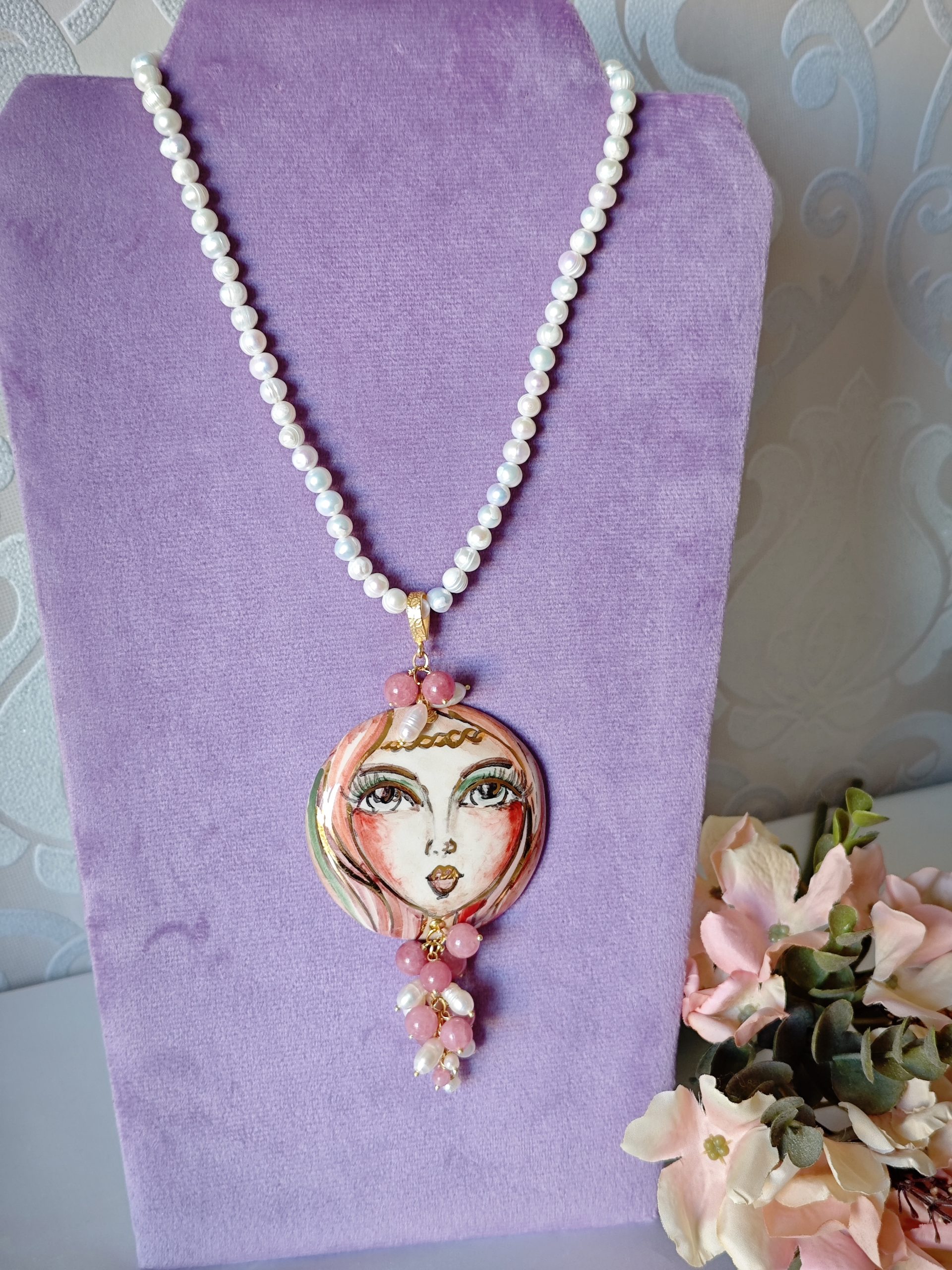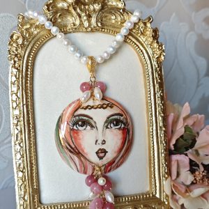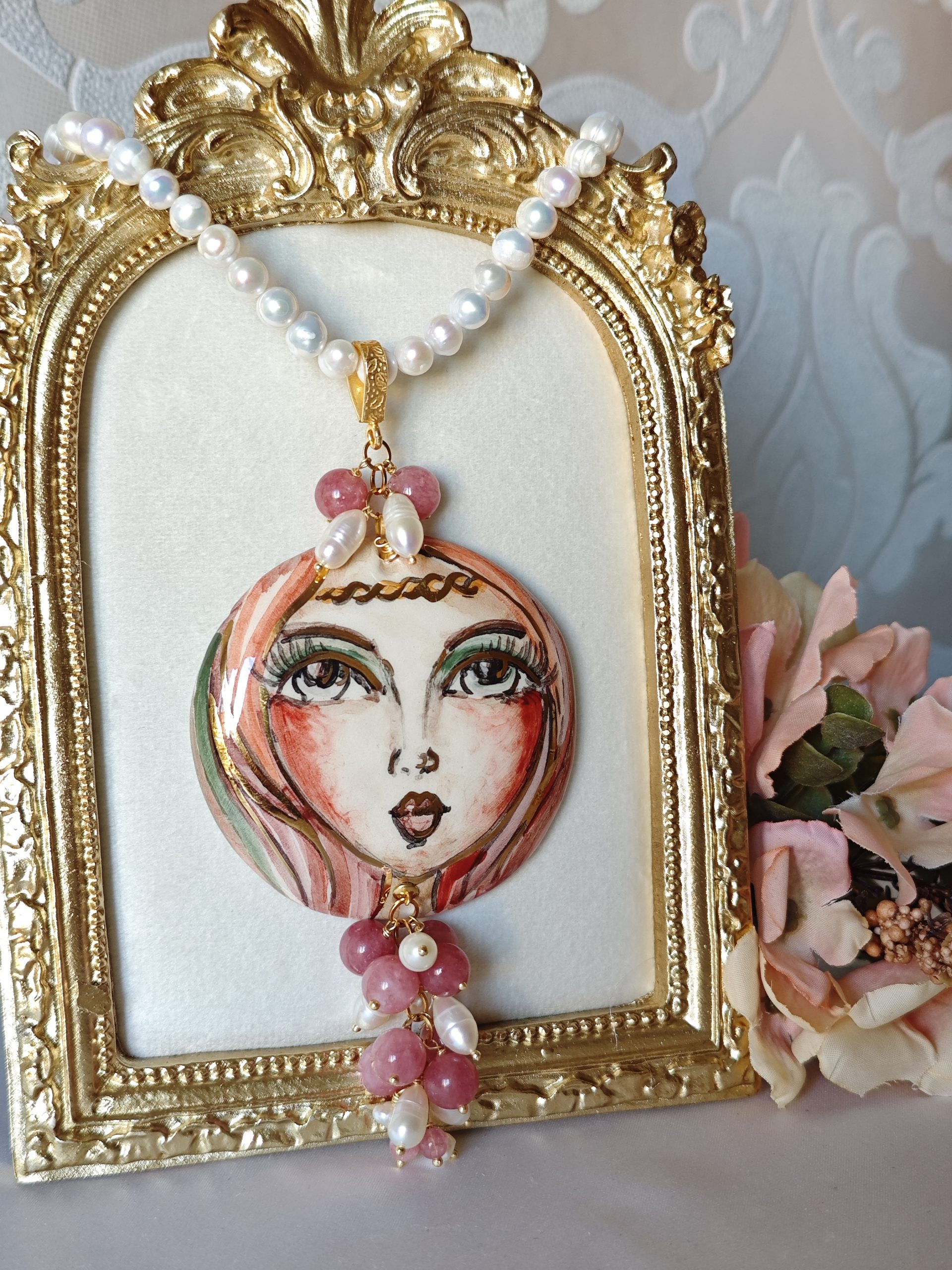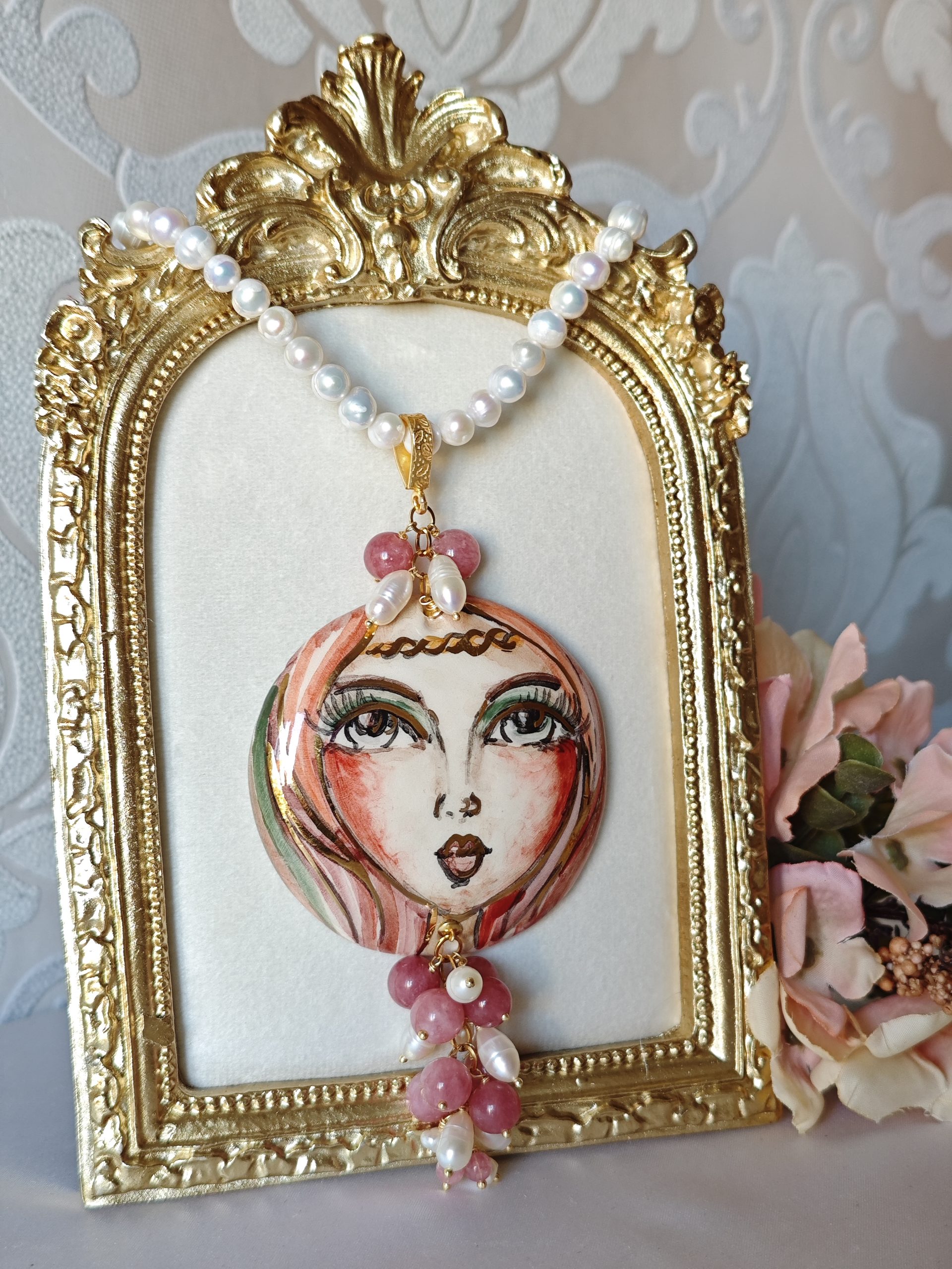 Collana con perle bianche naturali e con pendente in ceramica di Caltagirone realizzata e dipinta a mano, con applicazioni foglia oro 22 kt , 6 cm diametro impreziosito da grappolo pietre quarzo rosa fragola e perle bianche .