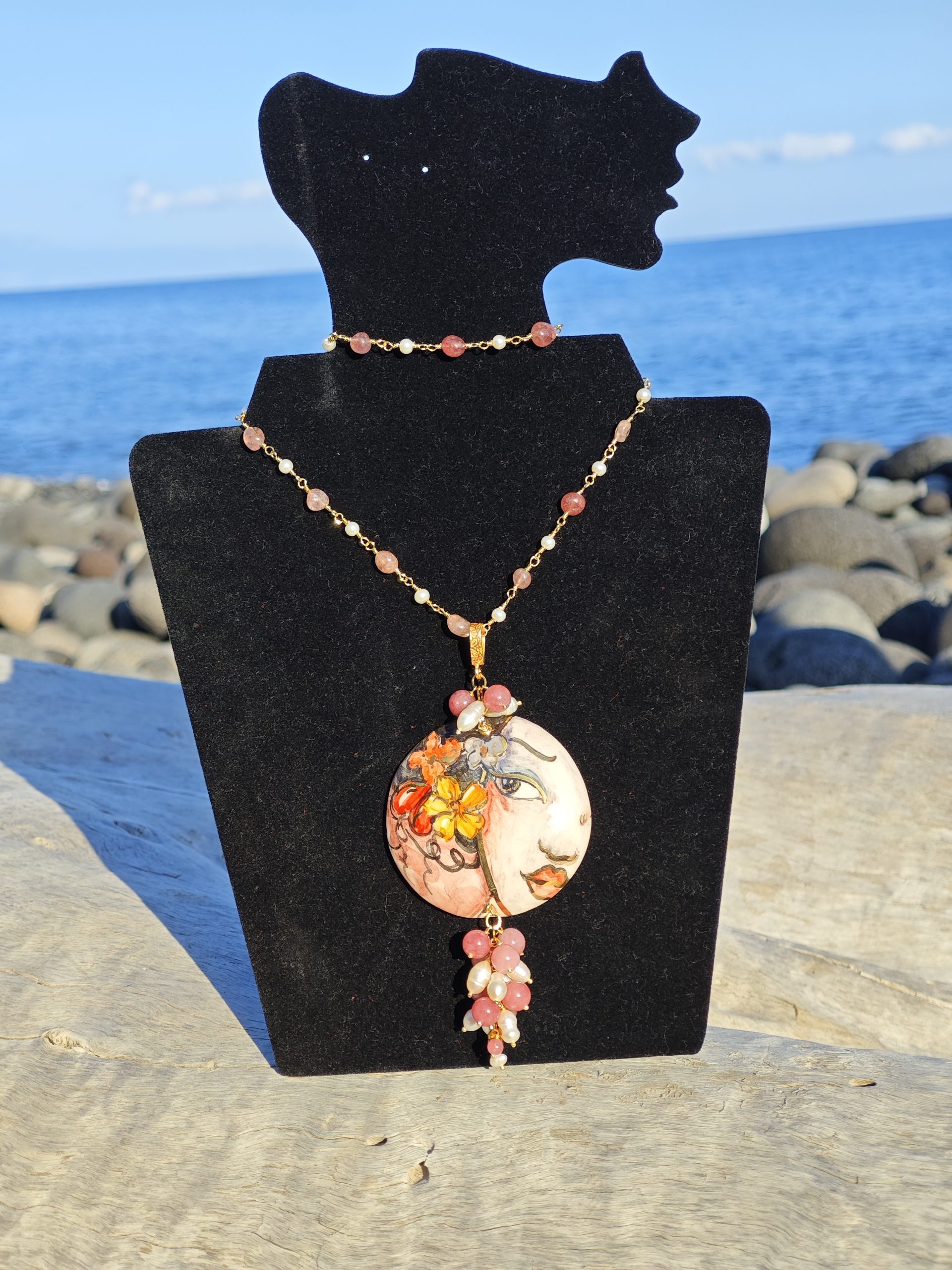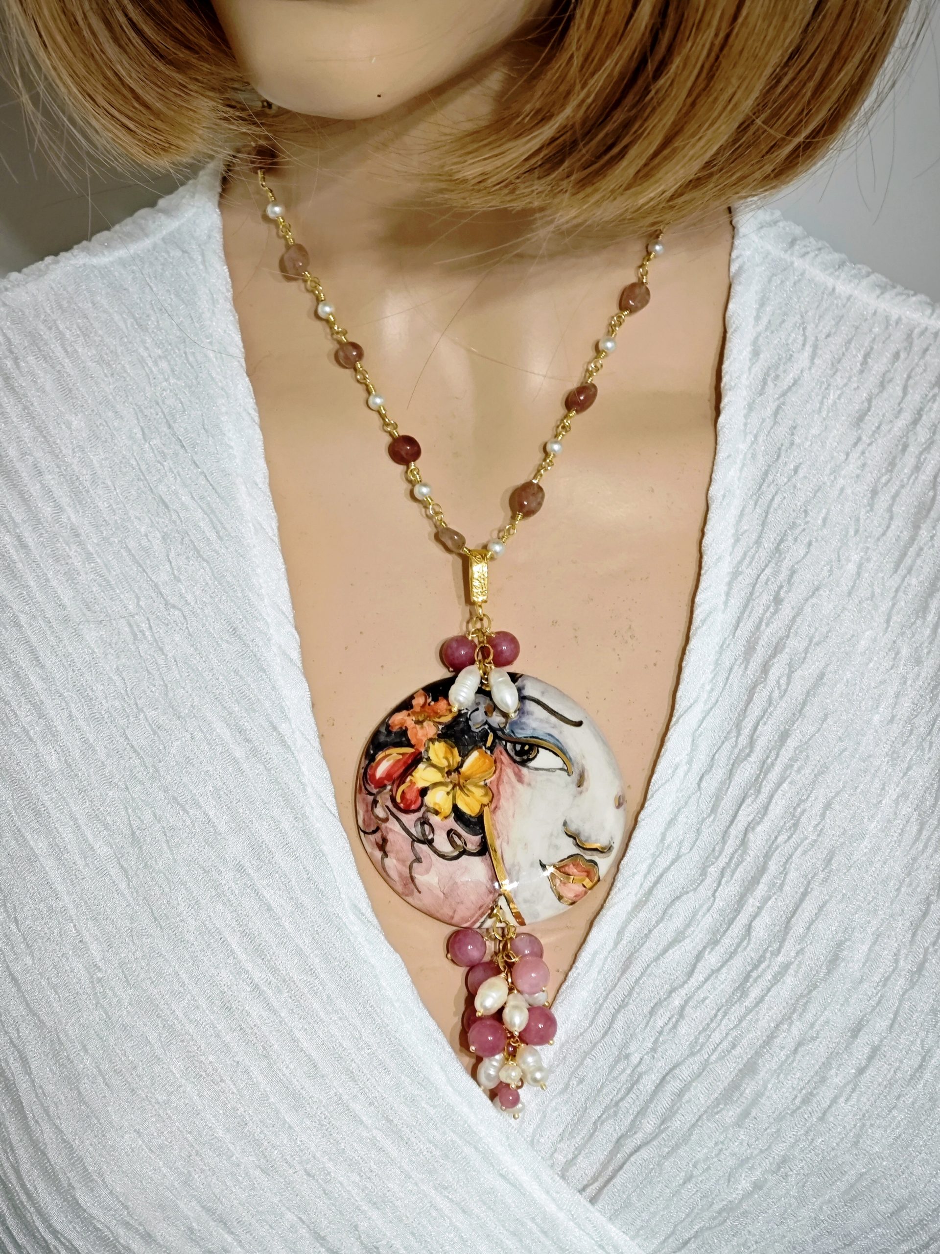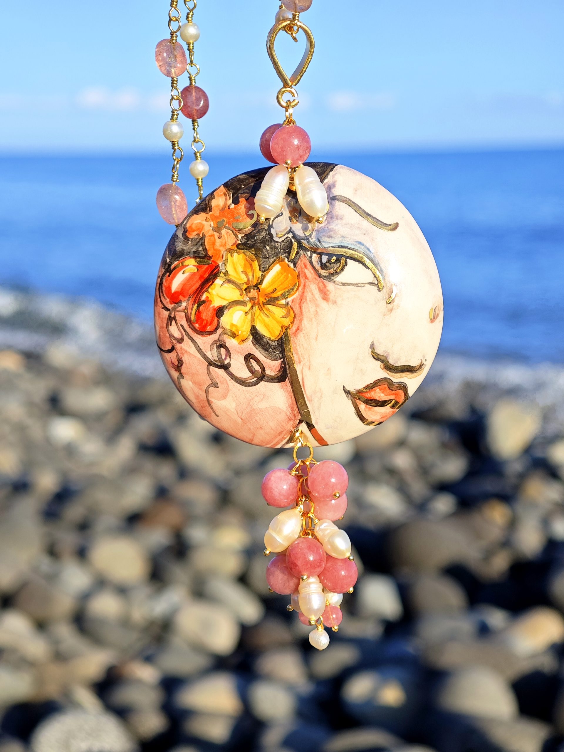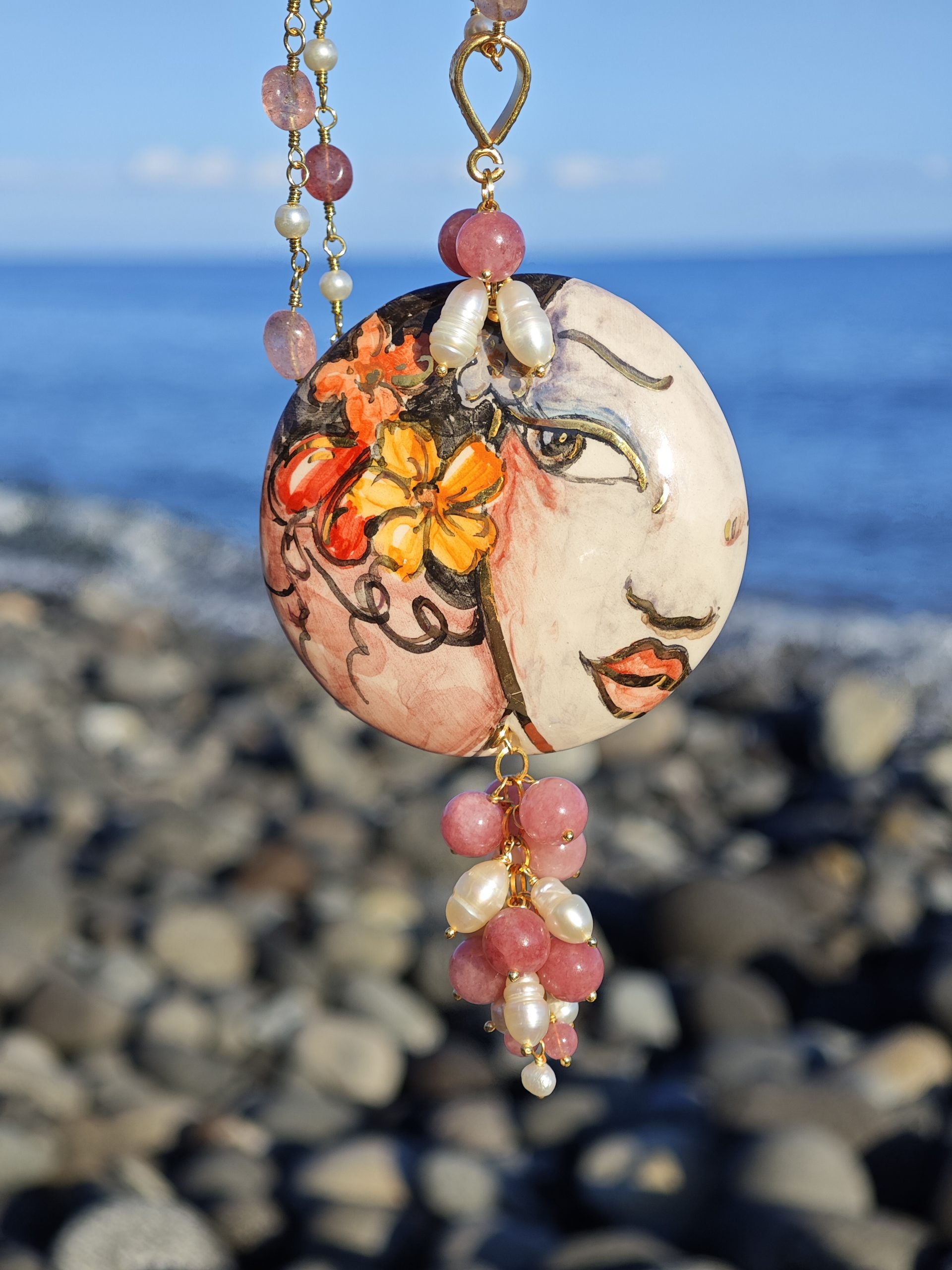 Collana con catena rosario con pietre dure quarzo rosa fragola e perle bianche imitazione e con pendente in ceramica di Caltagirone realizzata e dipinta a mano, con applicazioni foglia oro 22 kt , 6 cm diametro impreziosito da grappolo pietre quarzo rosa fragola e perle bianche .