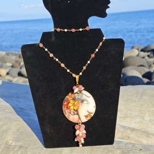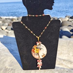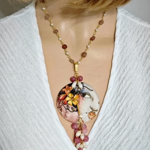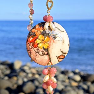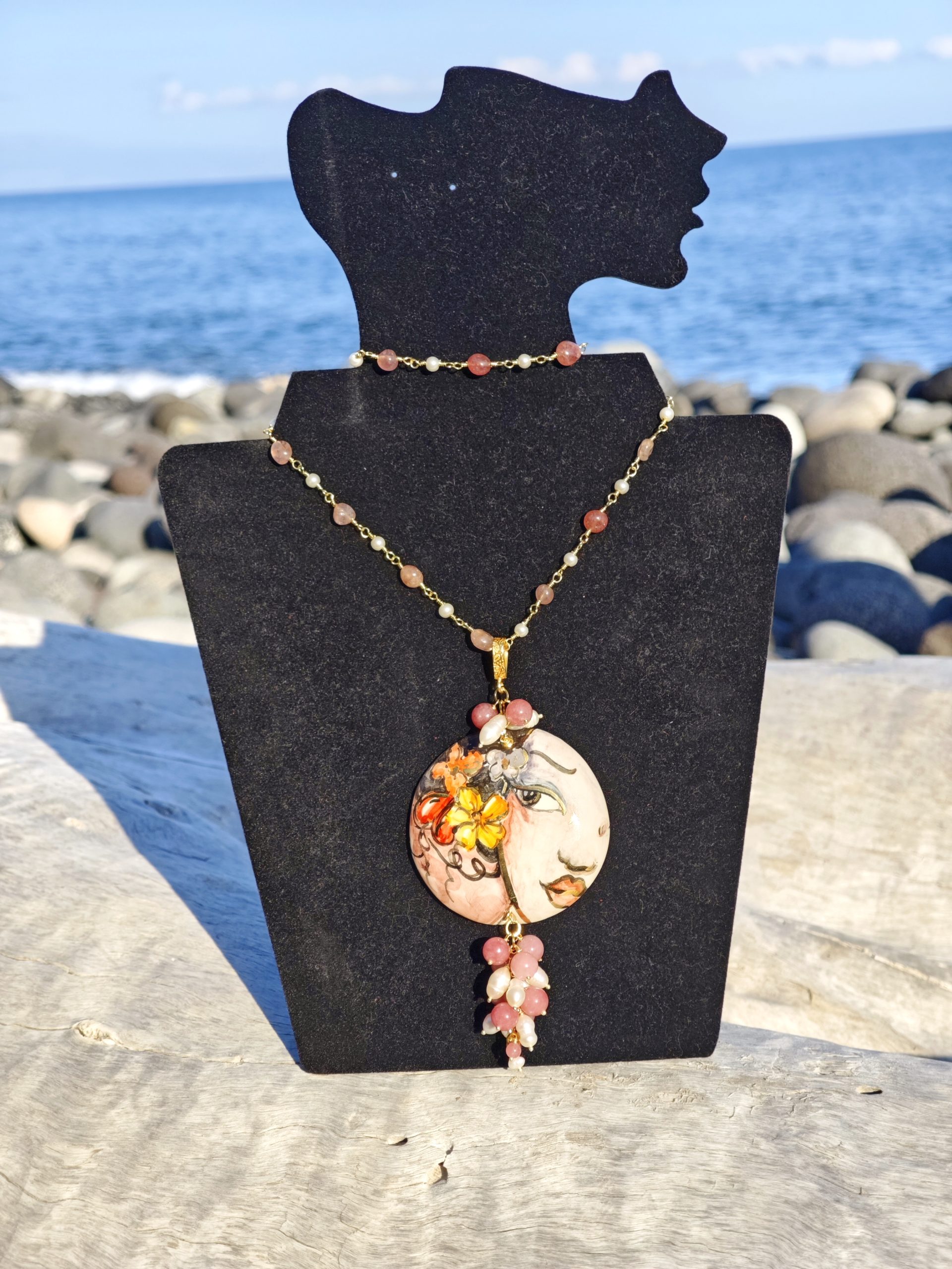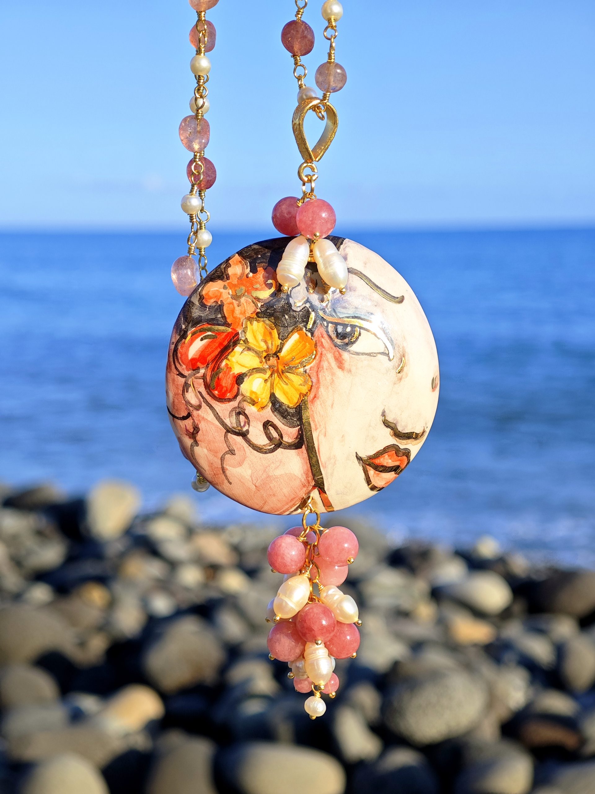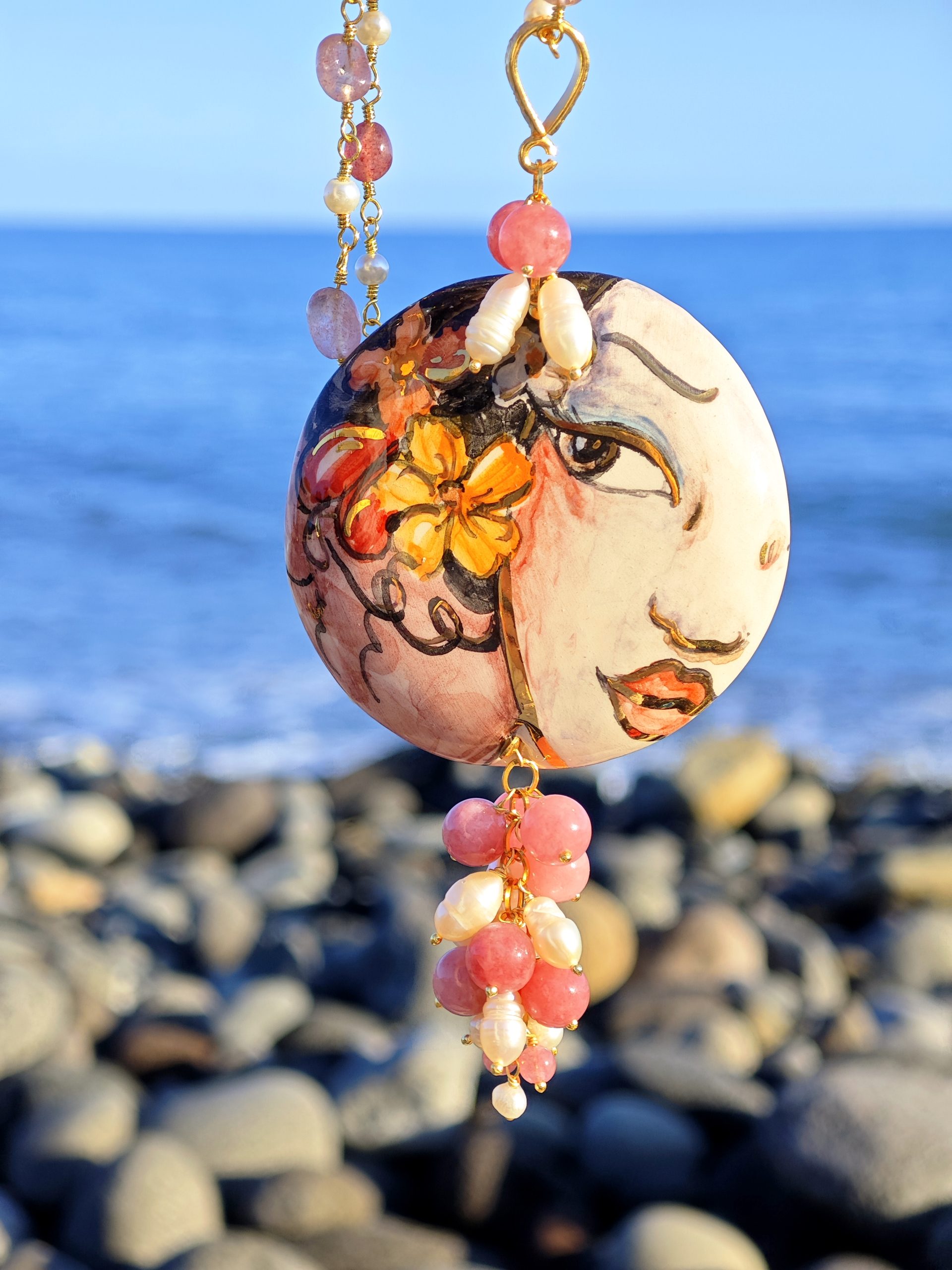 Collana con catena rosario con pietre dure quarzo rosa fragola e perle bianche imitazione e con pendente in ceramica di Caltagirone realizzata e dipinta a mano, con applicazioni foglia oro 22 kt , 6 cm diametro impreziosito da grappolo pietre quarzo rosa fragola e perle bianche .