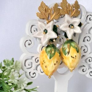 Orecchini limoni ceramica Caltagirone e fiori bianchi , orecchini siciliani