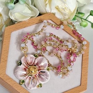 Collana ceramica di Caltagirone con perle bianche e quarzo rosa, collana siciliana