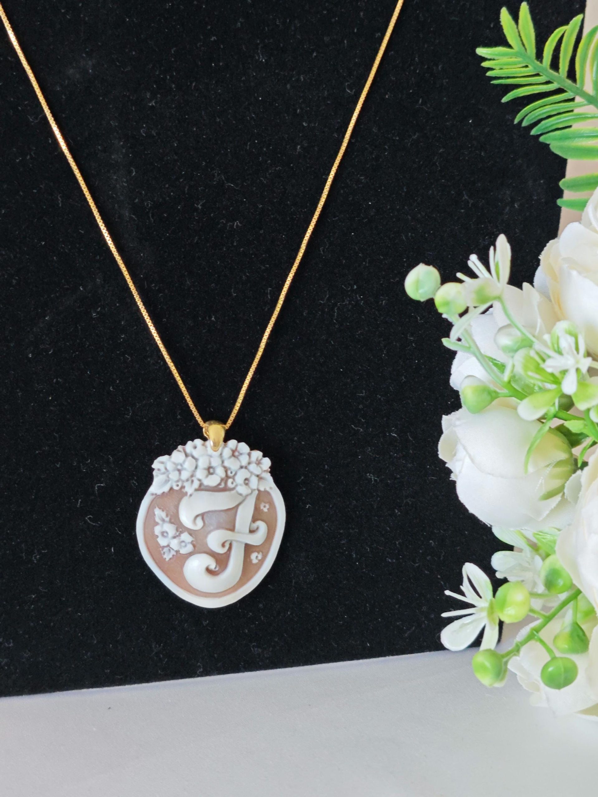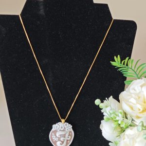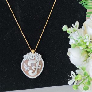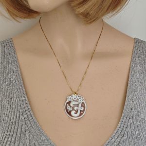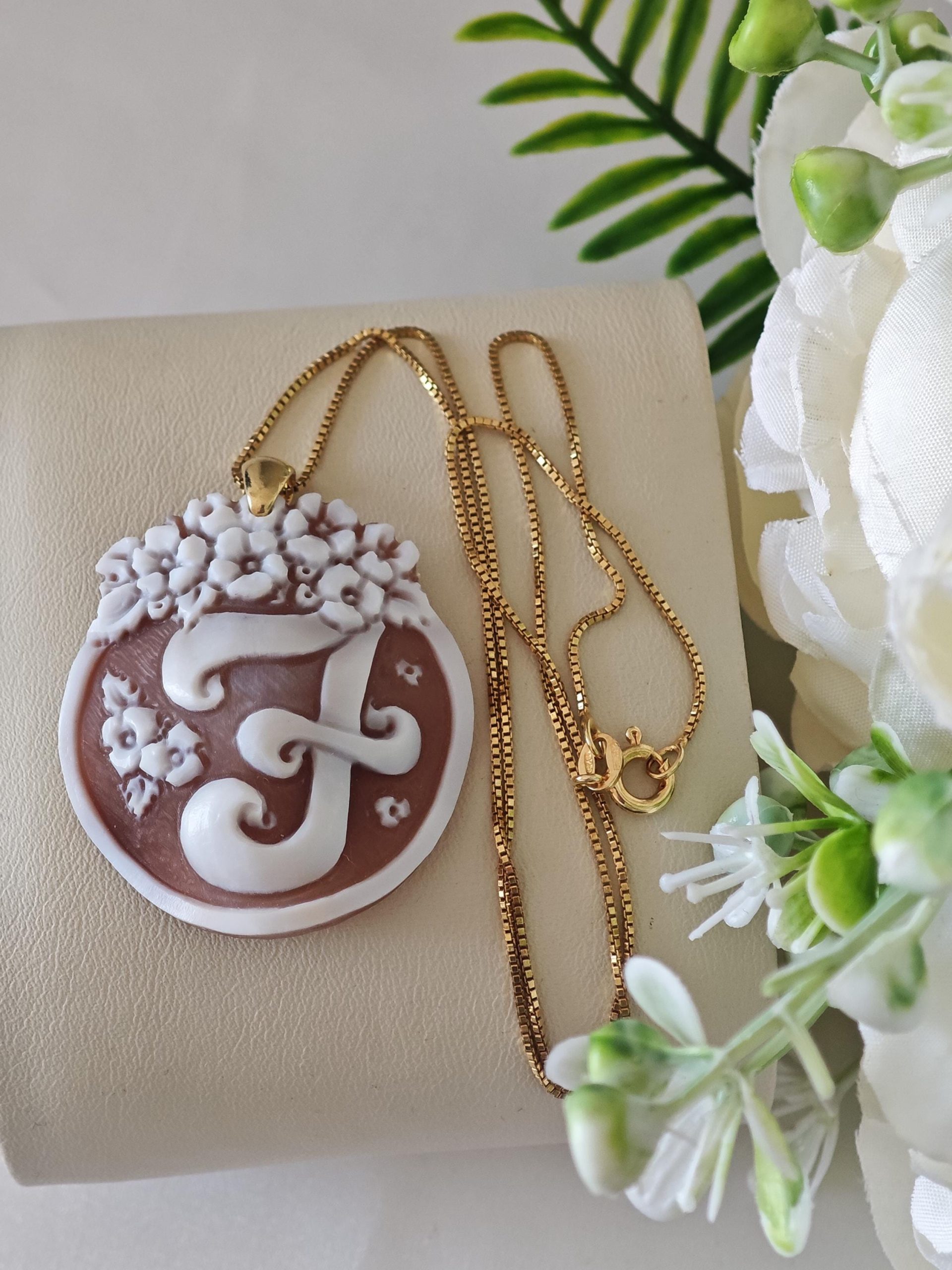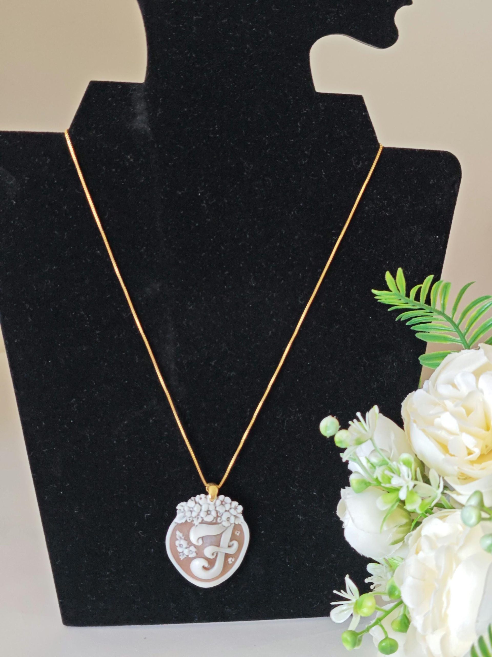 Collana con pendente iniziale “F” in cammeo conchiglia sardonica scolpito a mano a Torre del 4×3,5 cm dimensioni.