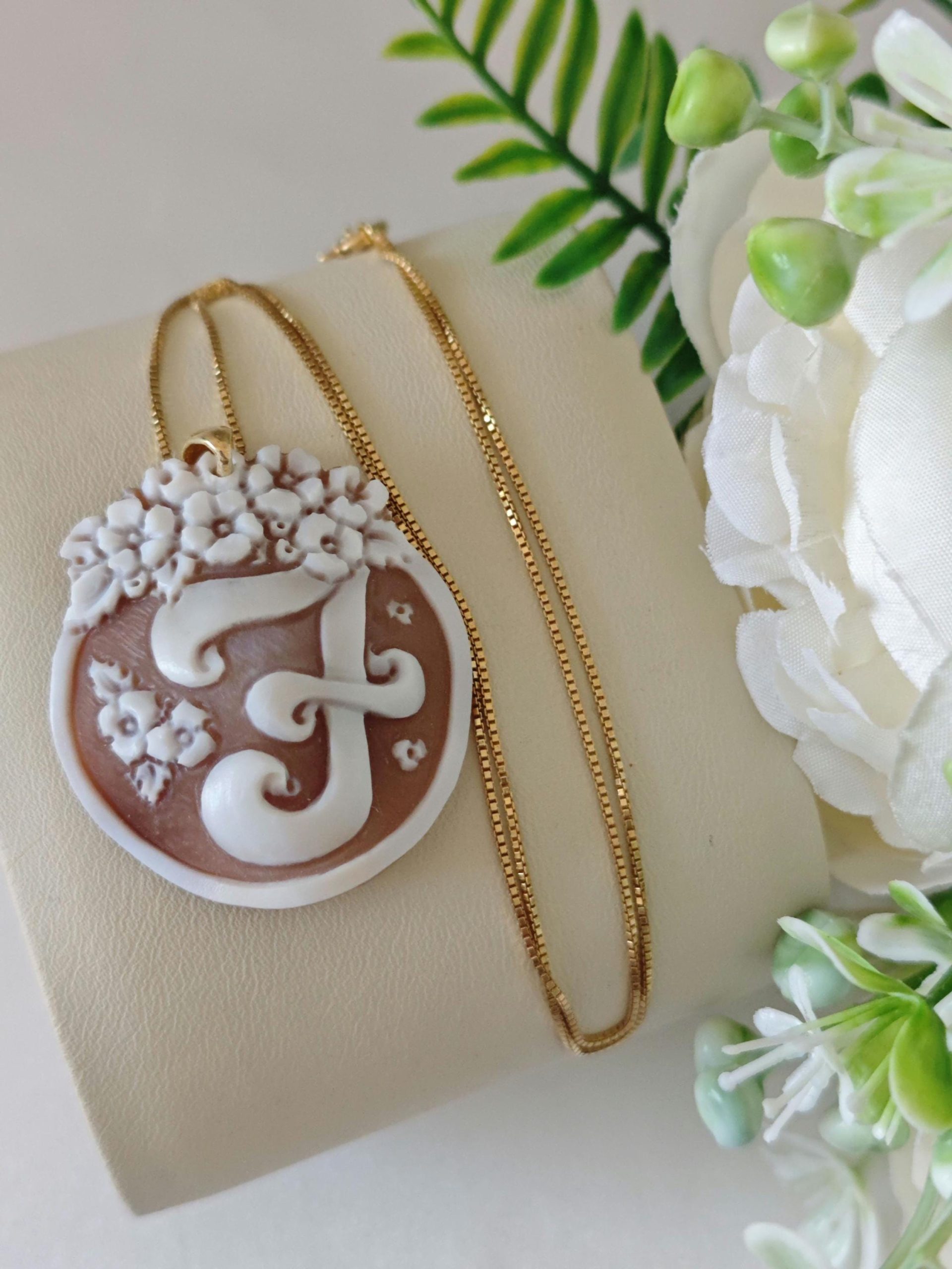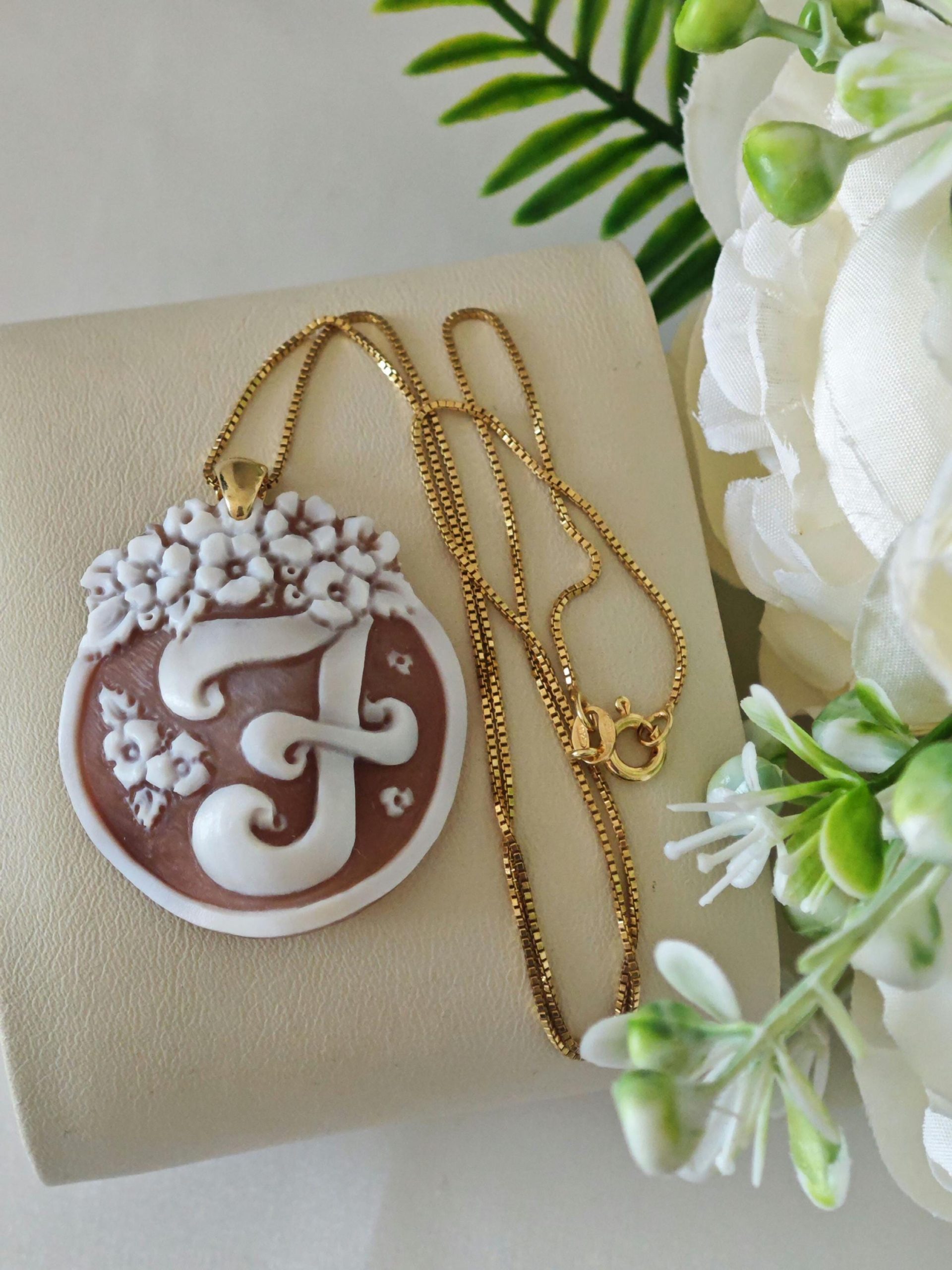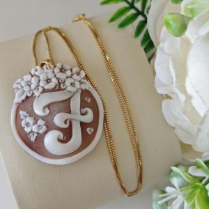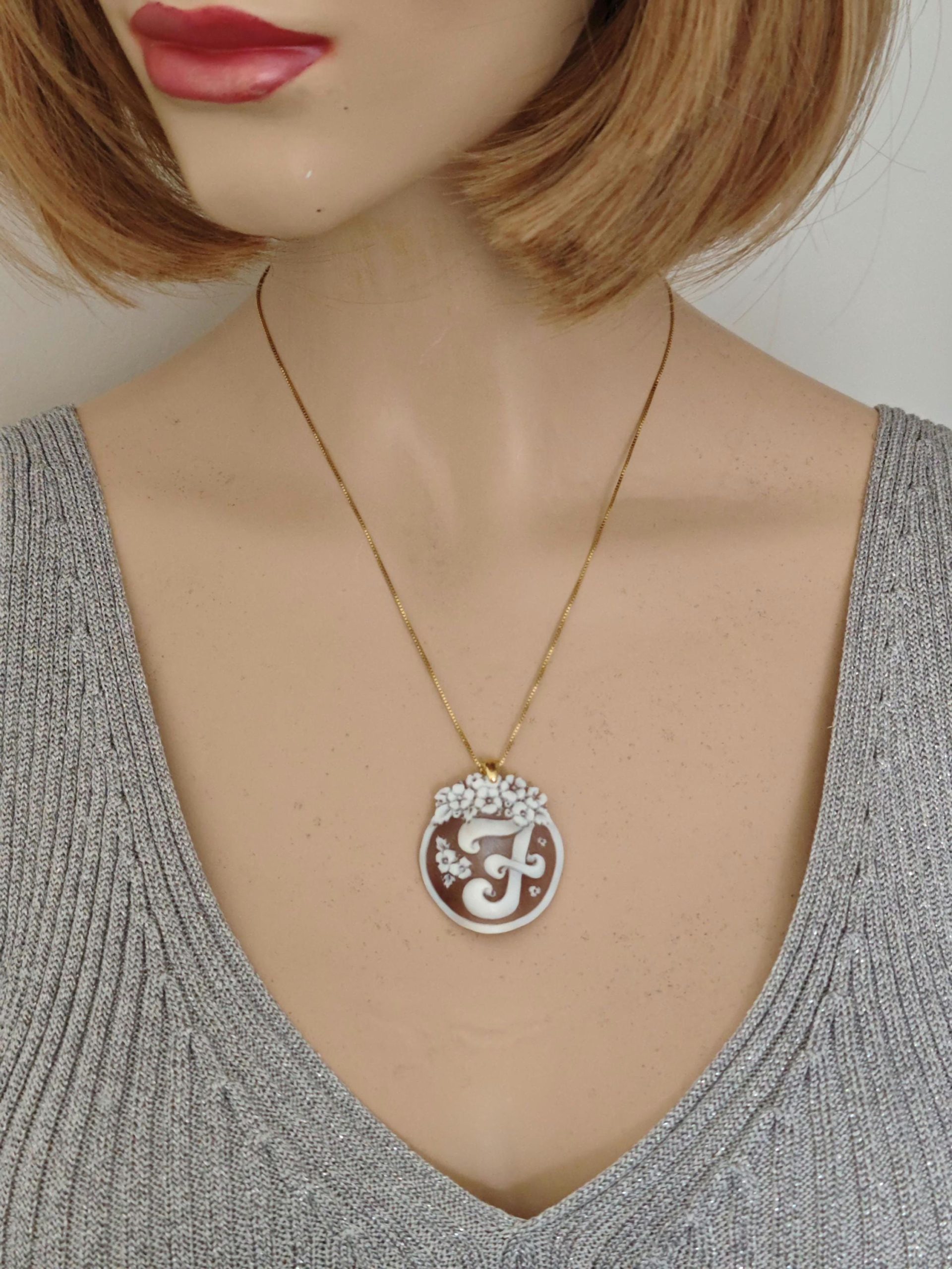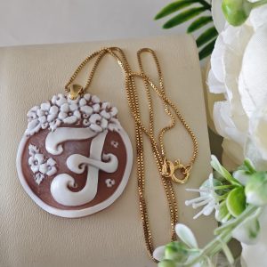 Collana con pendente iniziale “F” in cammeo conchiglia sardonica scolpito a mano a Torre del 4×3,5 cm dimensioni.
