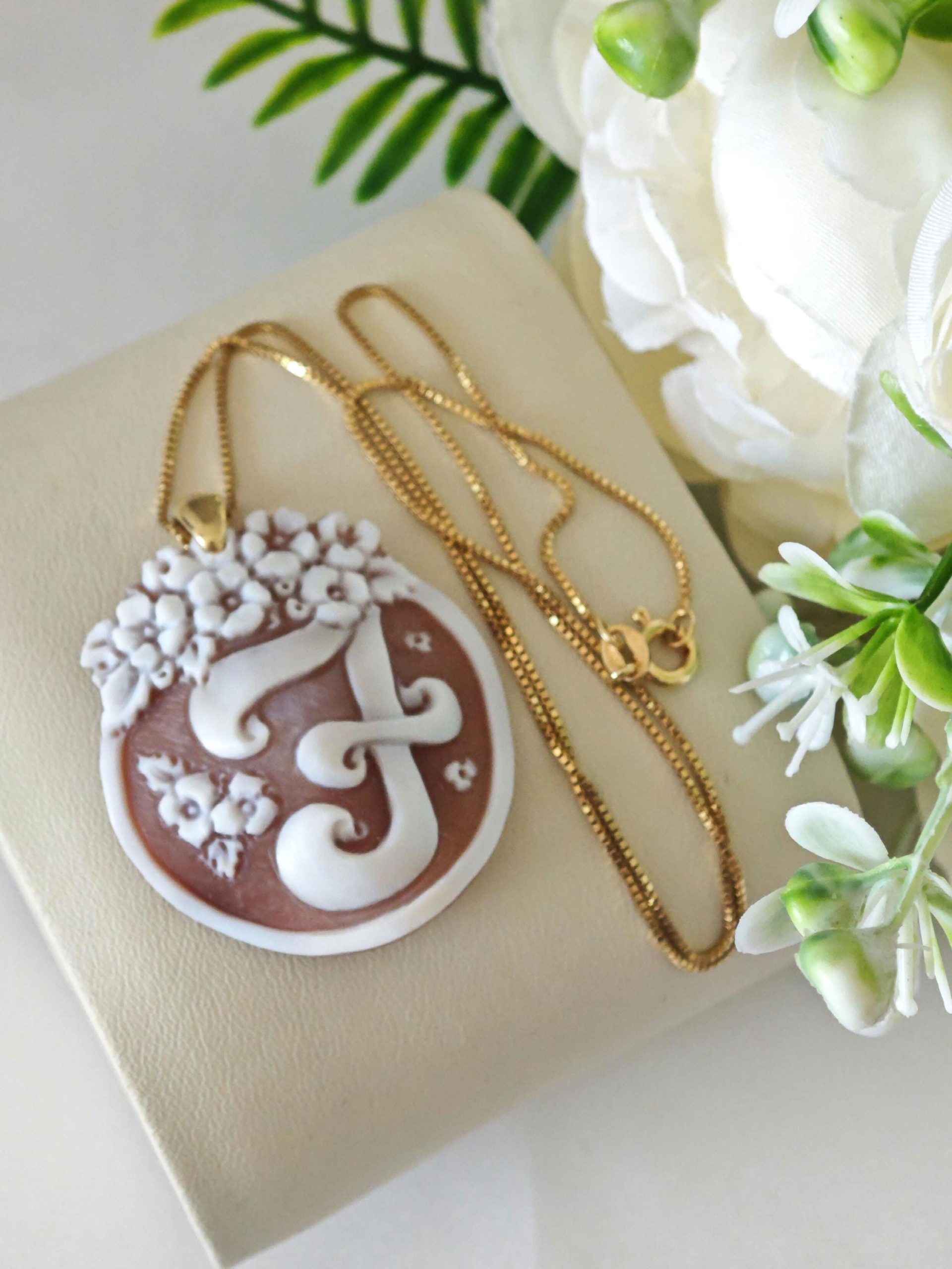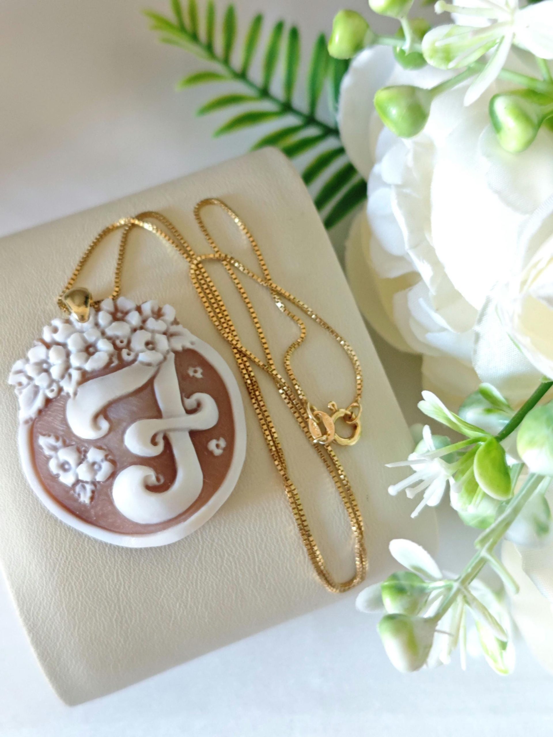 Collana con iniziale tuo nome cammeo conchiglia sardonica e catena argento 925 placcato oro, gioielli italiani