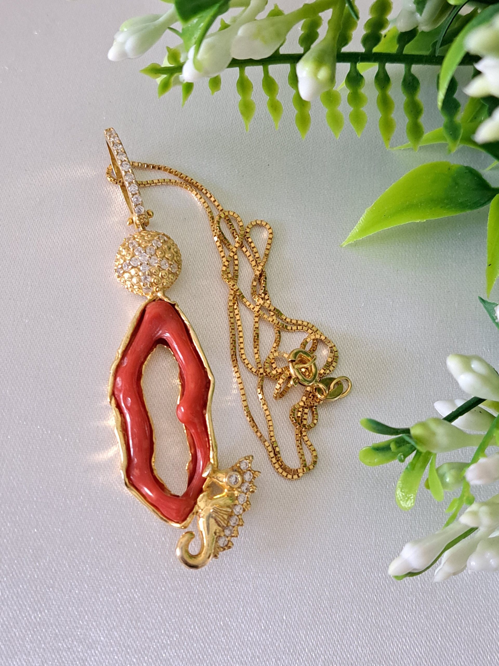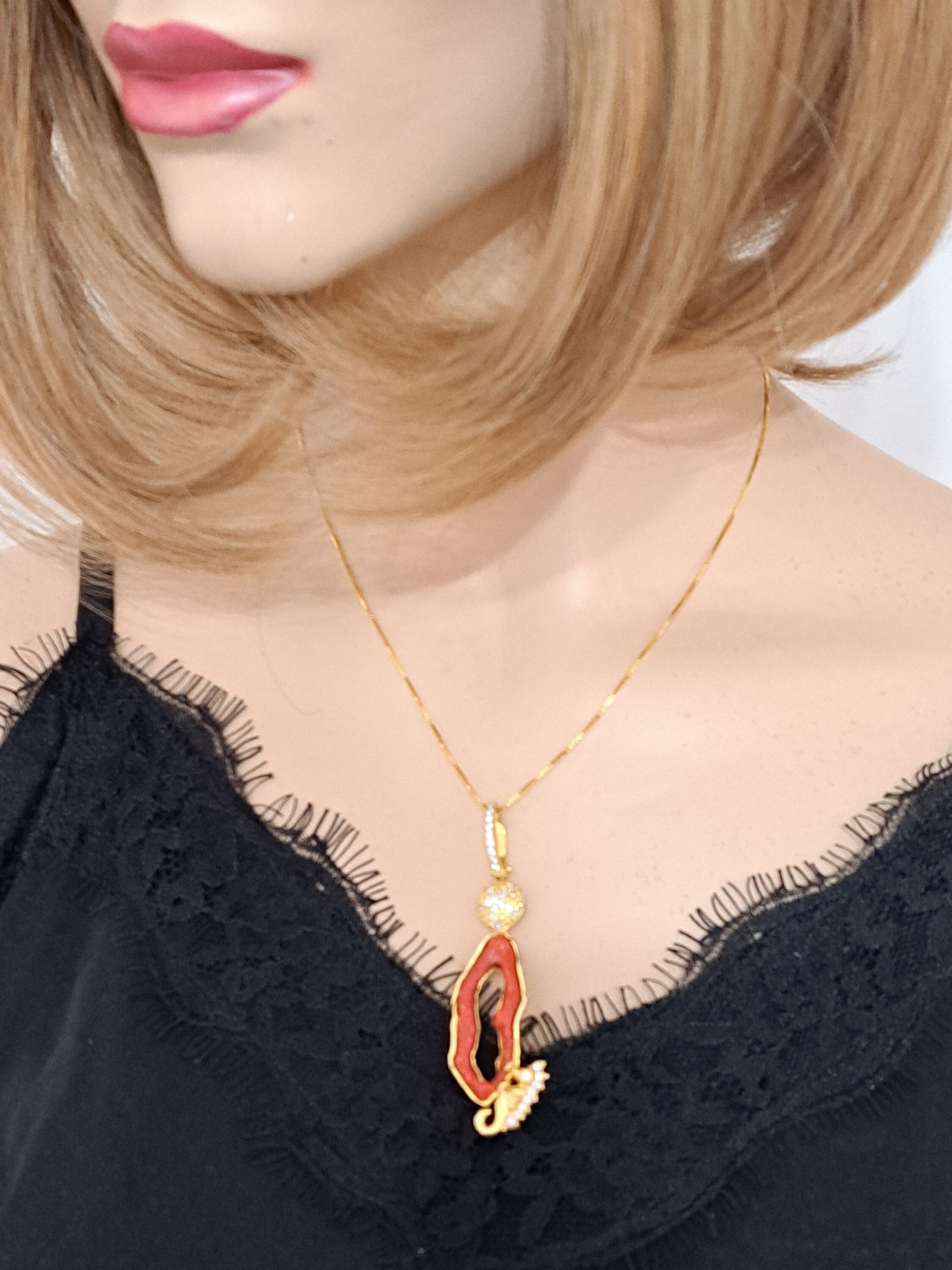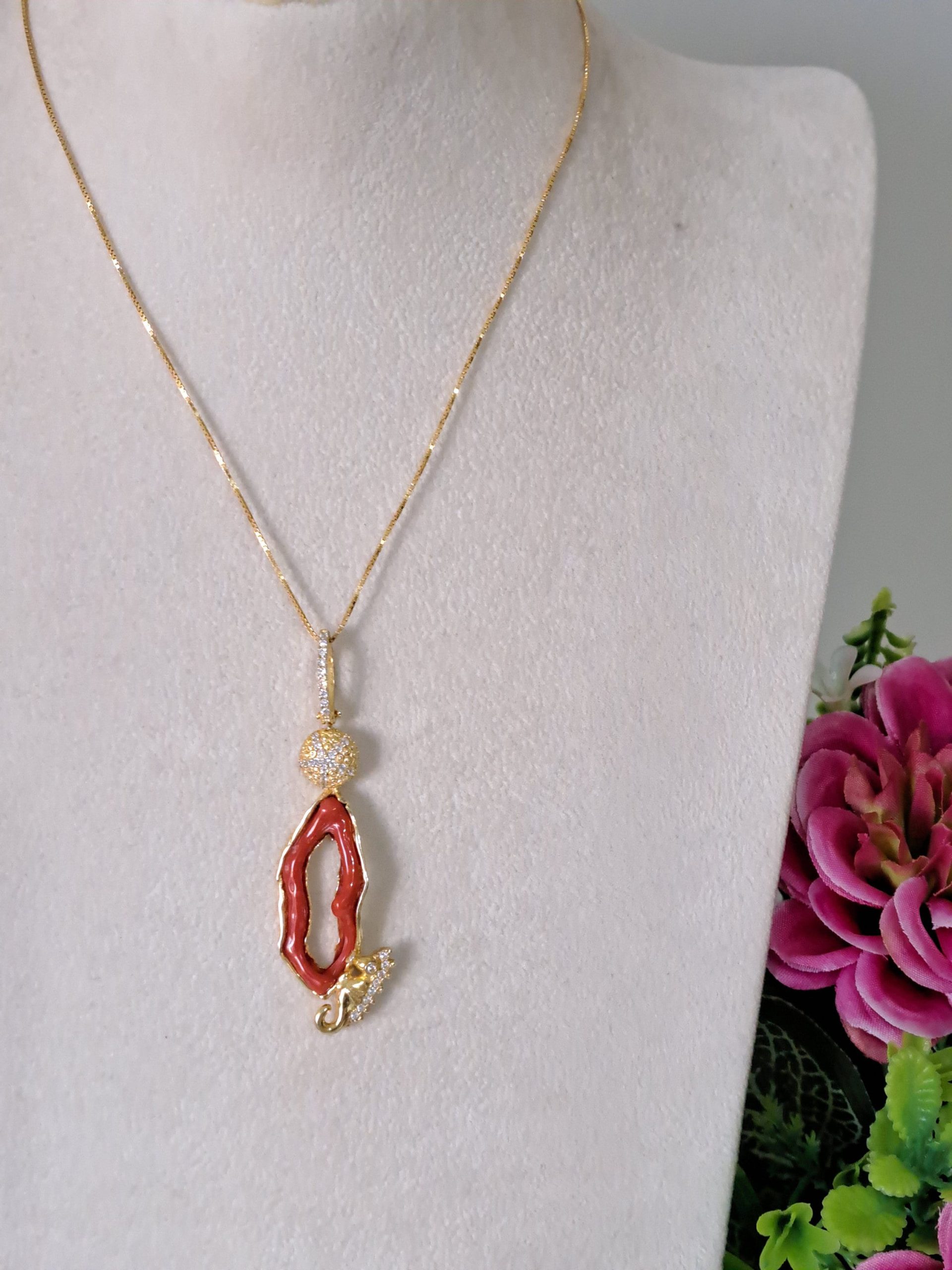 Collana con catenina e Pendente artigianale con cavalluccio marino in argento 925 placcato oro con zirconi e corallo rosso mediterraneo naturale realizzata a mano a Torre del greco, 7 cm dimensioni.