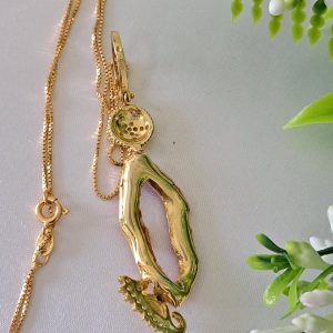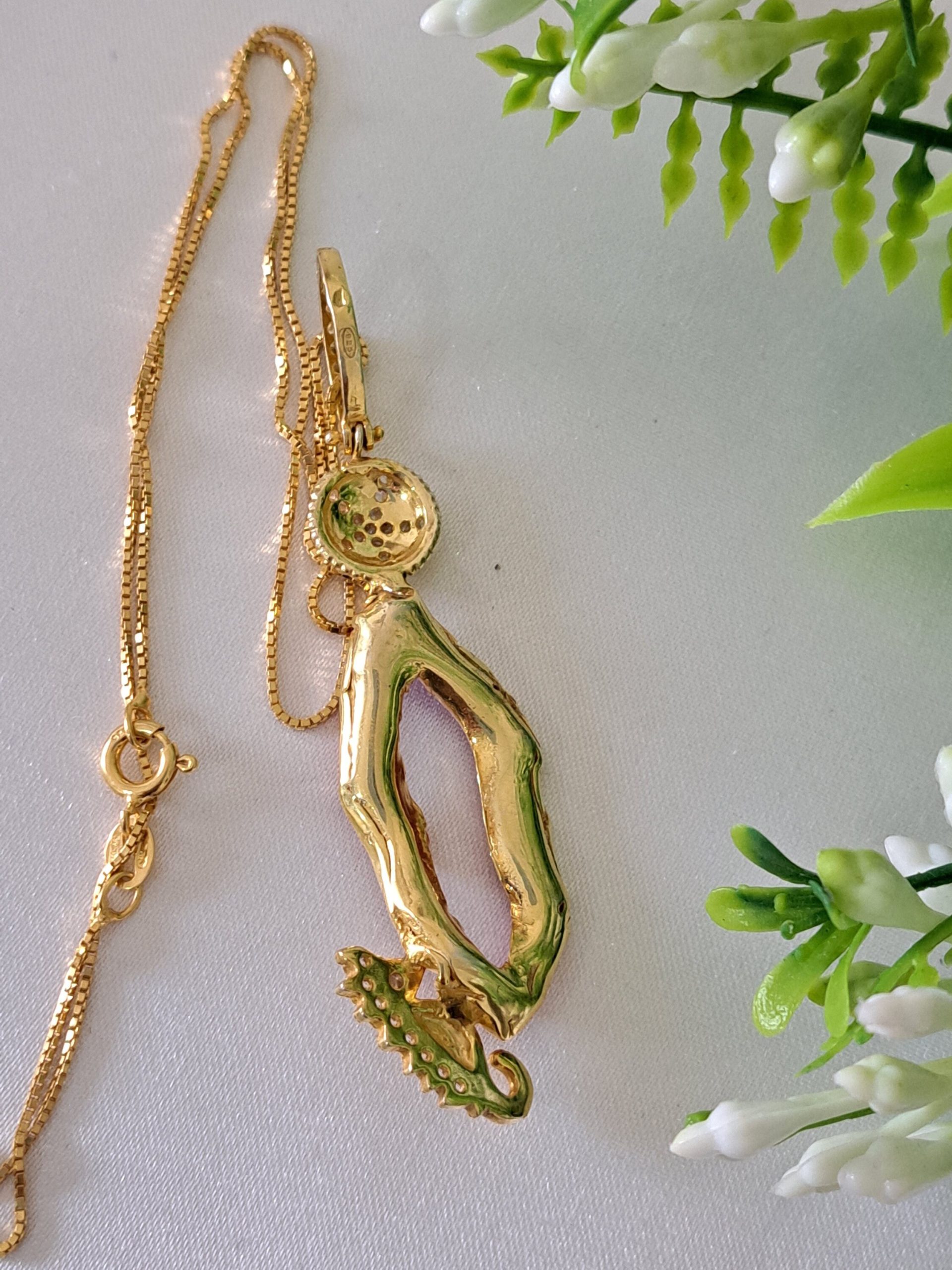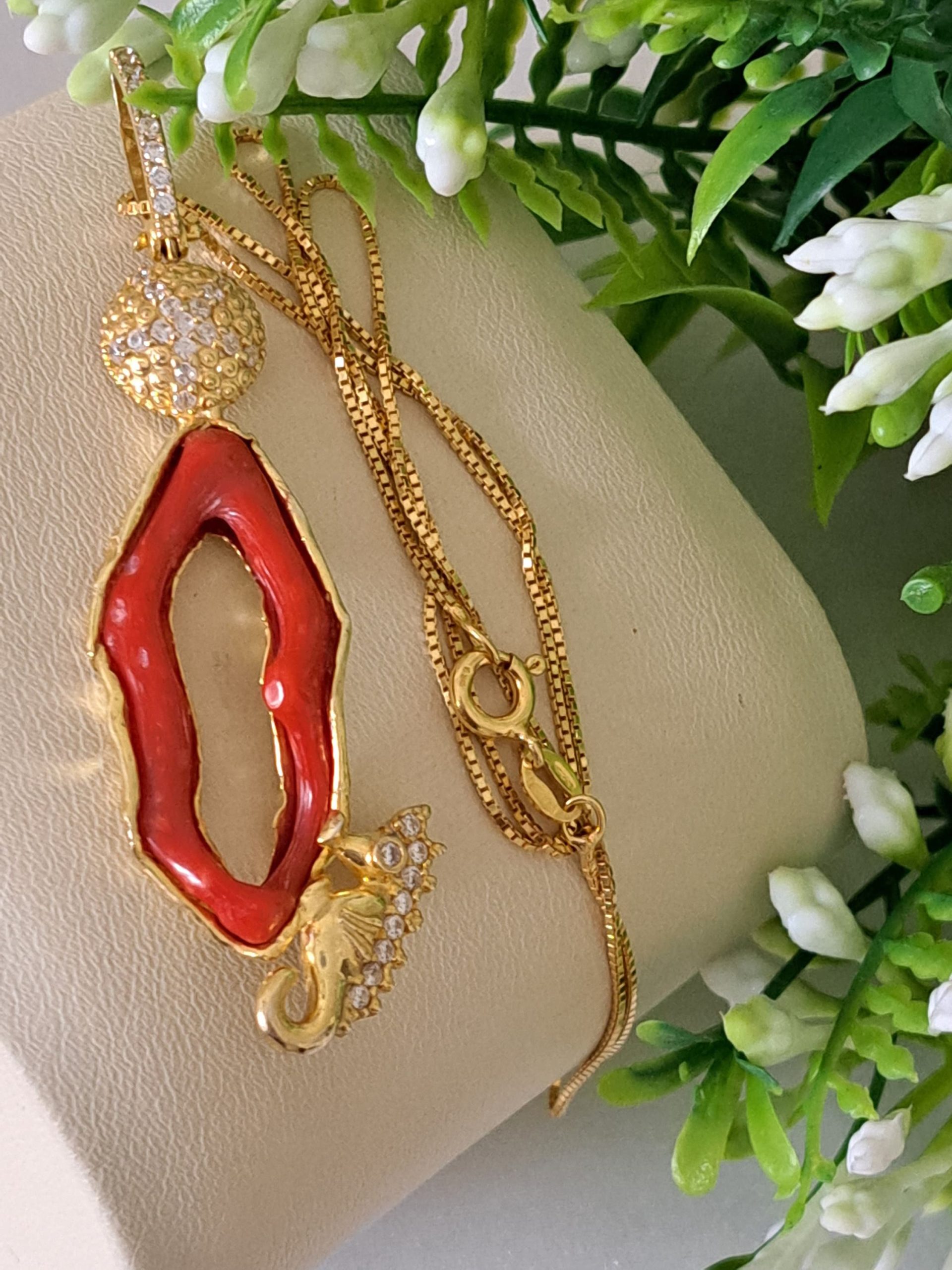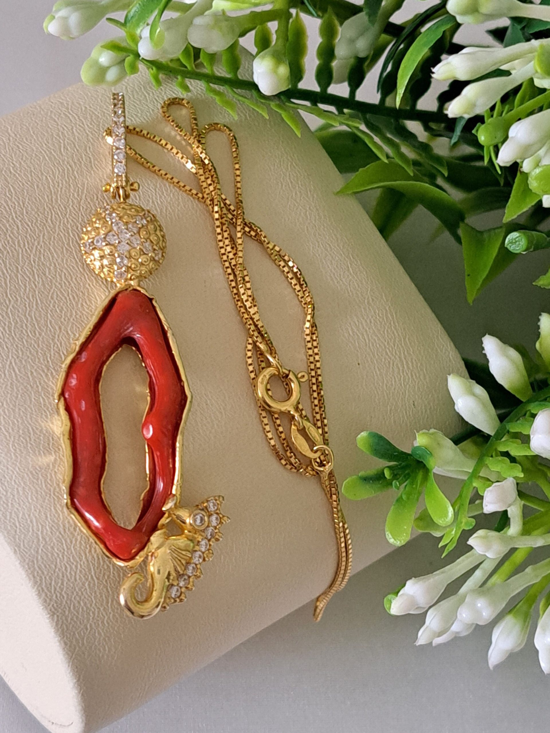Collana con catenina e Pendente artigianale con cavalluccio marino in argento 925 placcato oro con zirconi e corallo rosso mediterraneo naturale realizzata a mano a Torre del greco, 7 cm dimensioni.