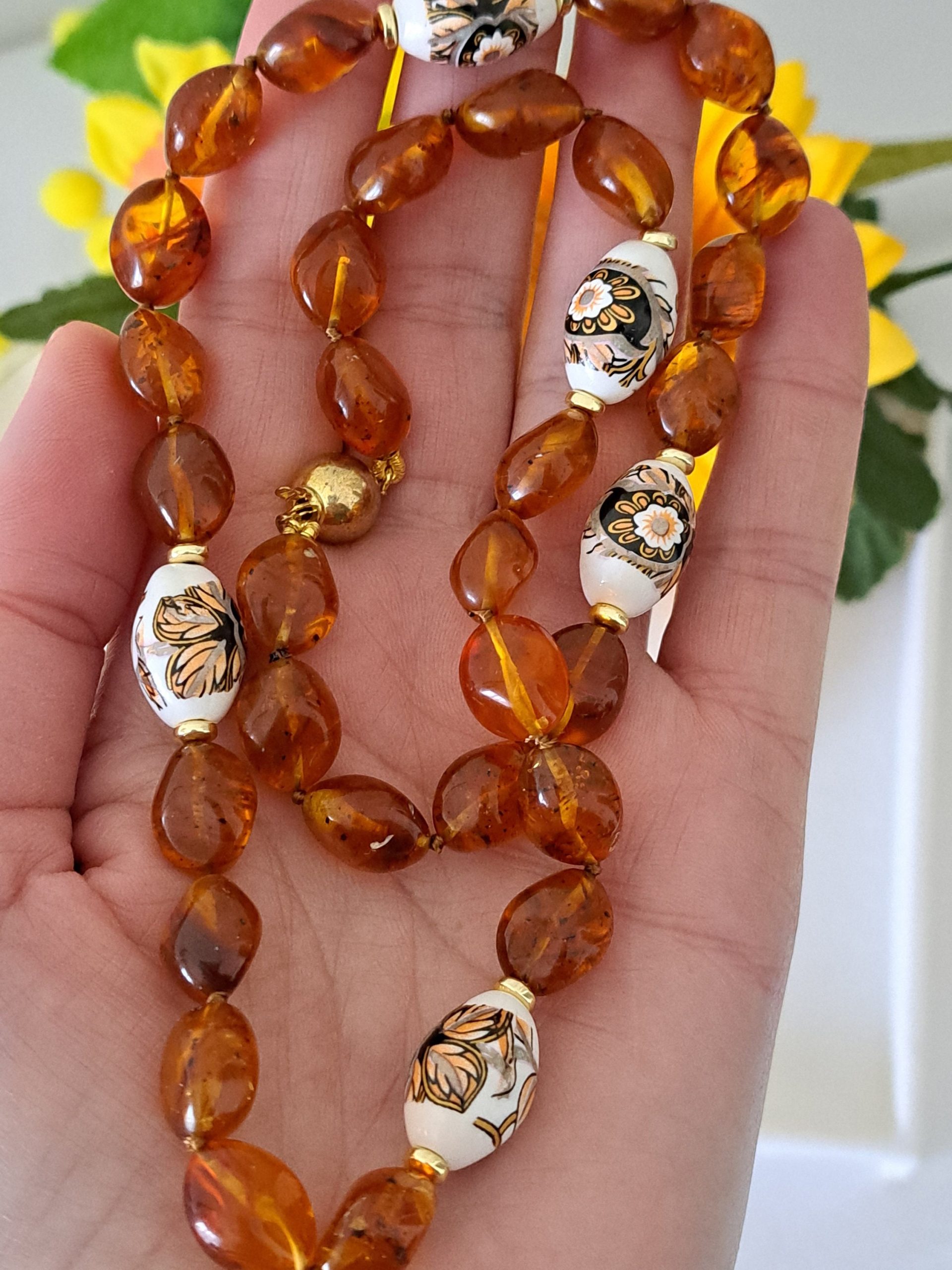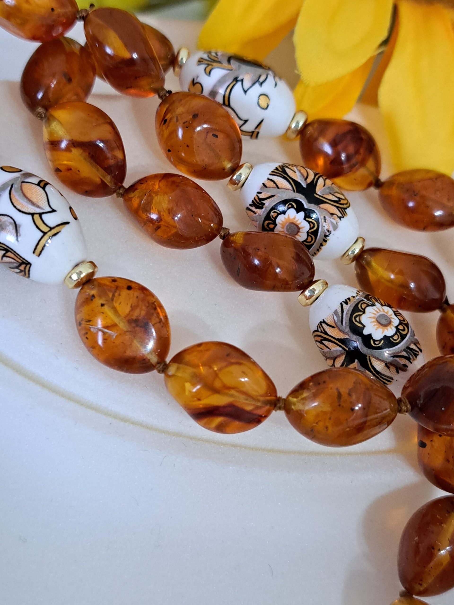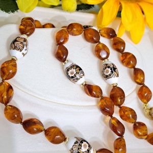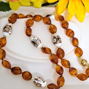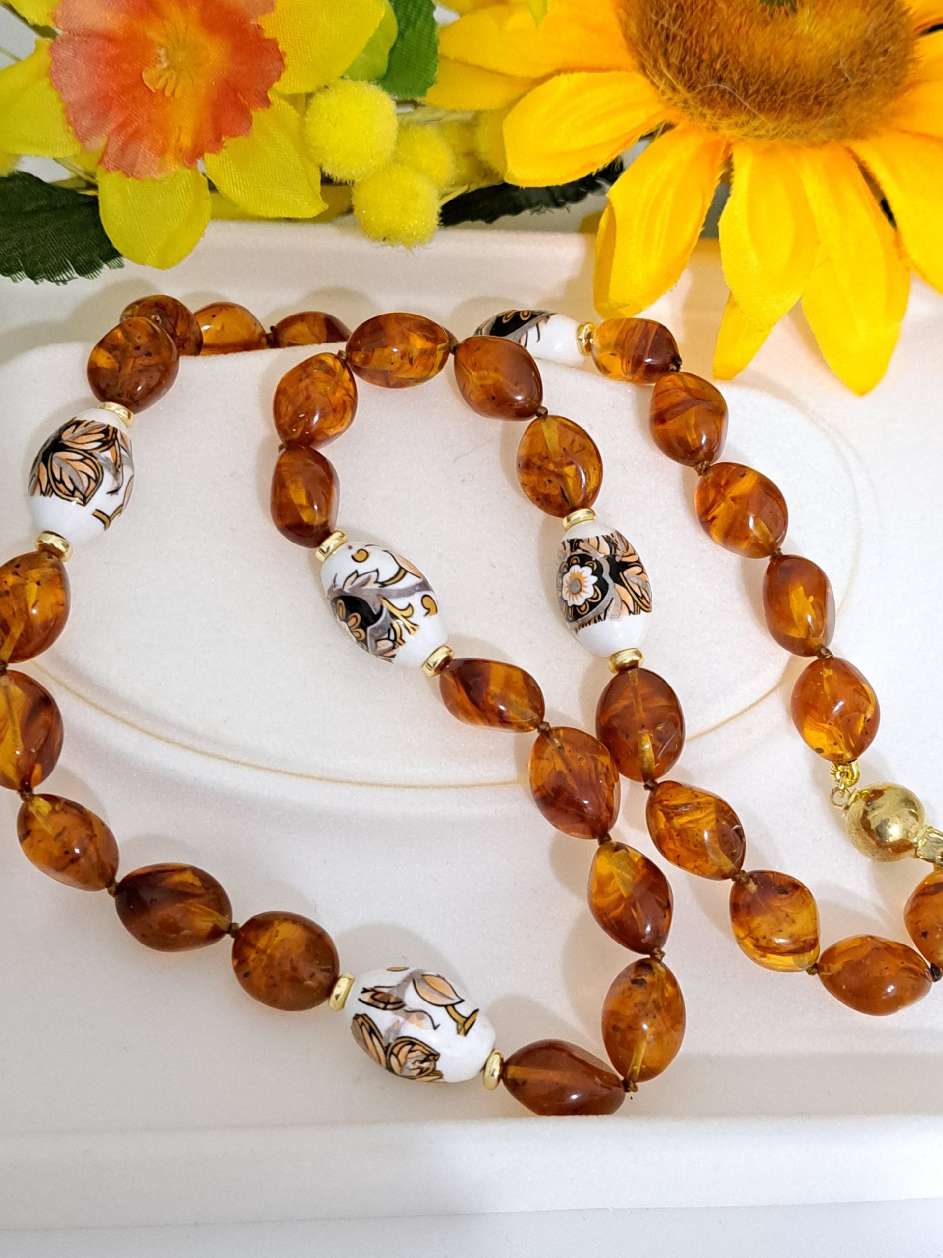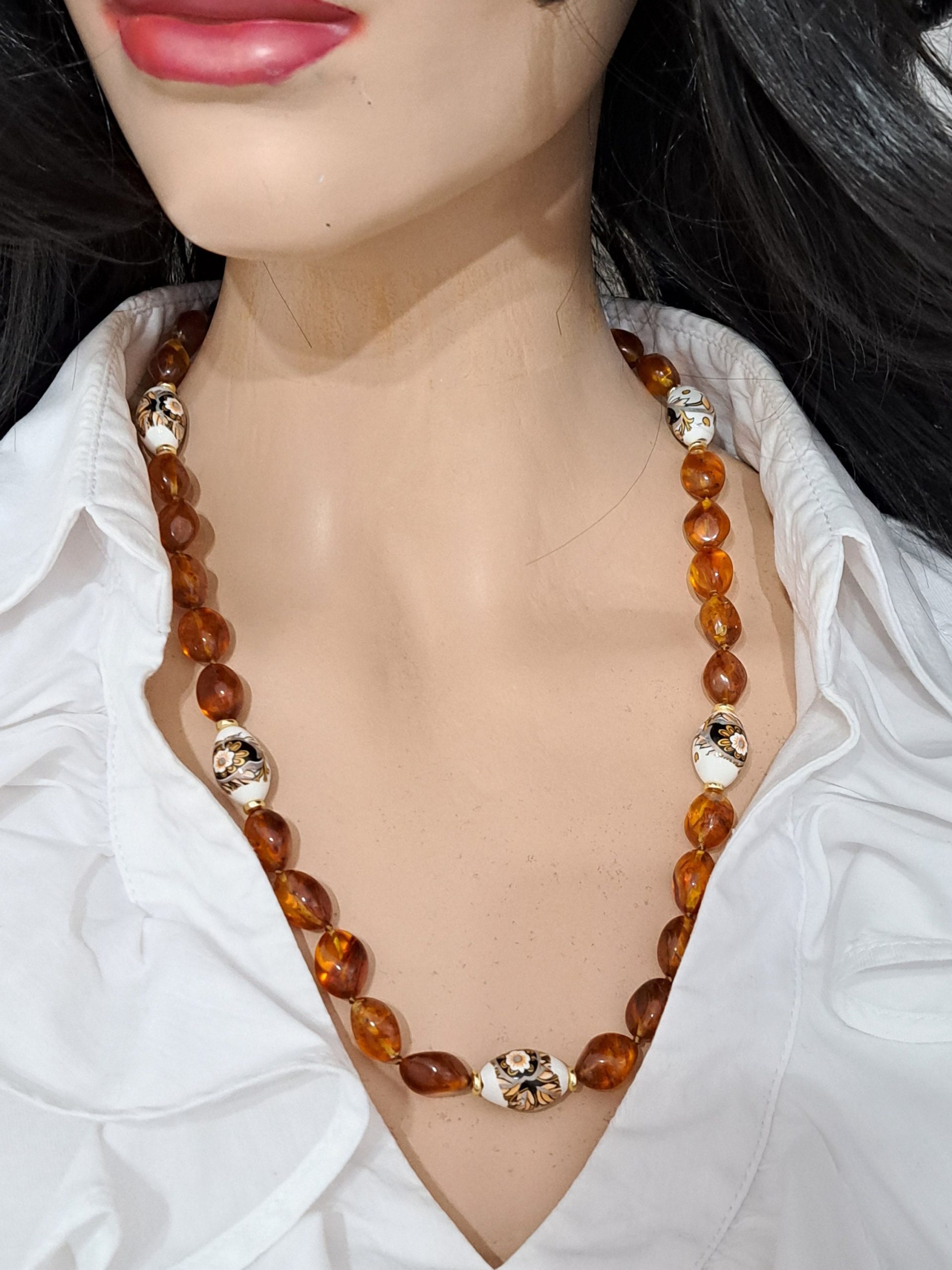 Collana con perle ambra imitazione e perle porcellana dipinta