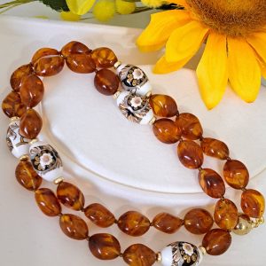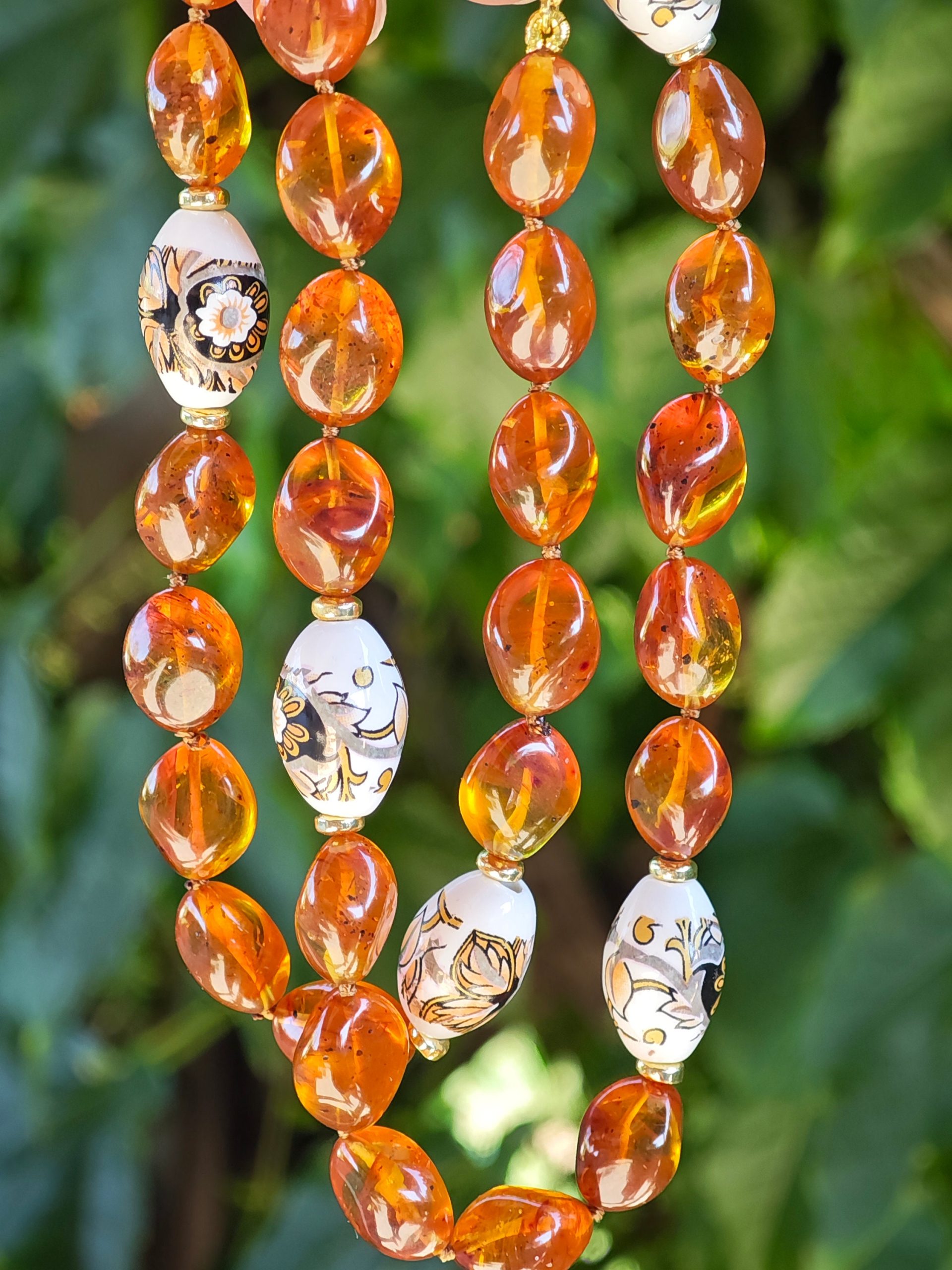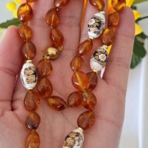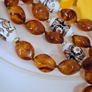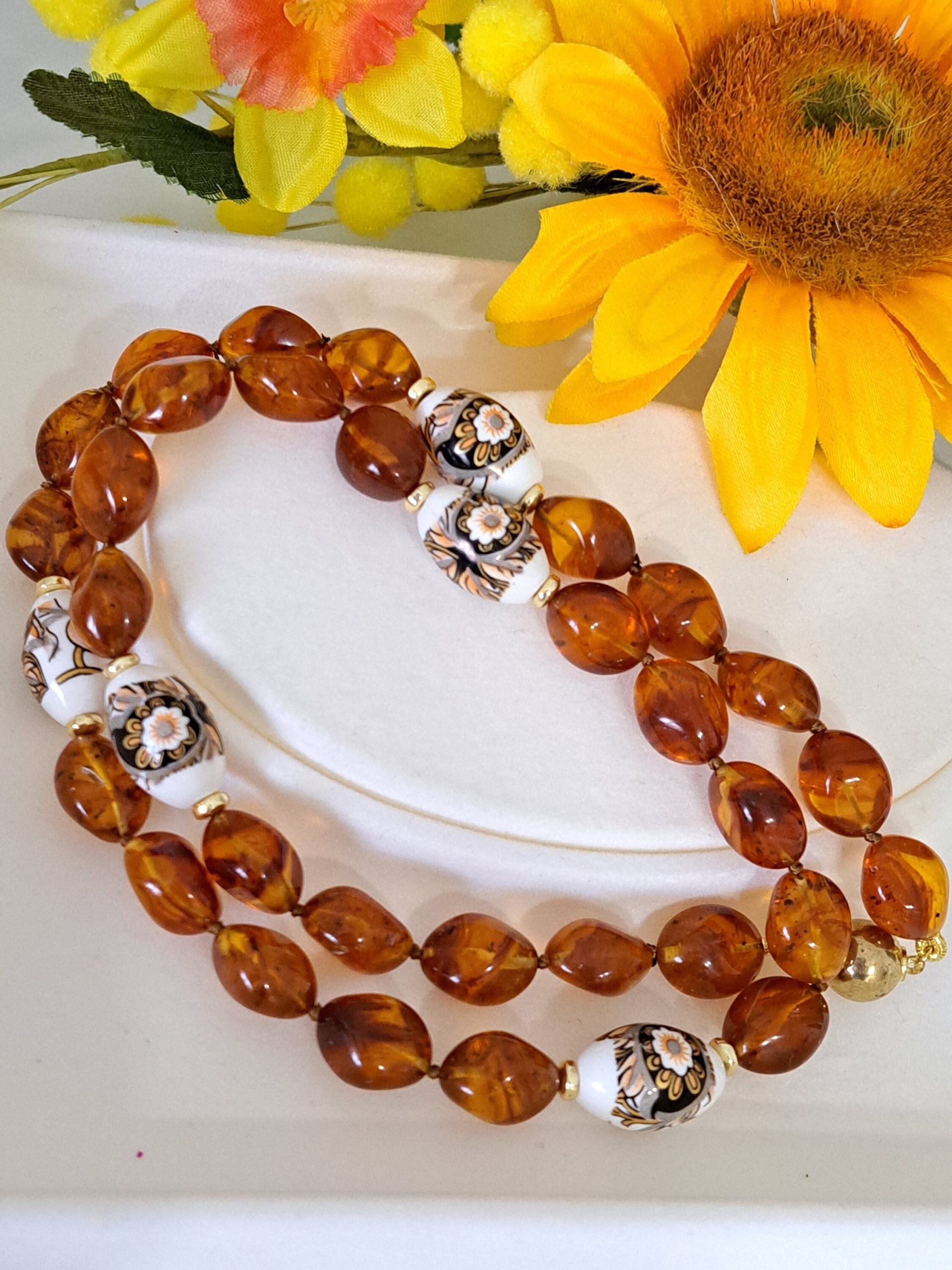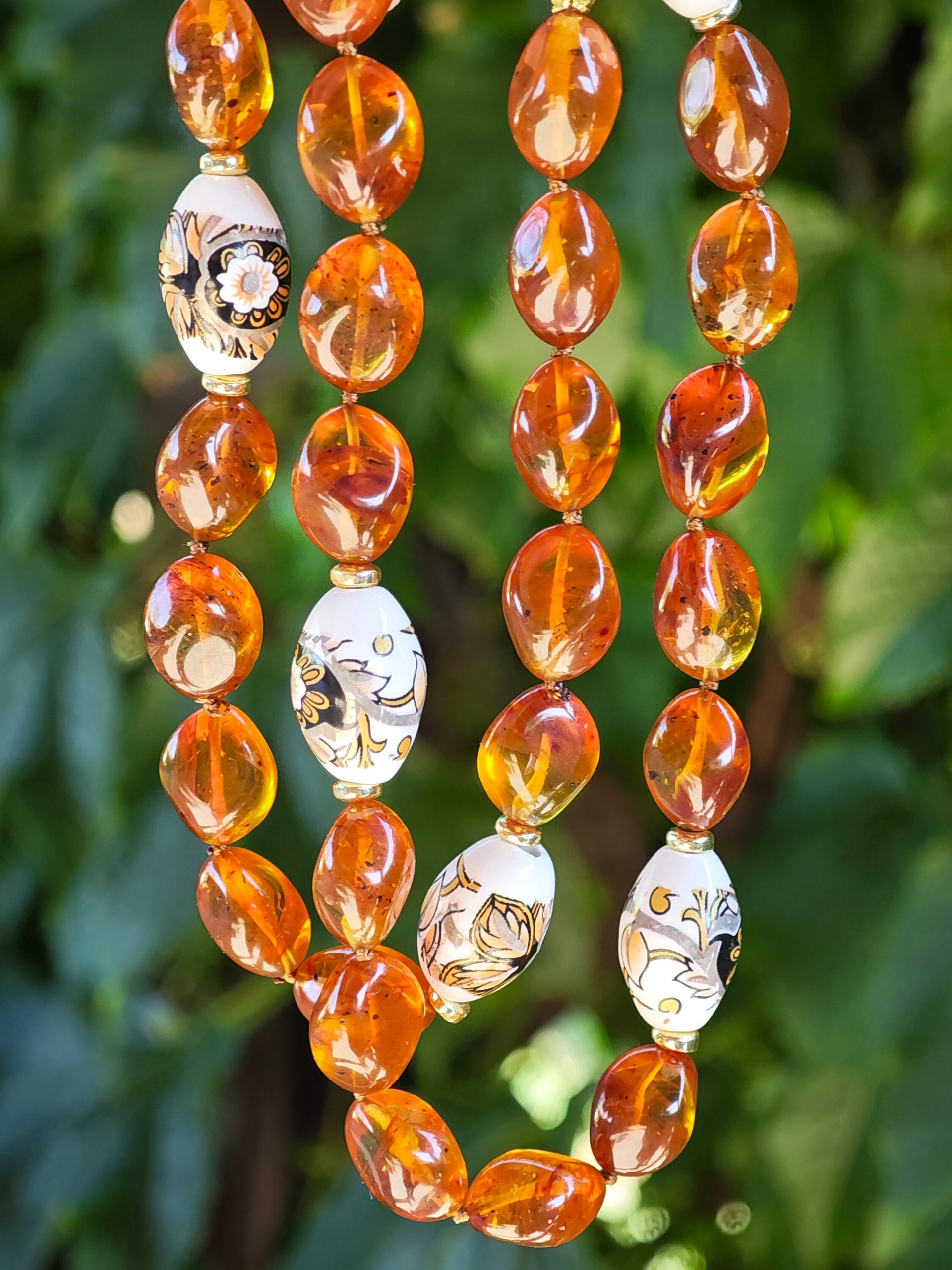 Collana con perle ambra imitazione e perle porcellana dipinta