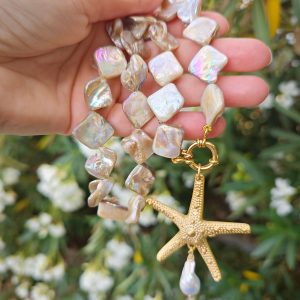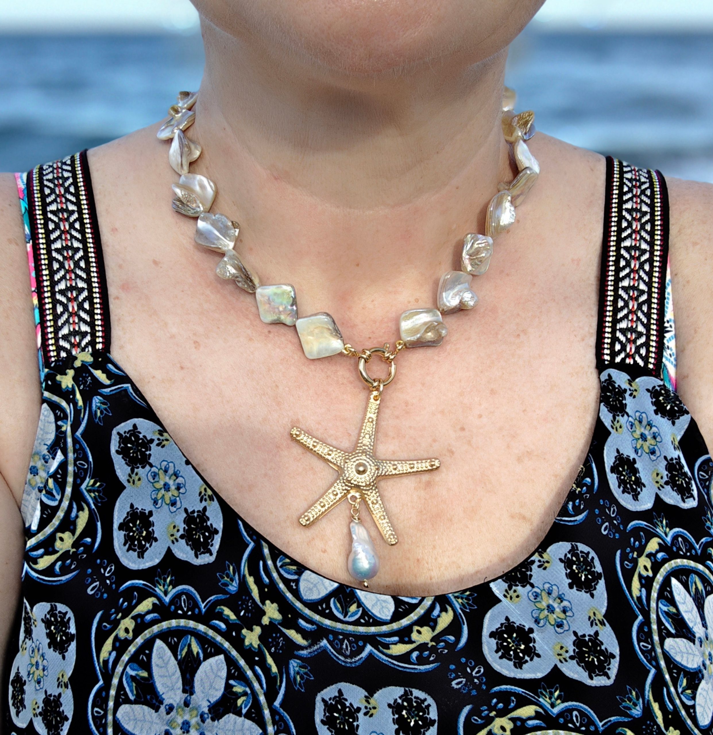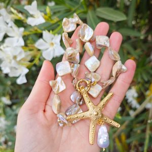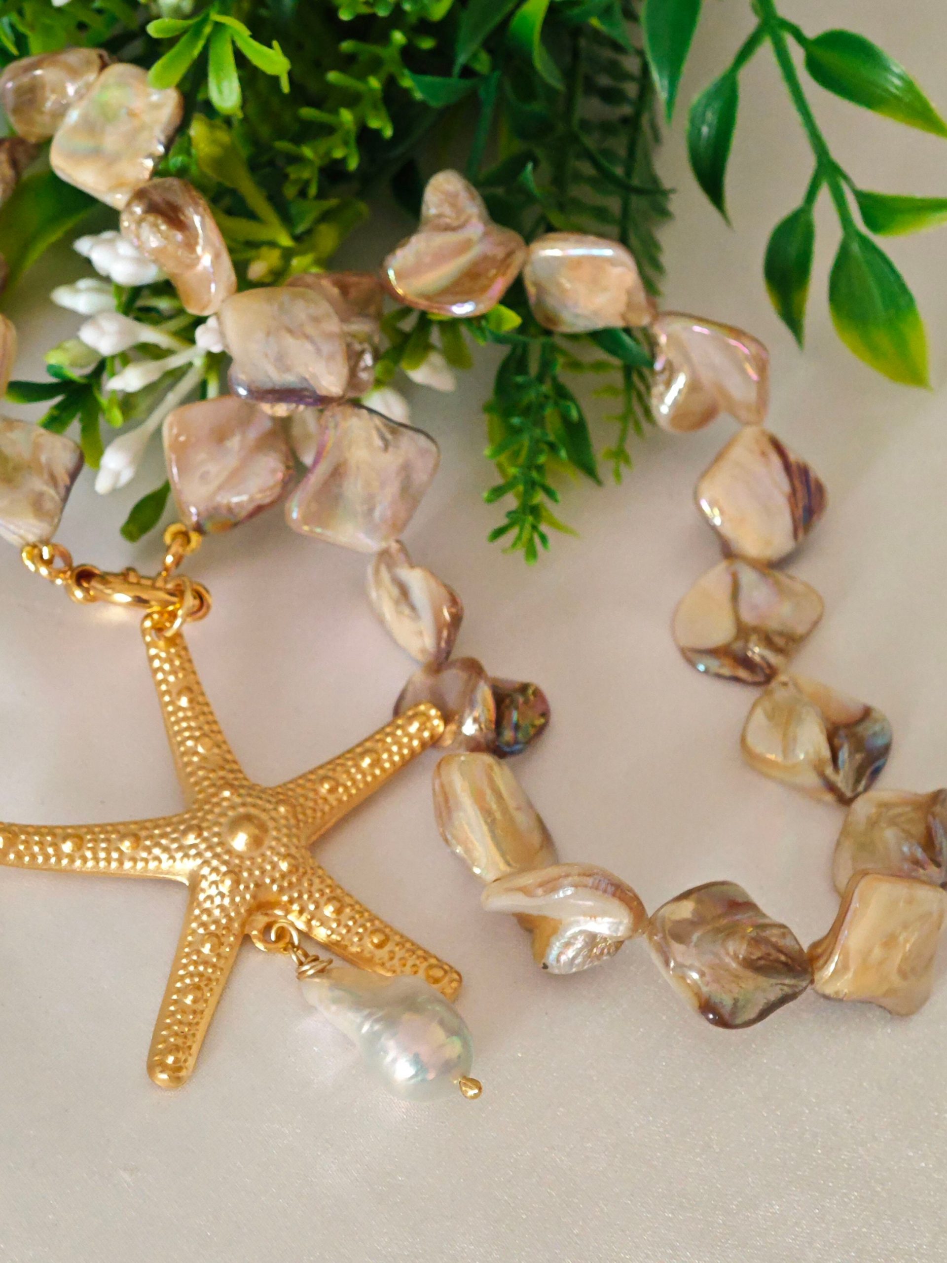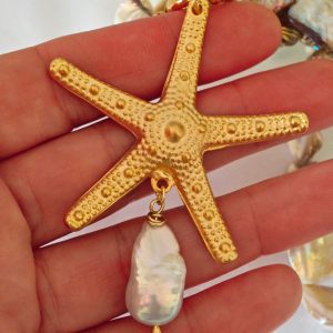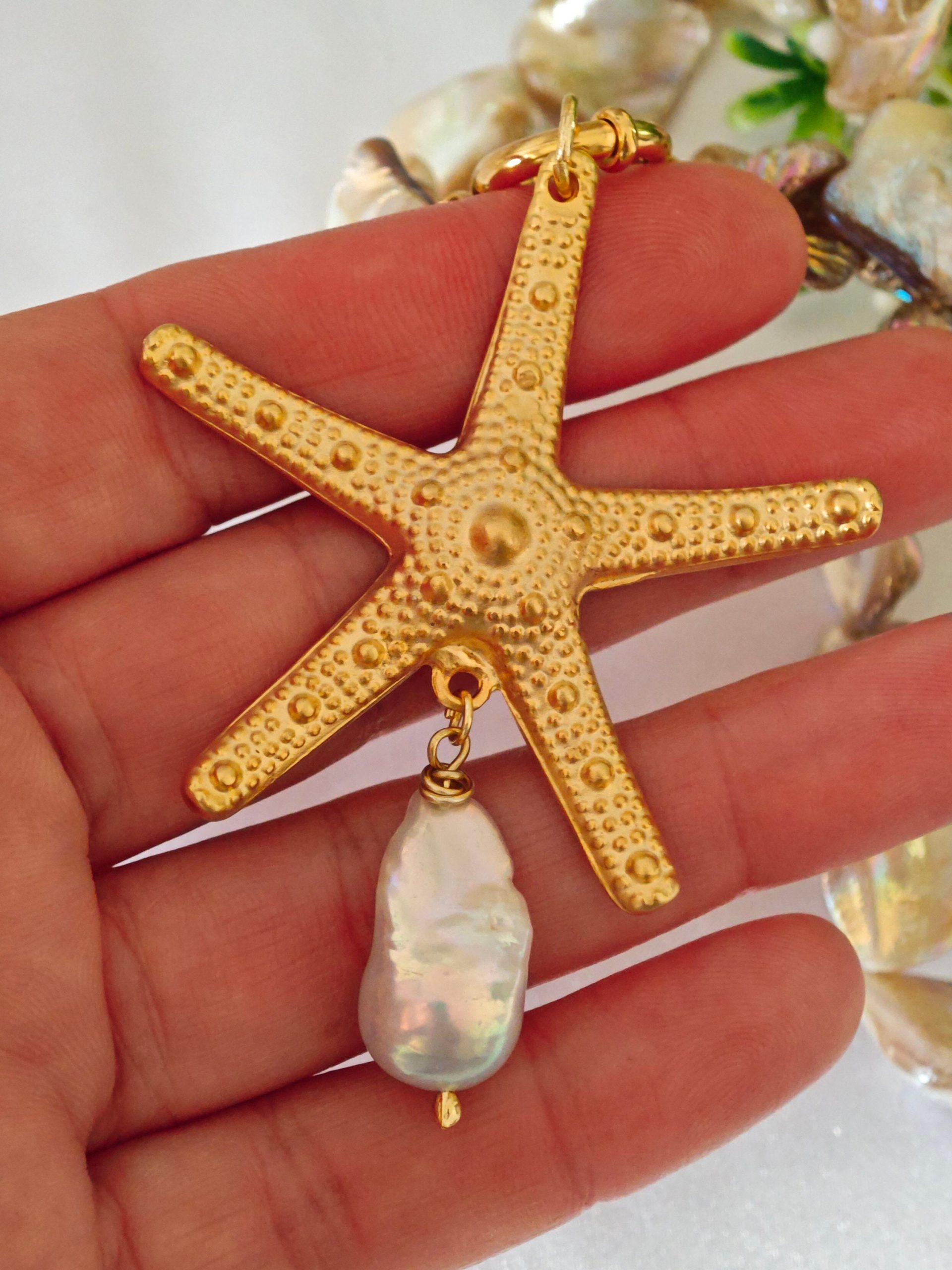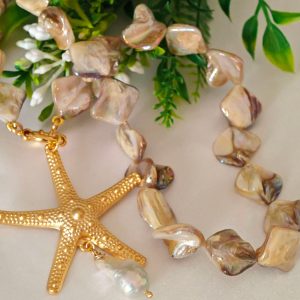 Collana girocollo annodata a mano con perle conchiglia madreperla e pendente stella marina in ottone dorato grande 5,5 cm diametro ,con perla bianca barocca, chiusura a moschettone marinaro in ottone dorato , lunghezza 45 cm