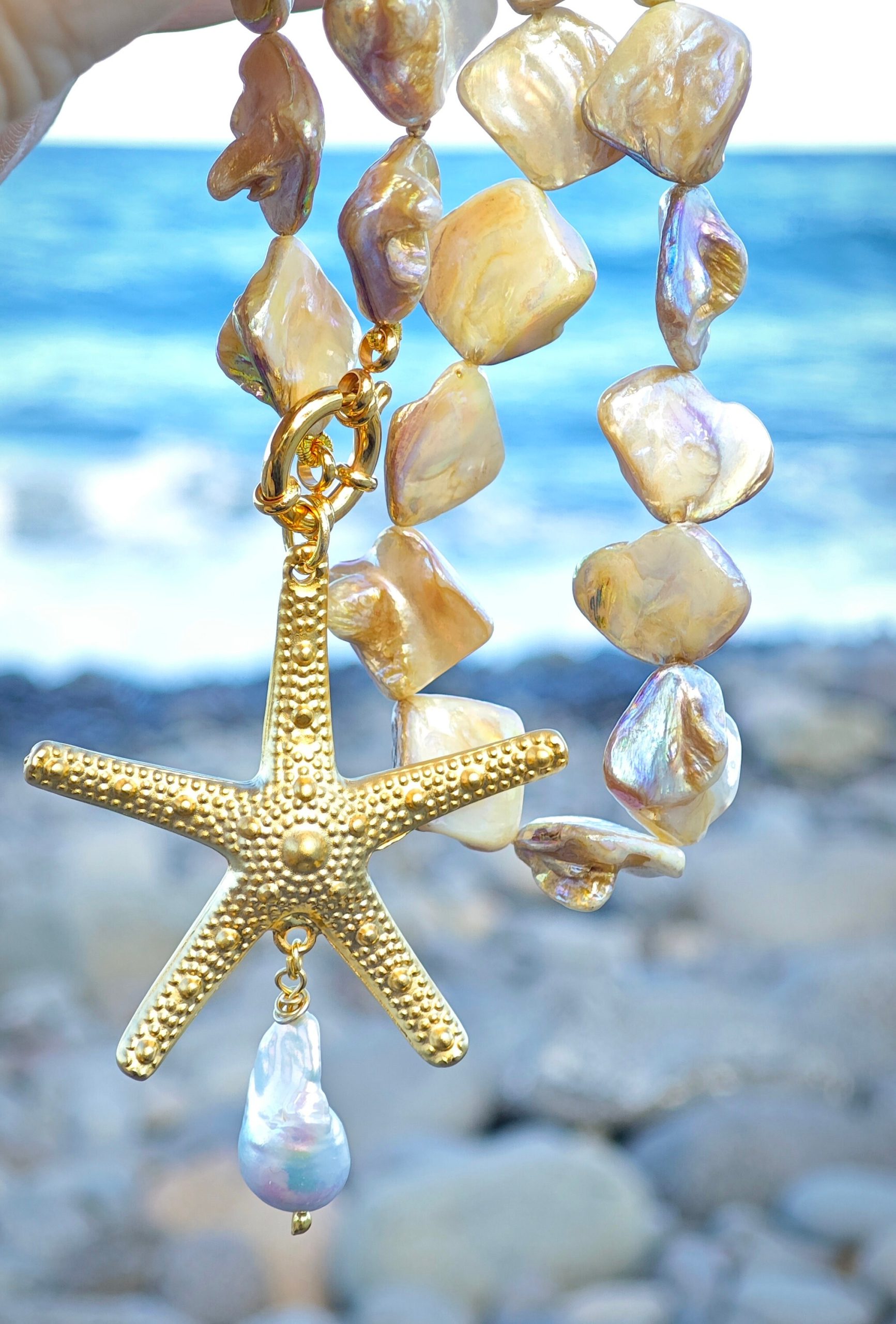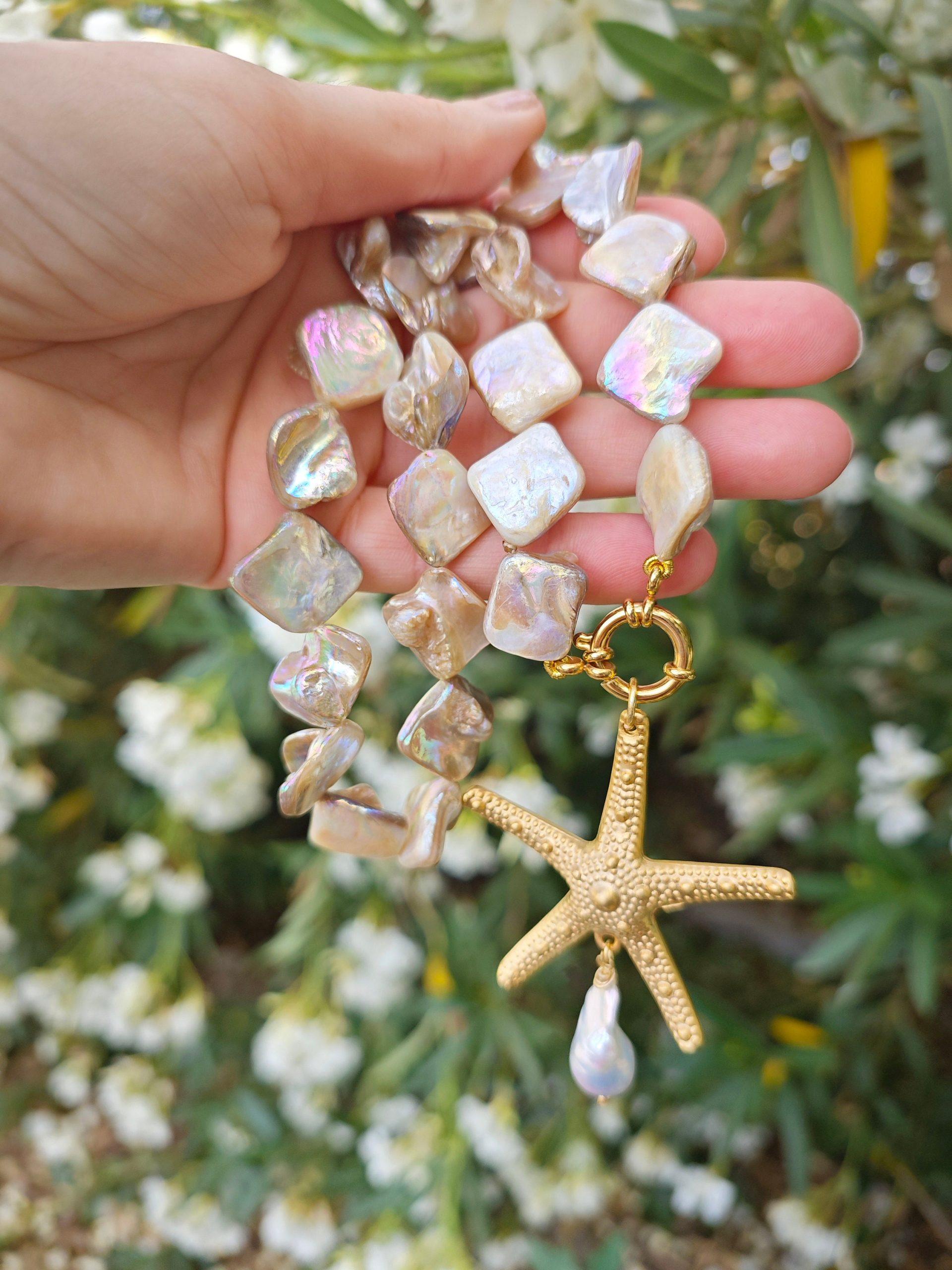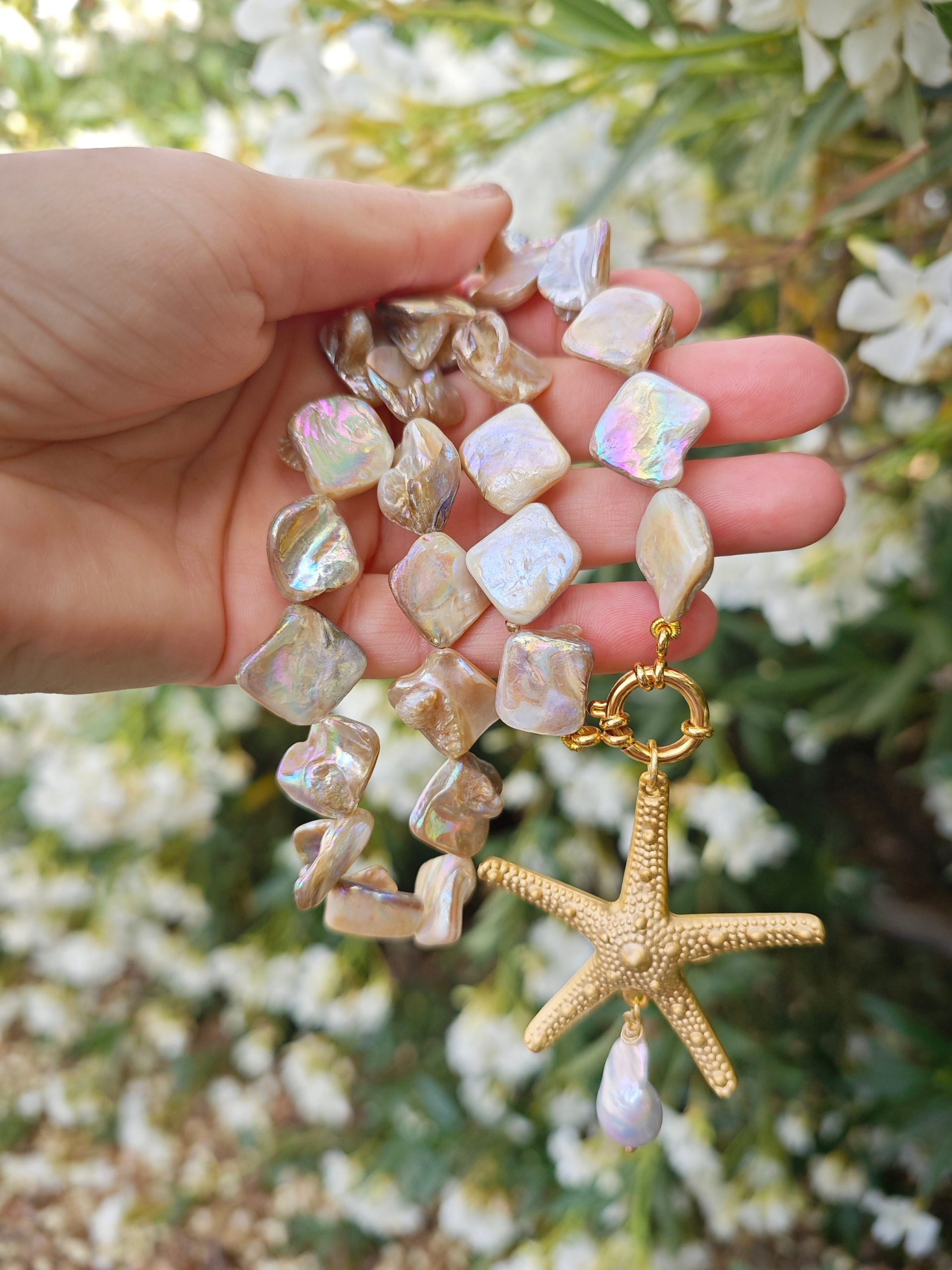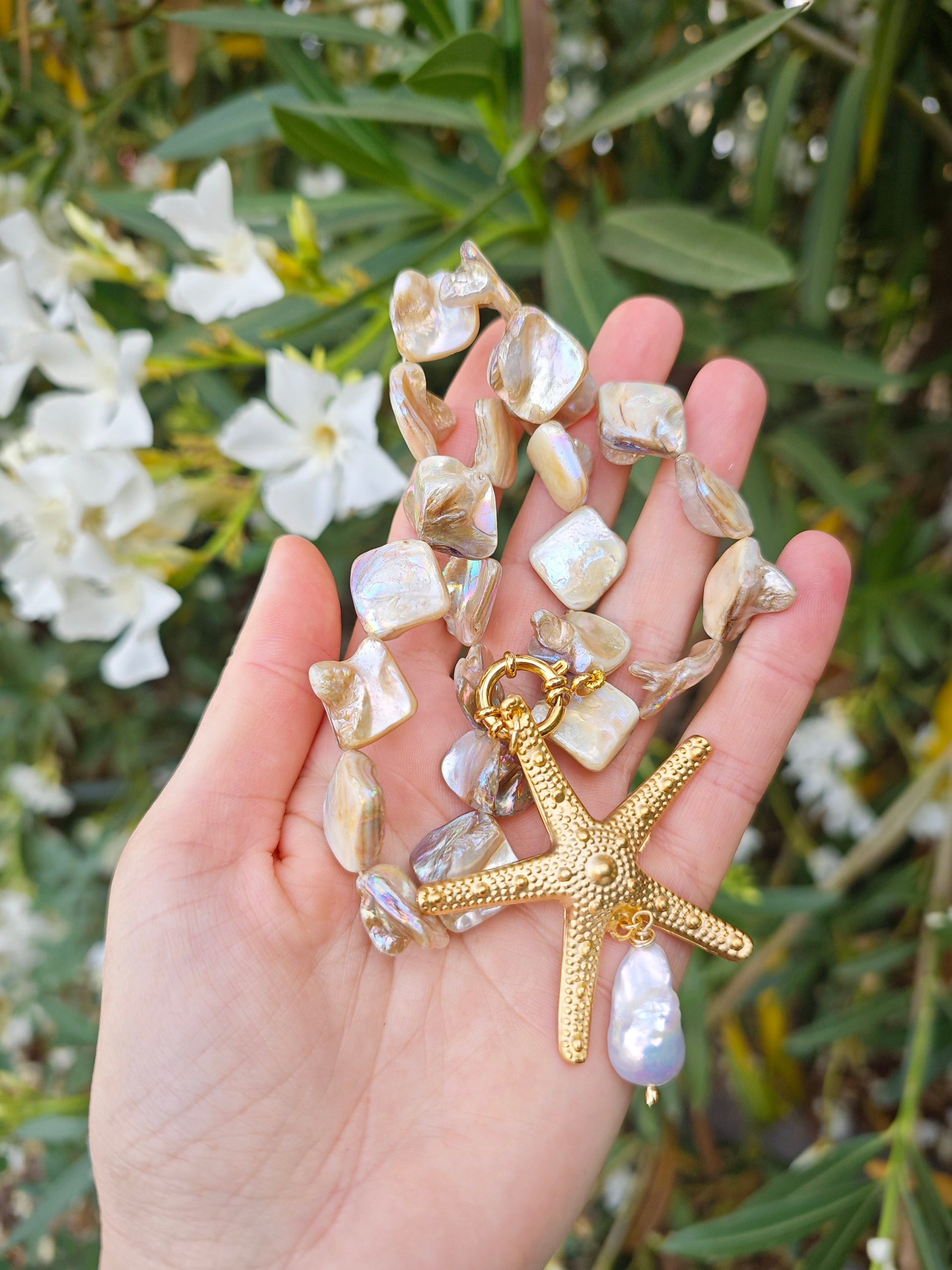 Collana girocollo annodata a mano con perle conchiglia madreperla e pendente stella marina in ottone dorato grande 5,5 cm diametro ,con perla bianca barocca, chiusura a moschettone marinaro in ottone dorato , lunghezza 45 cm