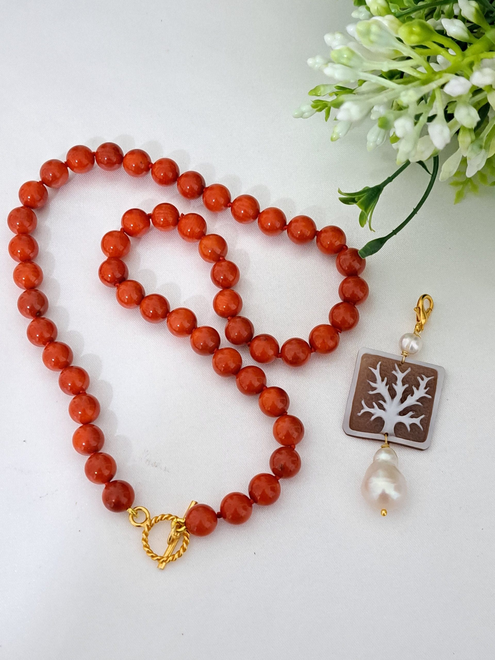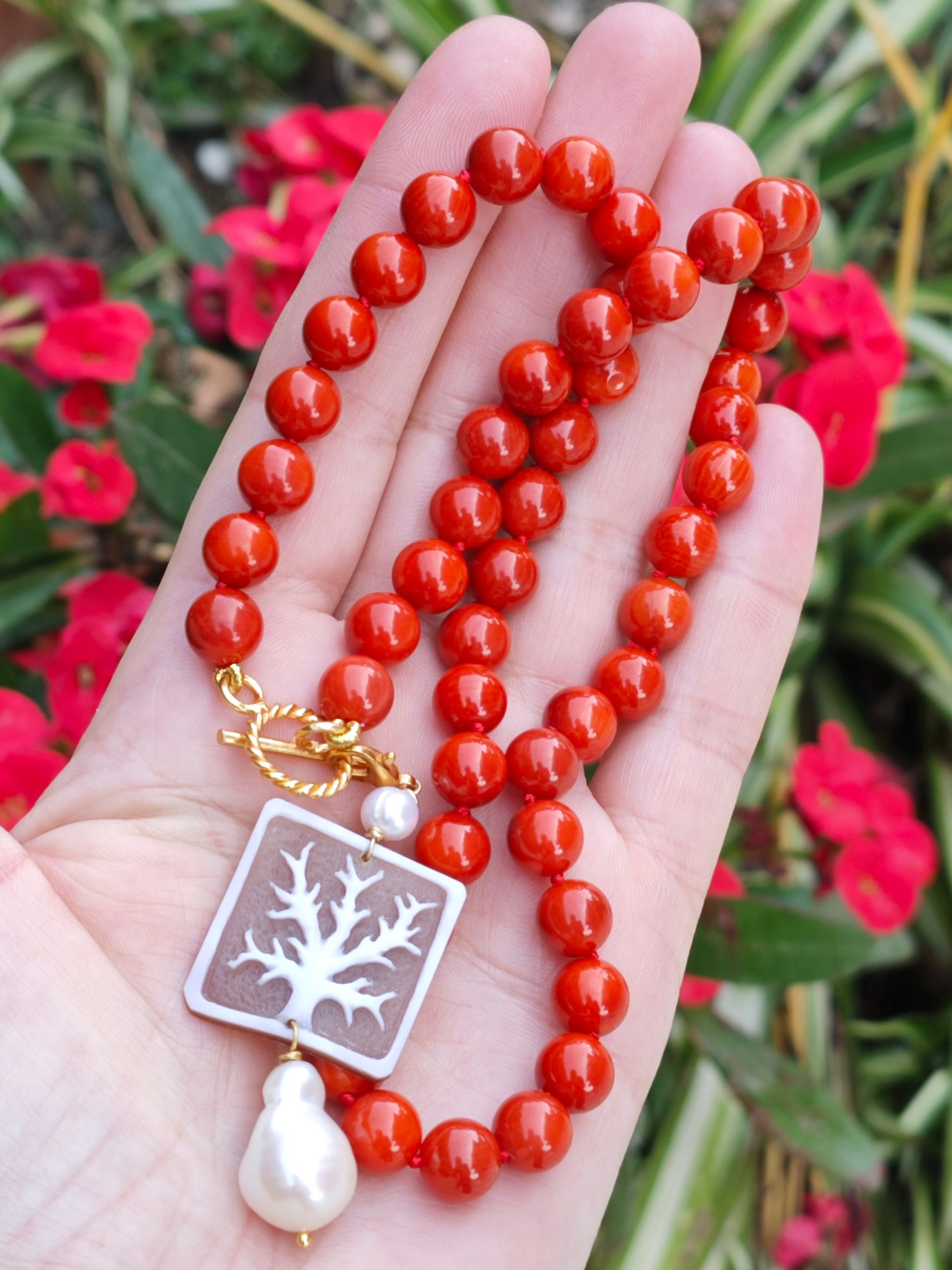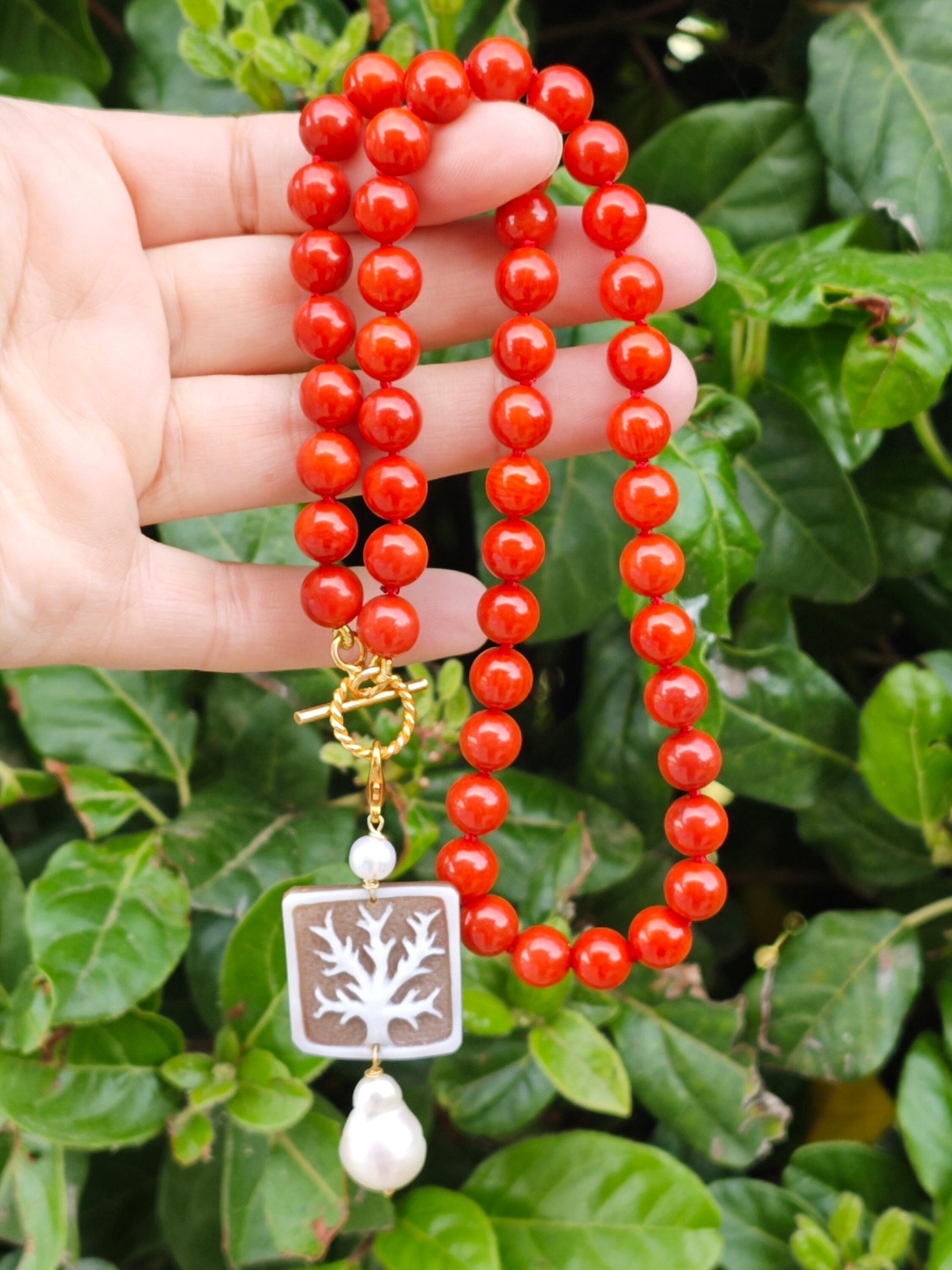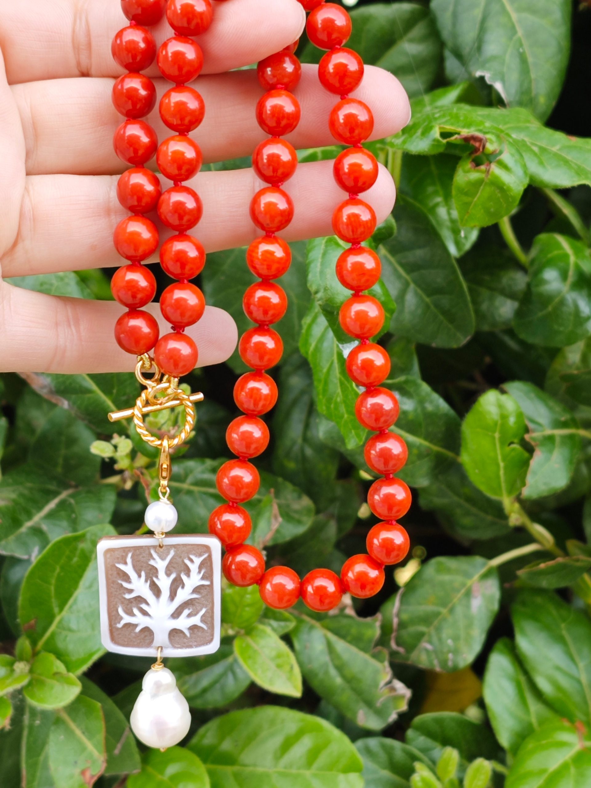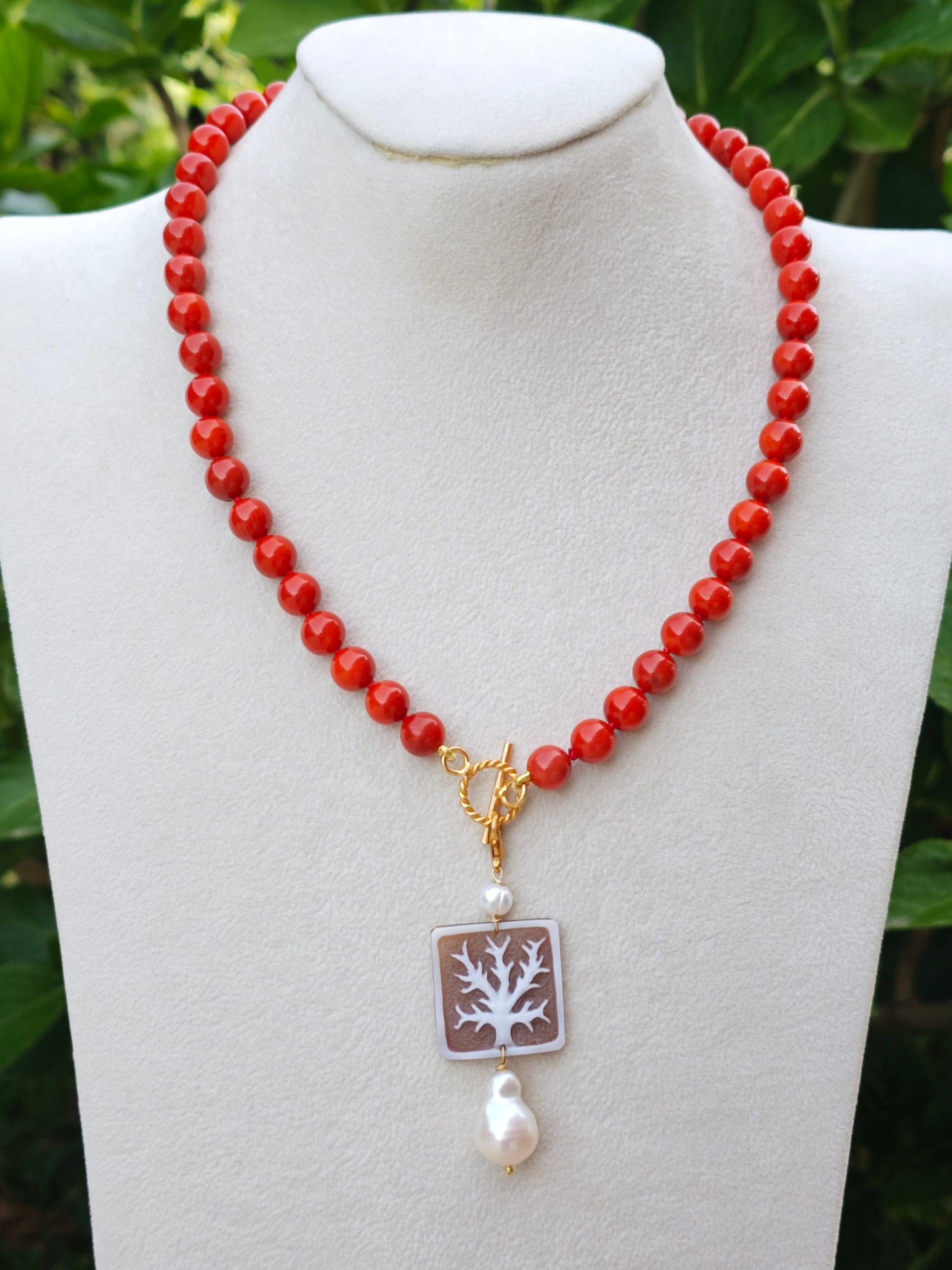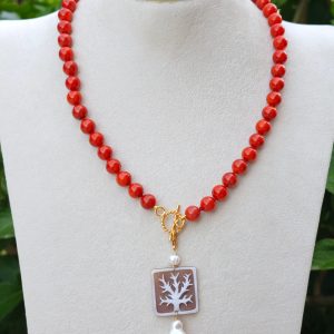 Collana corallo rosso con pendente cammeo conchiglia sardonica e perla barocca, gioielli italiani