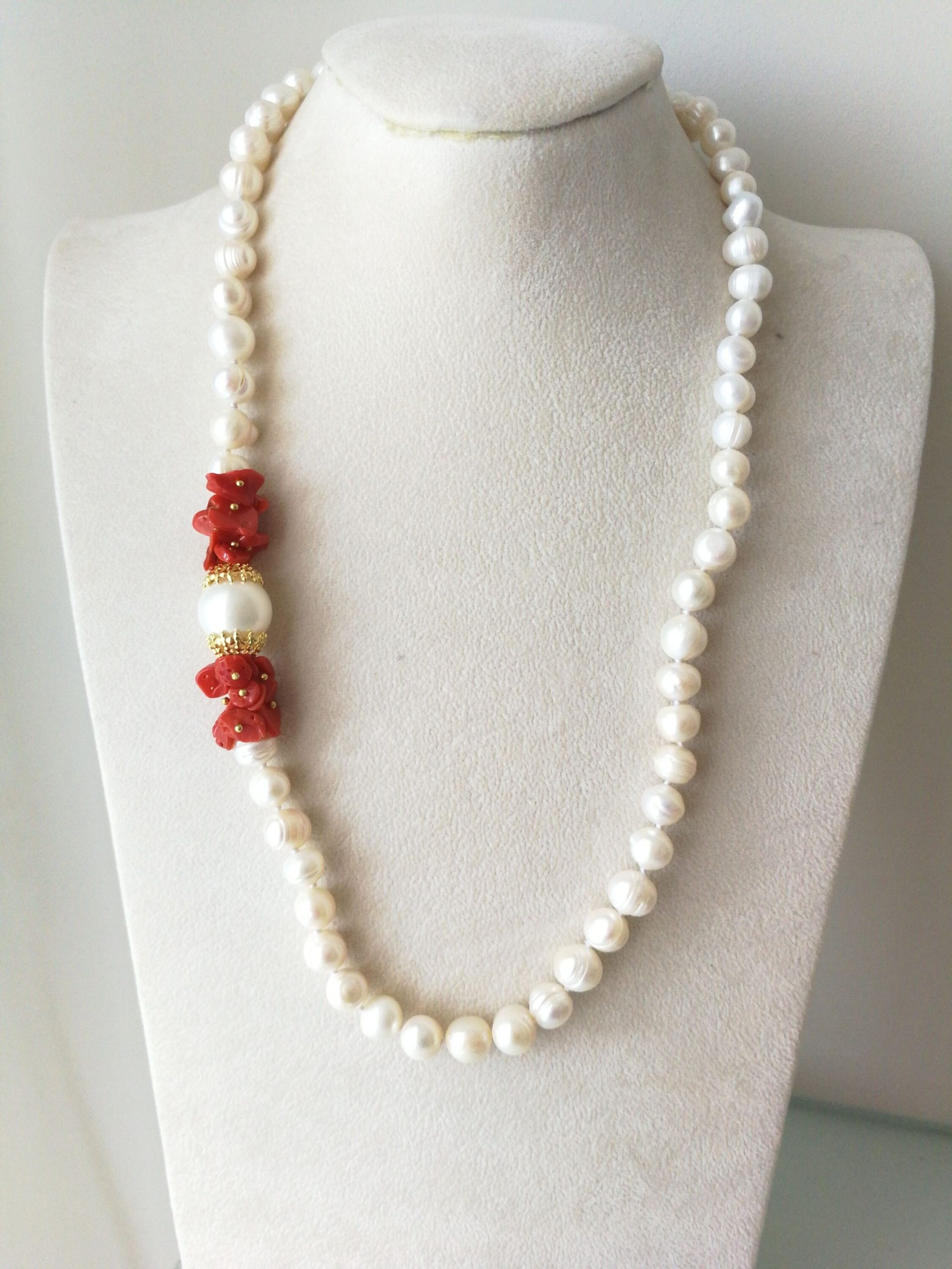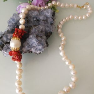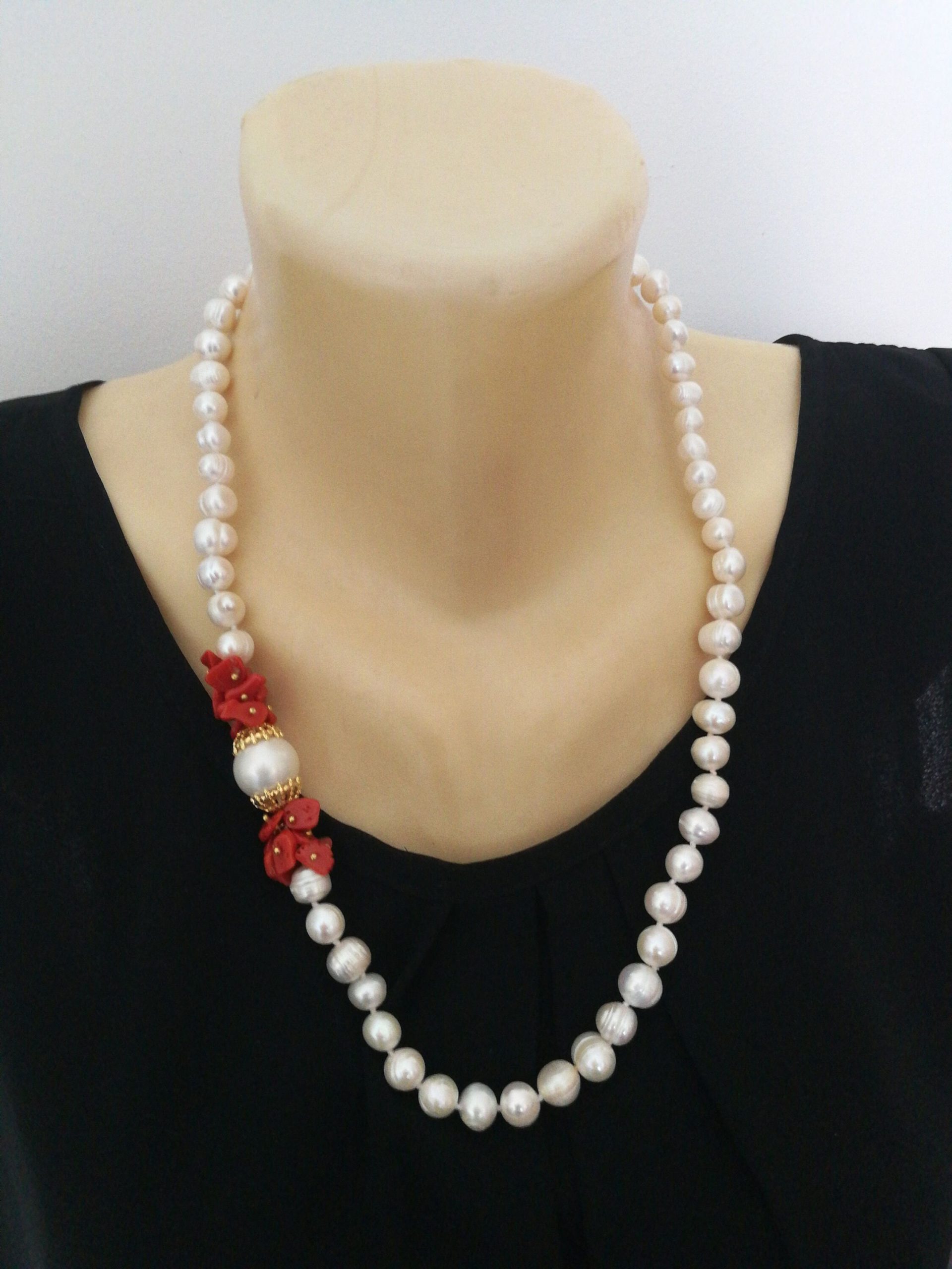 Collana elegante con perle naturali barocche bianche annodate, perla imperiale centrale montata fra corallo rosso naturale del mediterraneo a scaglie. Chiusura a moschettone. Lunghezza totale 55 cm.