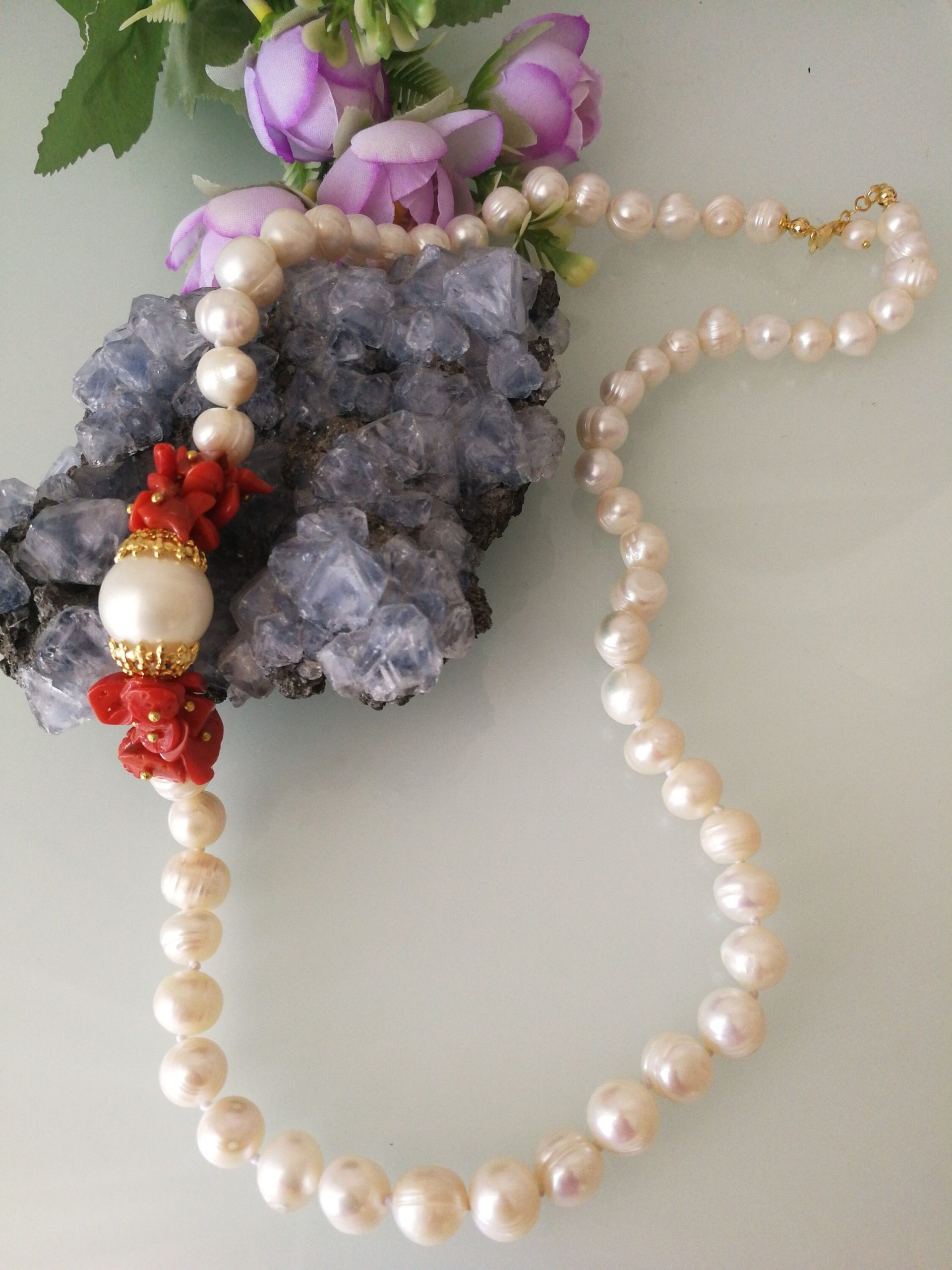 Collana corallo rosso del mediterraneo e perle bianche naturali, collana perla barocca.