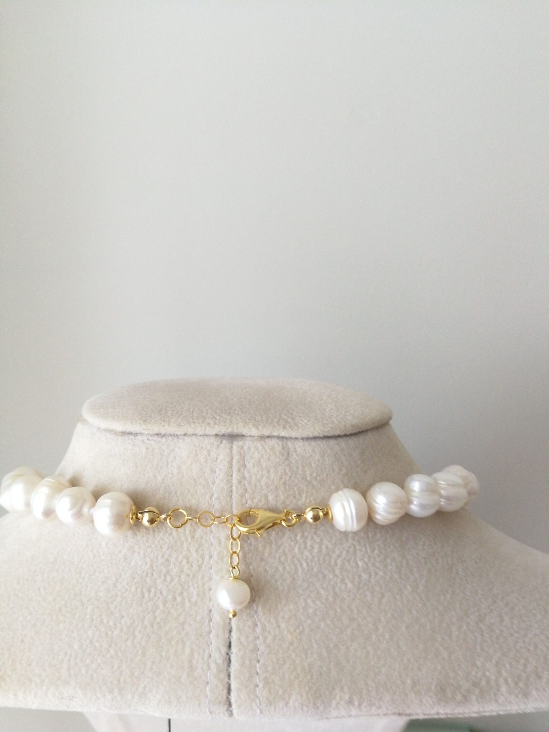 Collana girocollo perle barocche bianche con chiusura in argento 925 placcato oro,  gioielli italiani