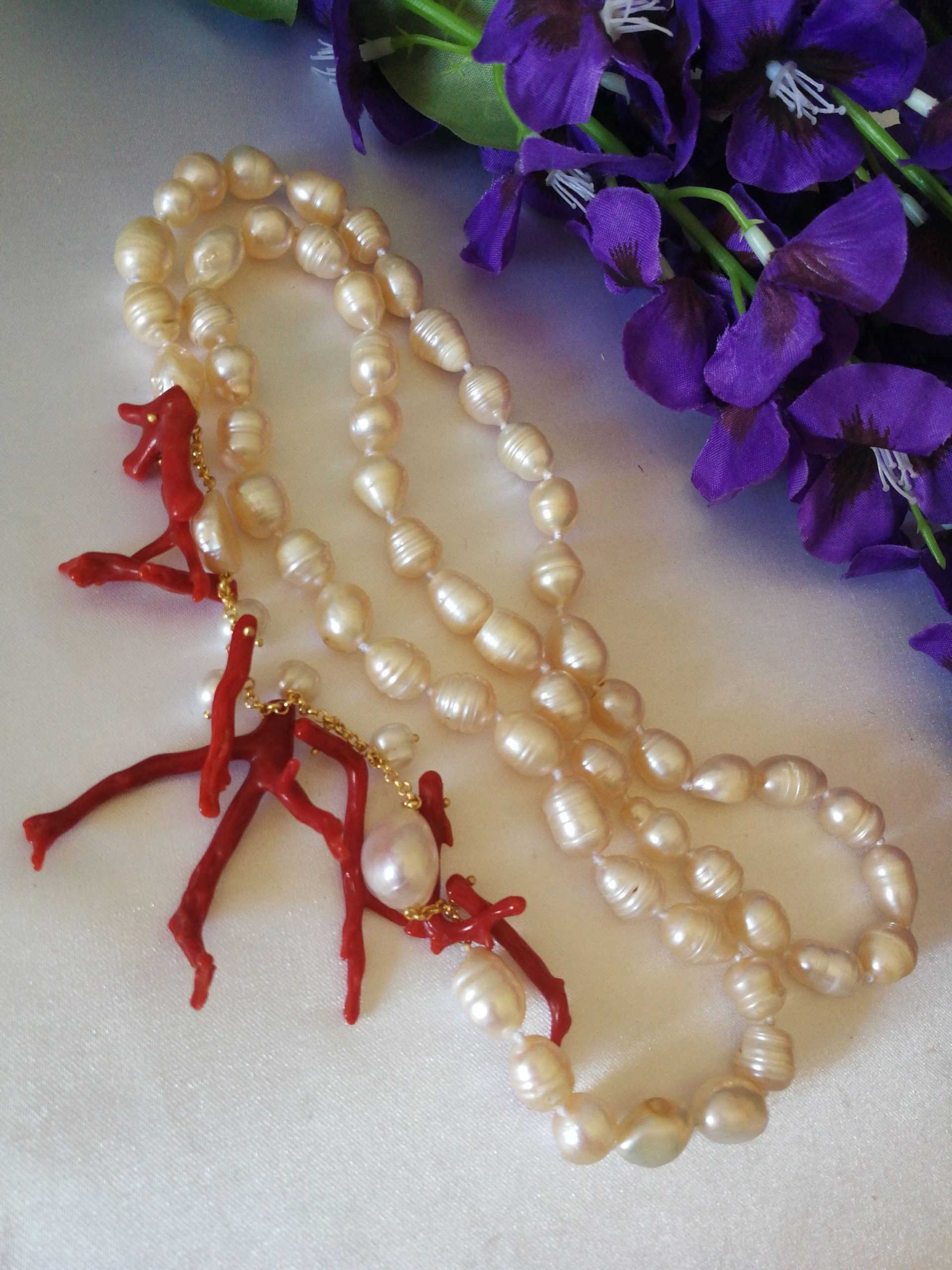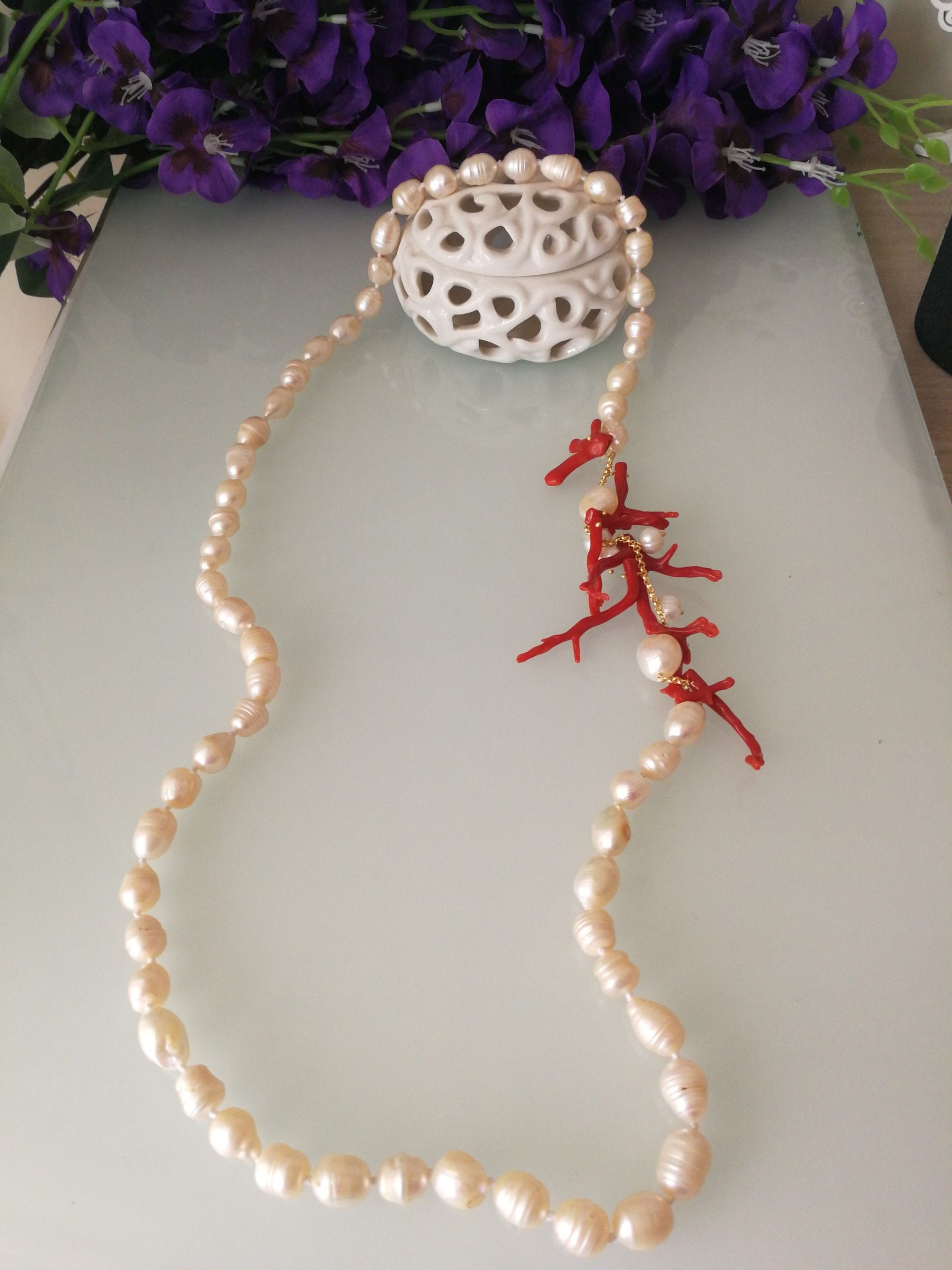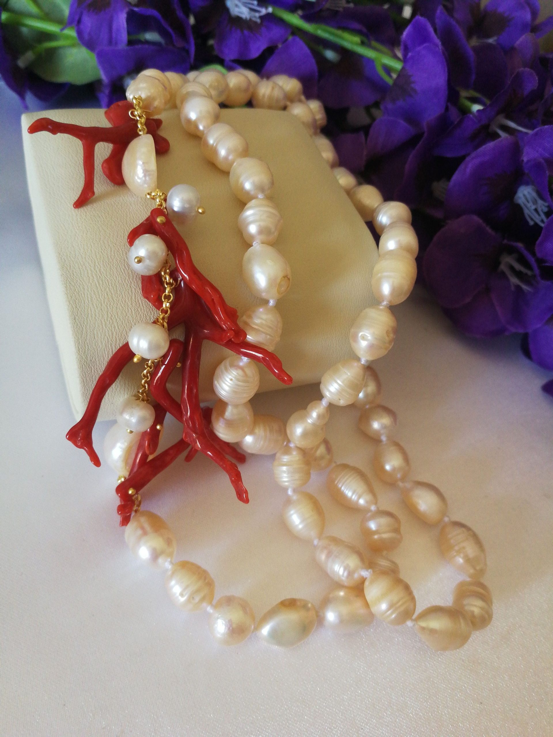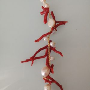 Collana corallo rosso del mediterraneo naturale e perla naturale bianca barocca naturale.