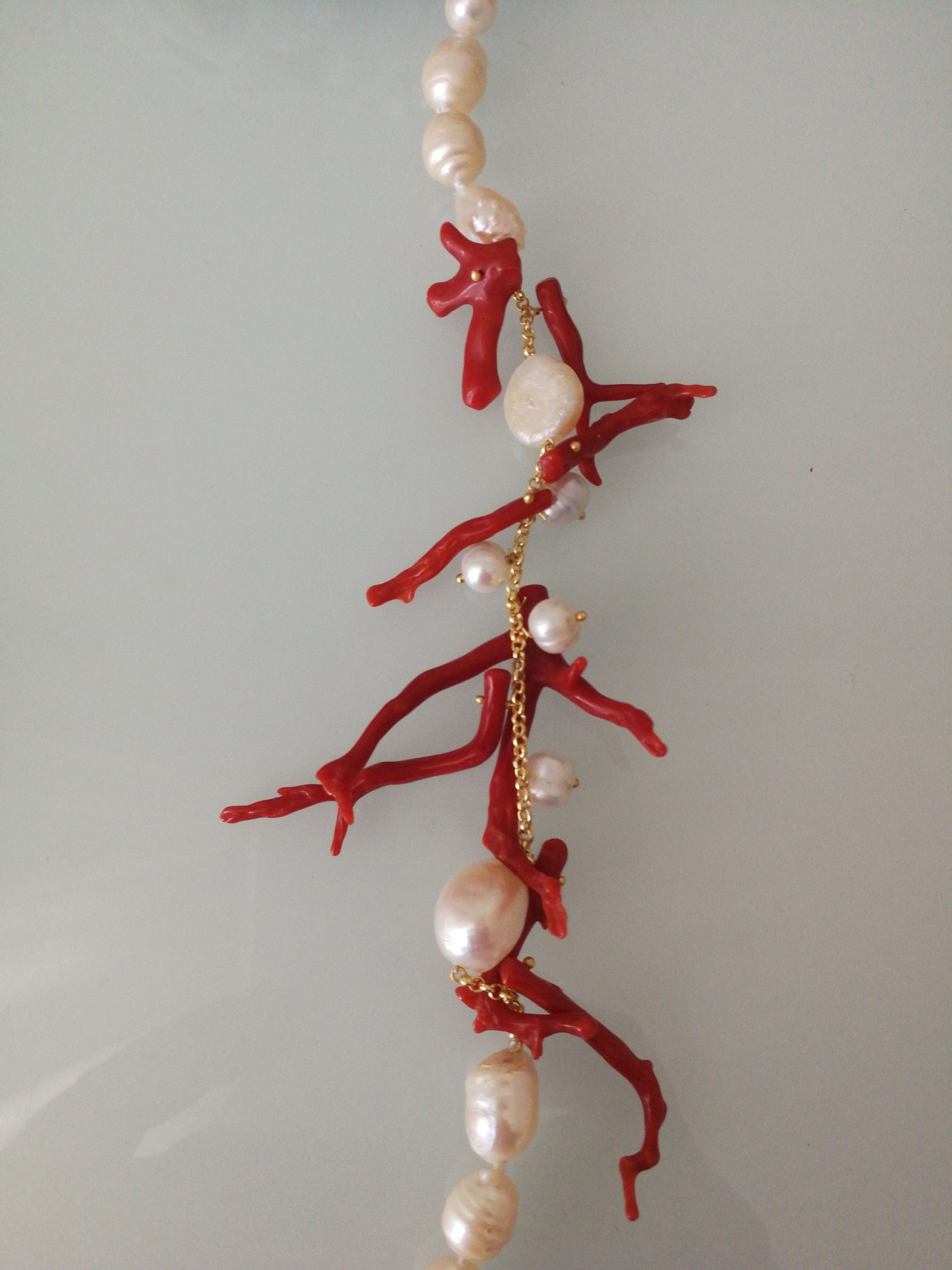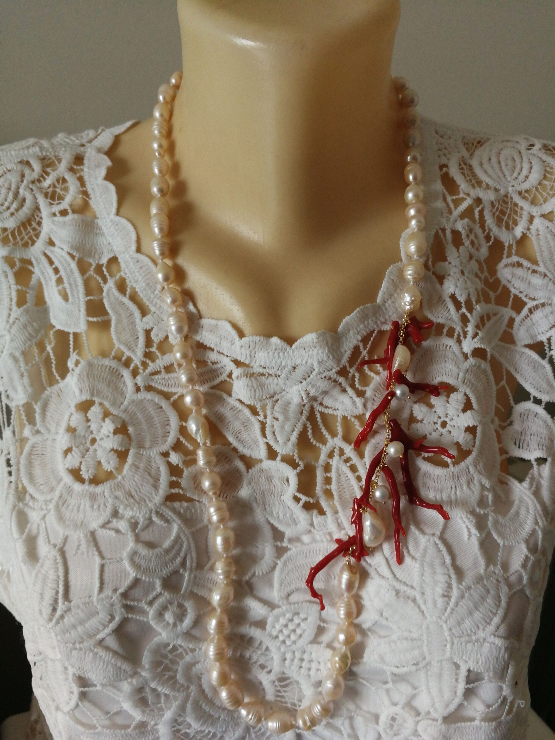 Collana maxi con perle naturali barocche bianche annodate e rametti di corallo rosso naturale del mediterraneo maxi.