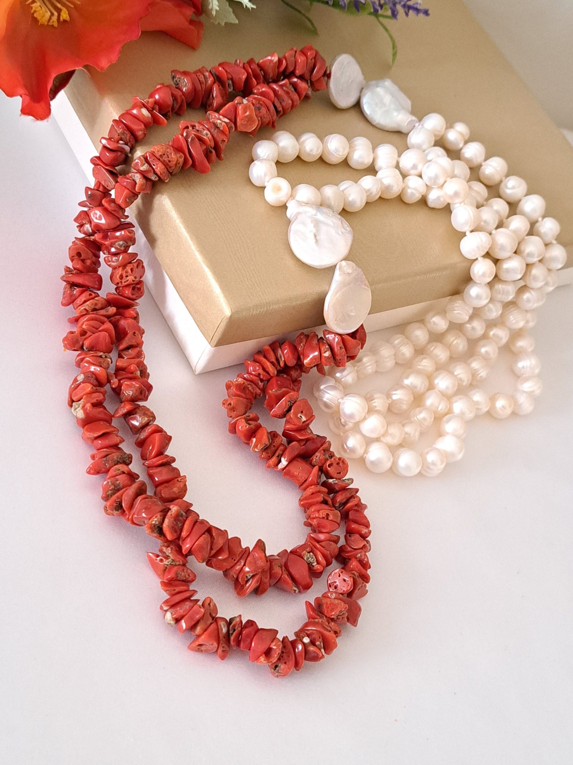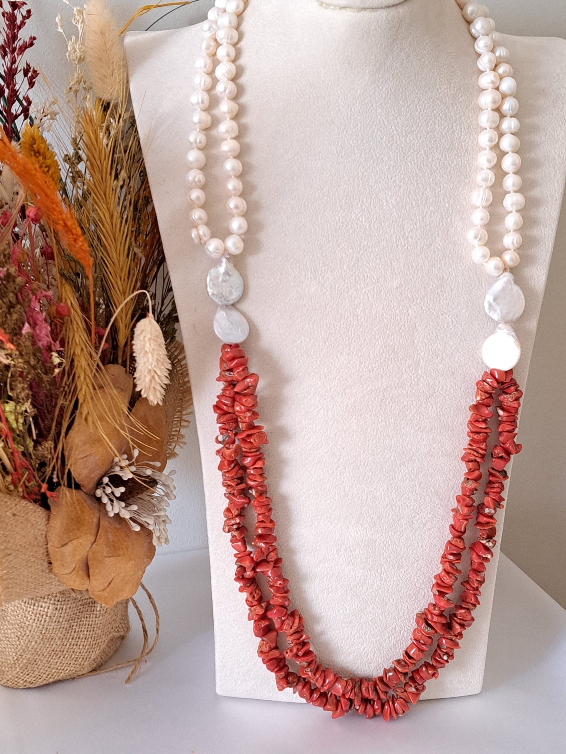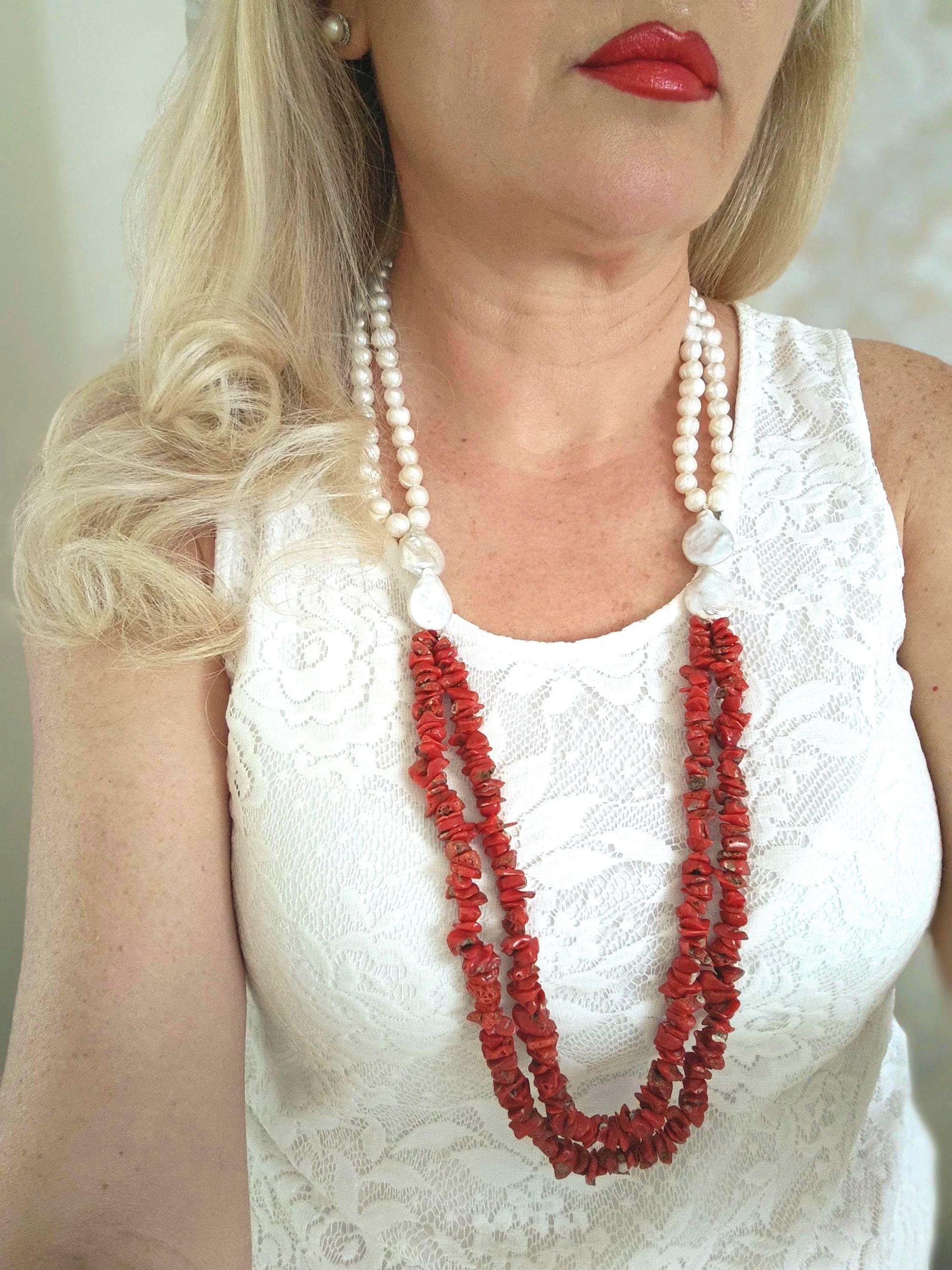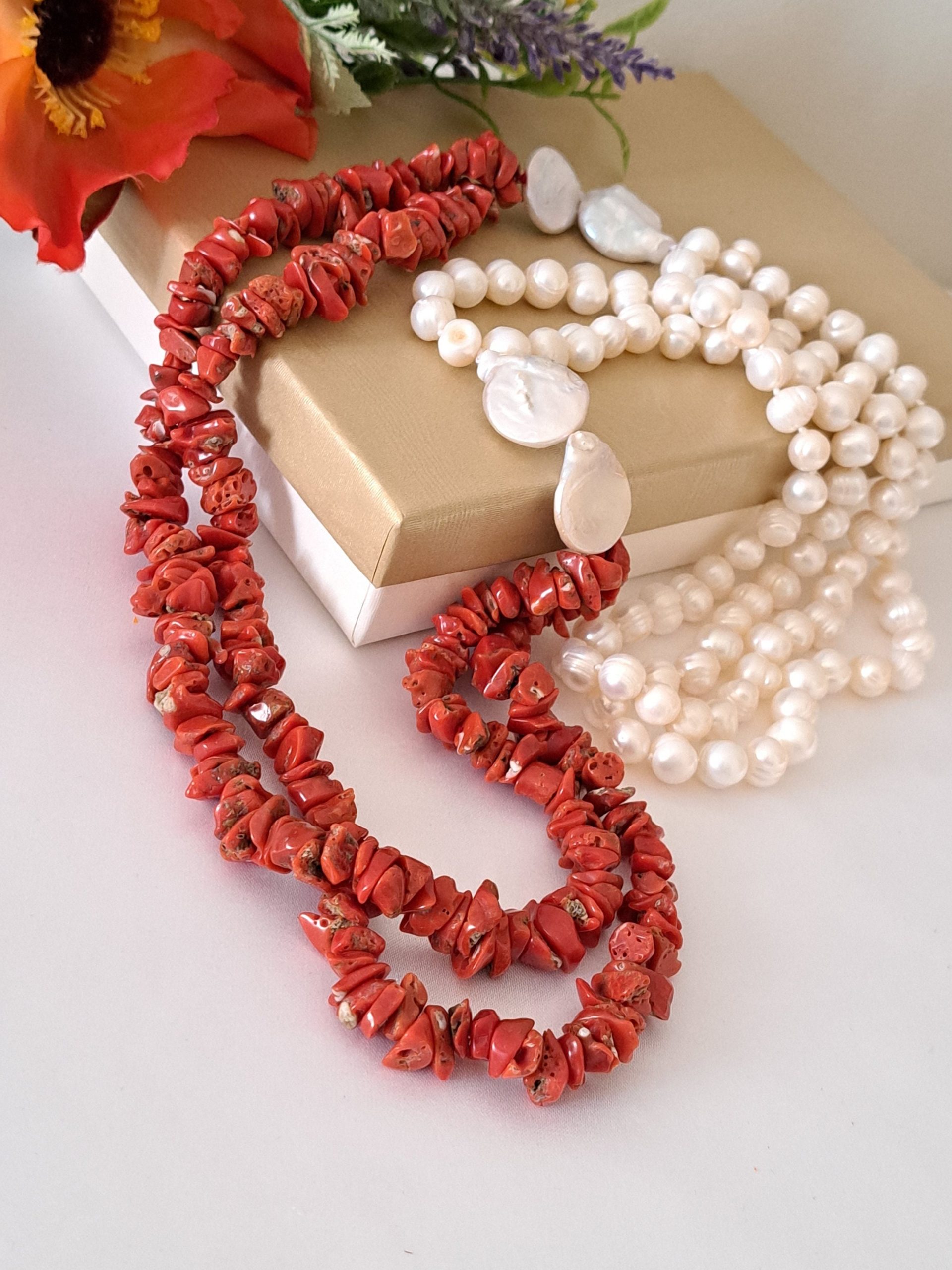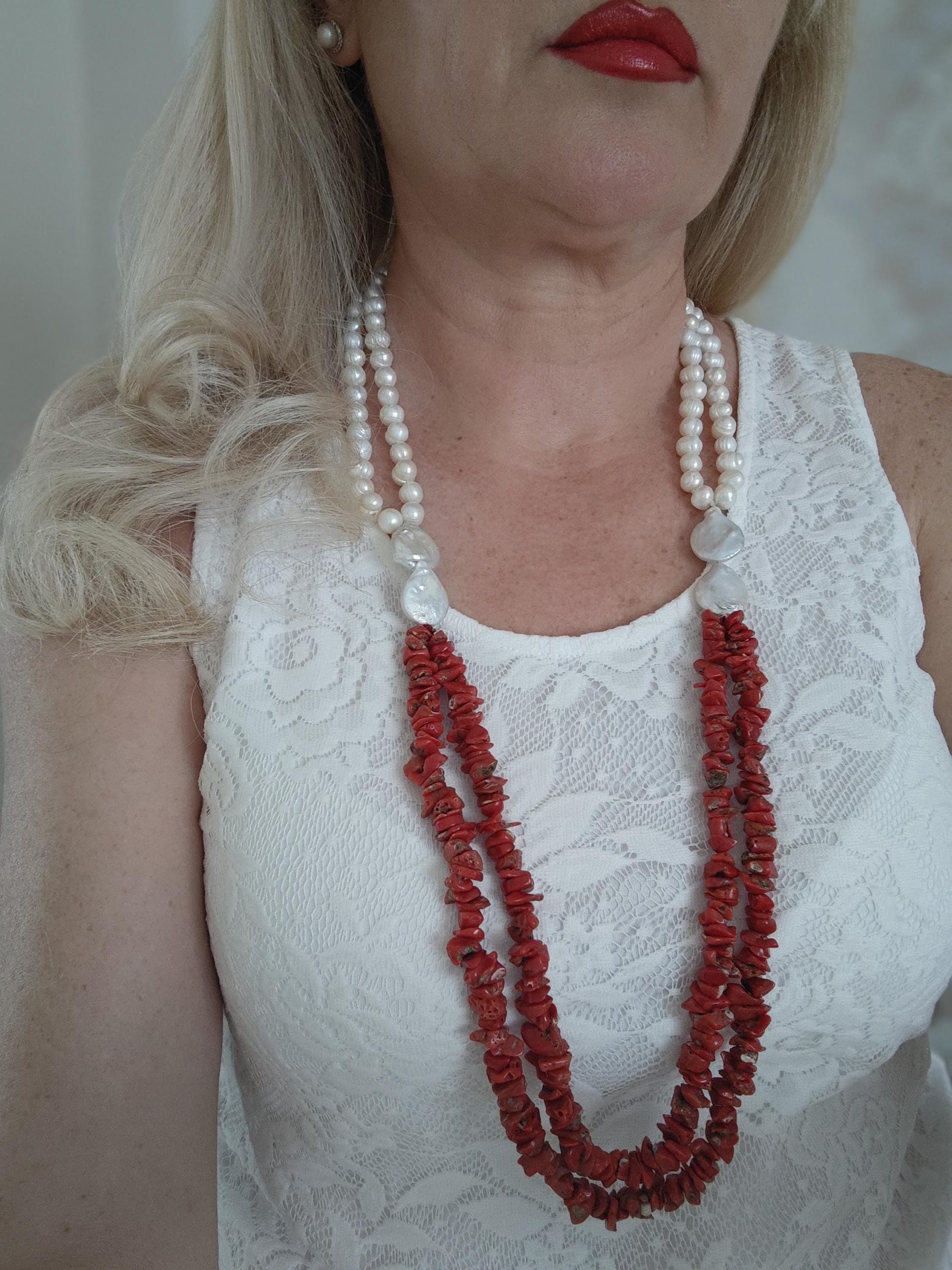 Collana realizzata con 2 fili corallo rosso mediterraneo, e 2 fili perle bianche naturalie perle coin bianche, lunghezza 80 cm.