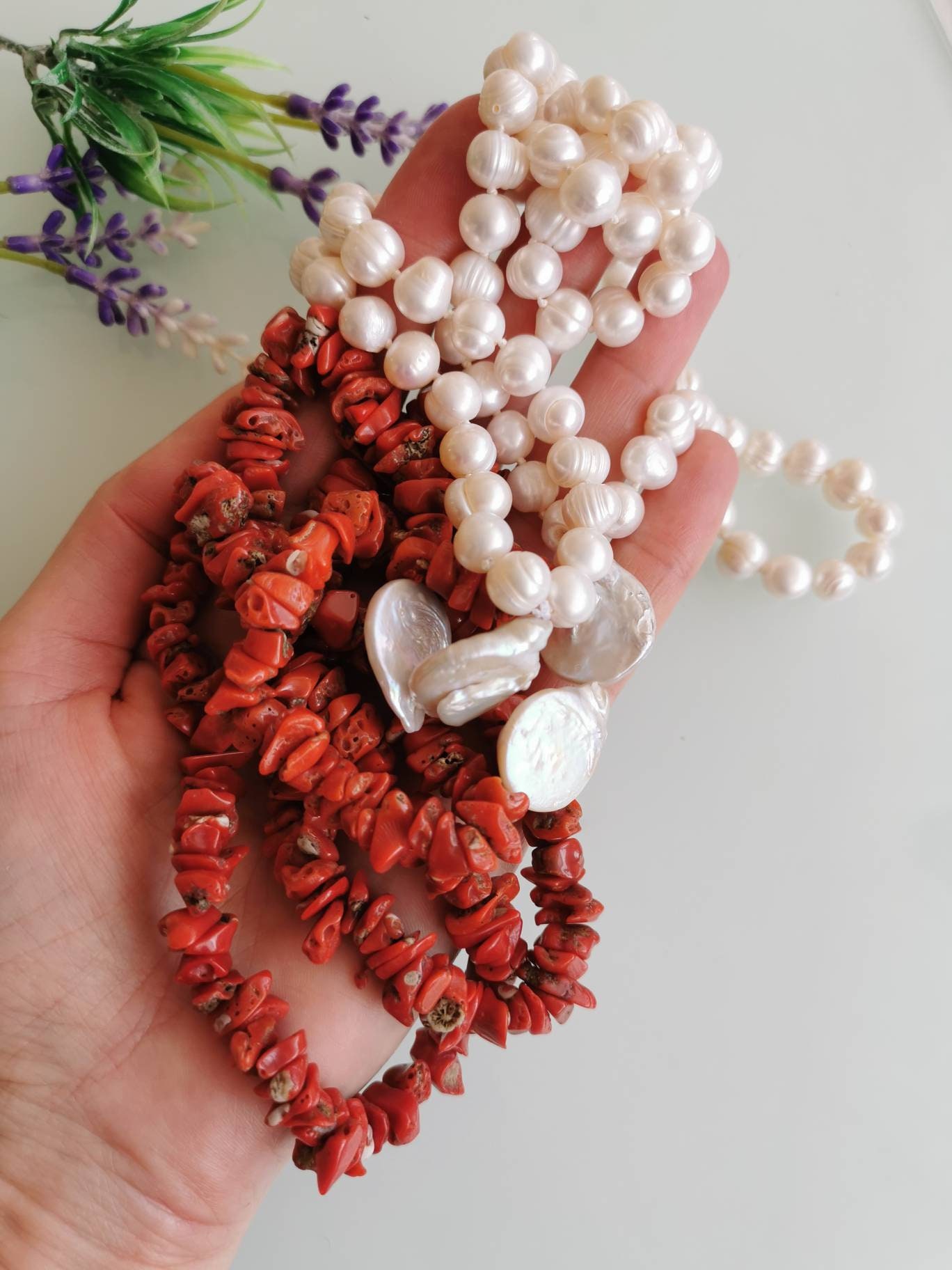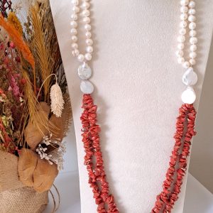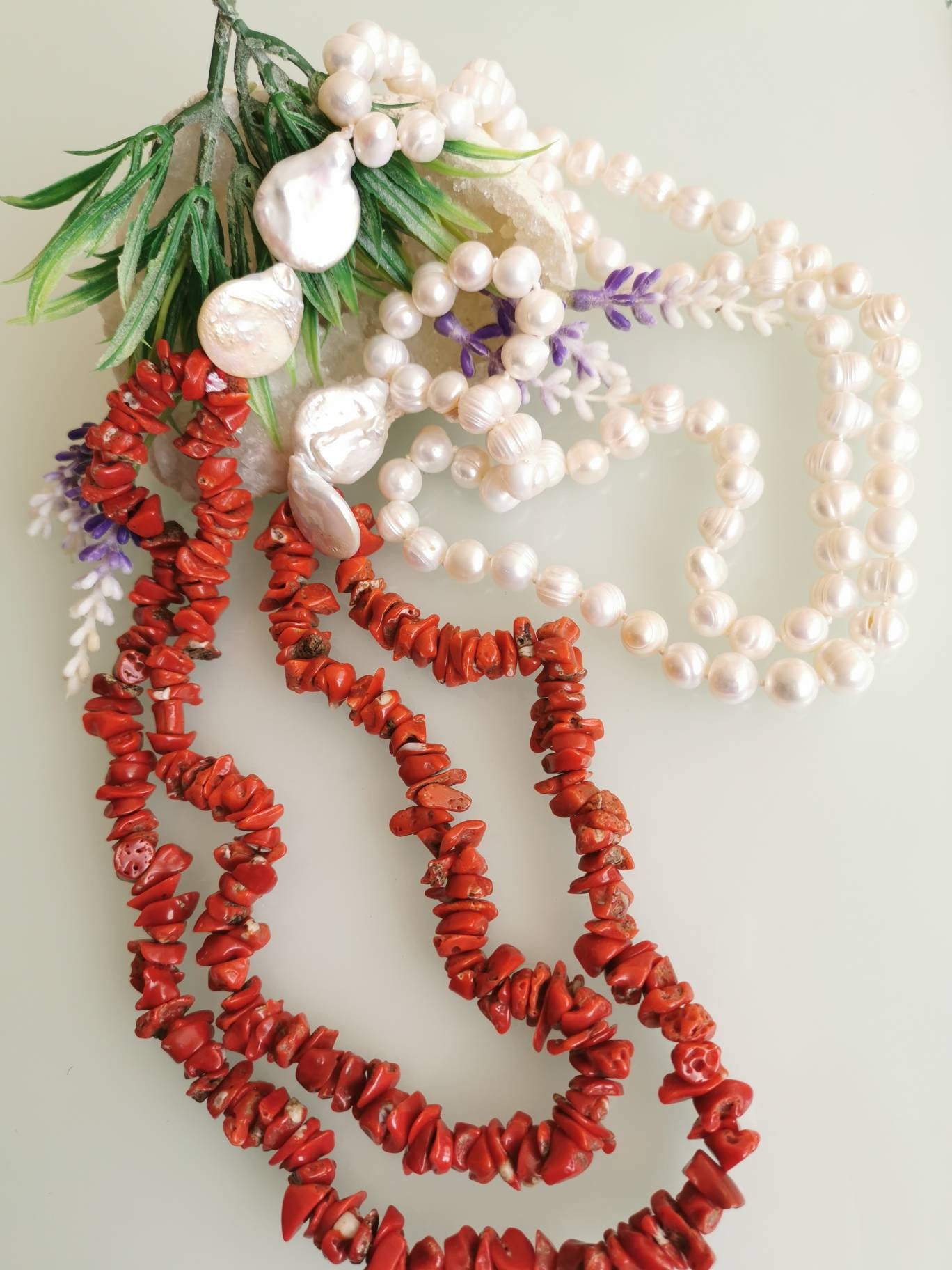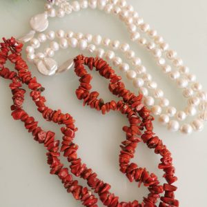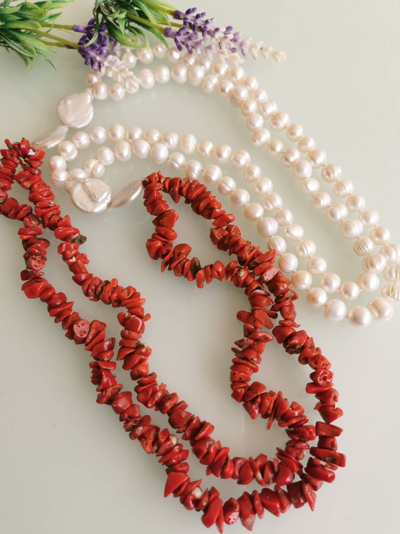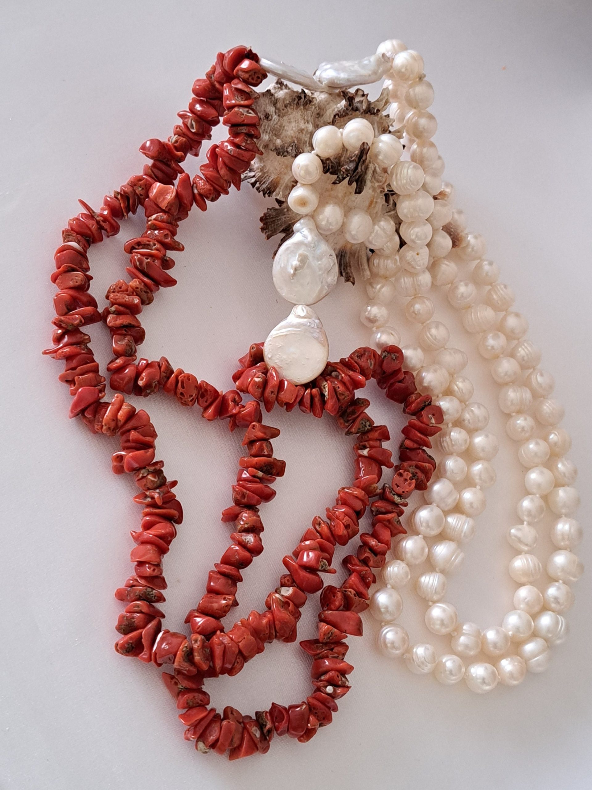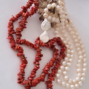 Collana realizzata con 2 fili corallo rosso mediterraneo, e 2 fili perle bianche naturalie perle coin bianche, lunghezza 80 cm.