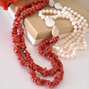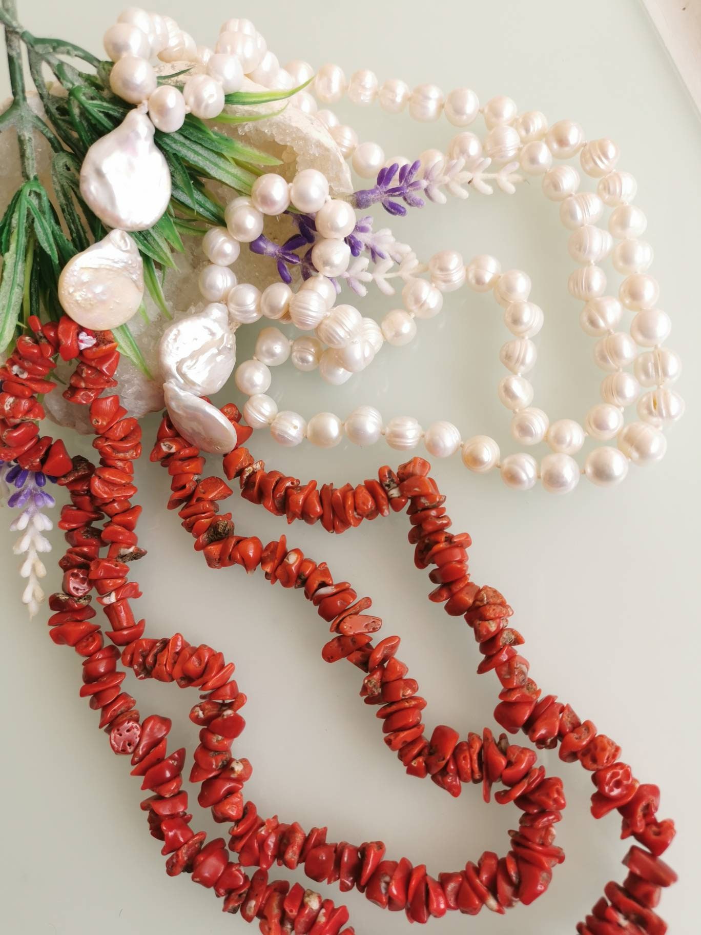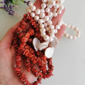Collana corallo rosso e perle barocche bianche , gioielli italiani
