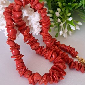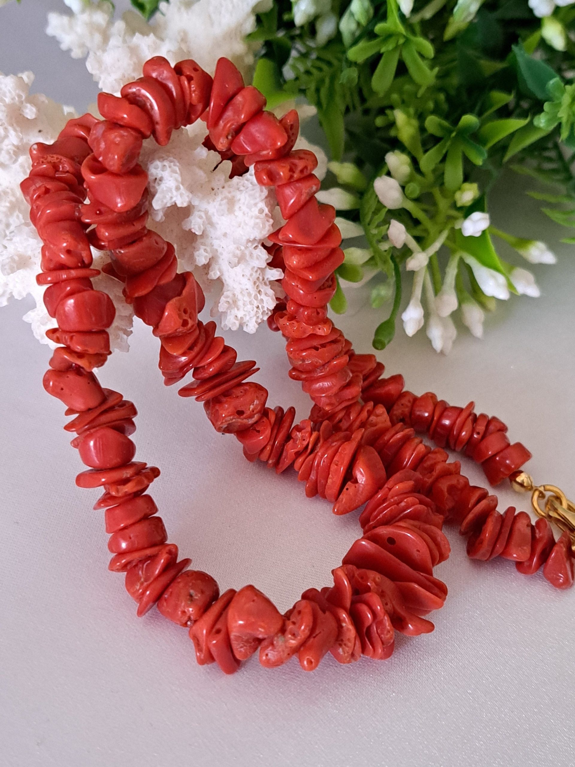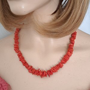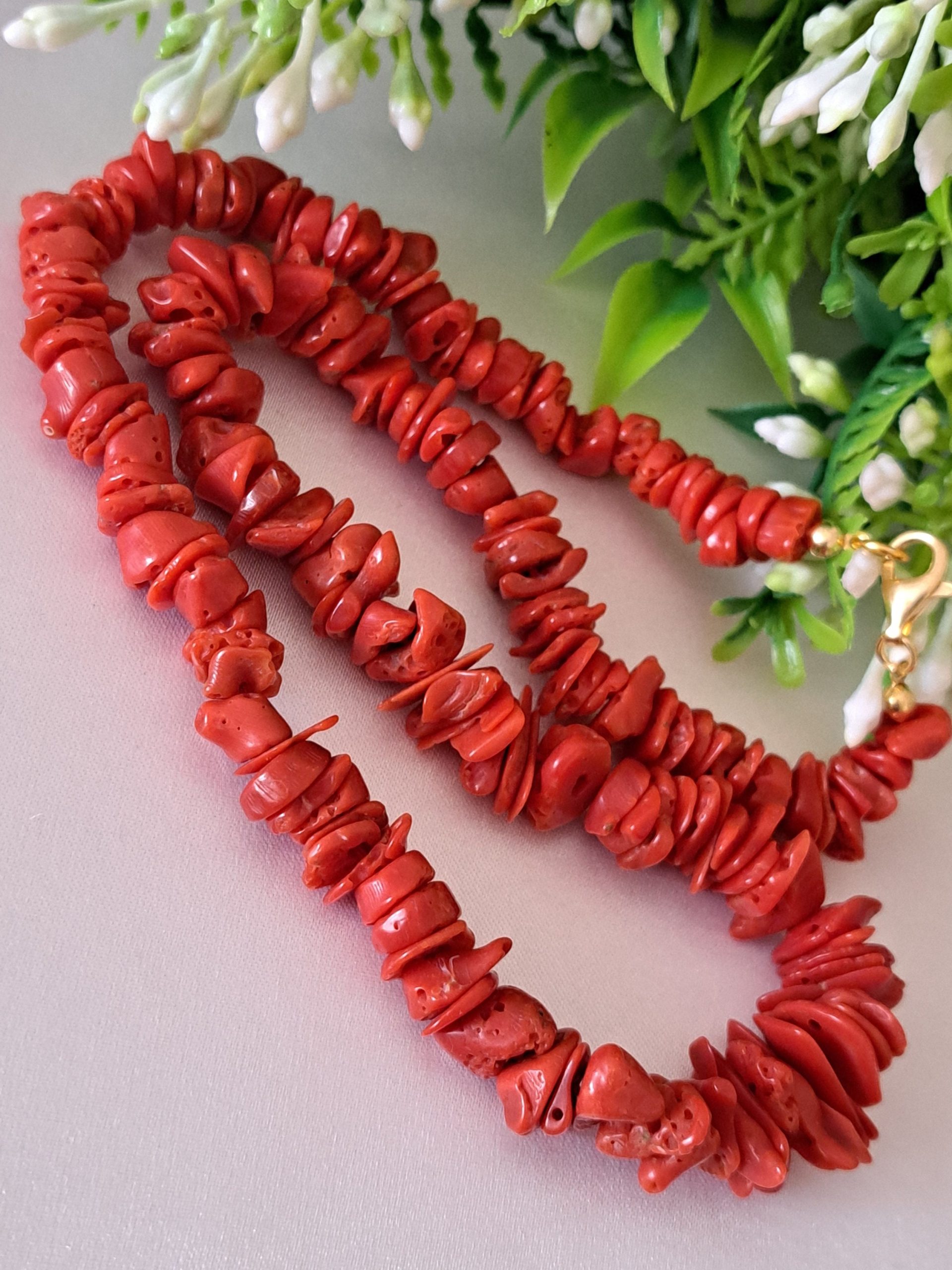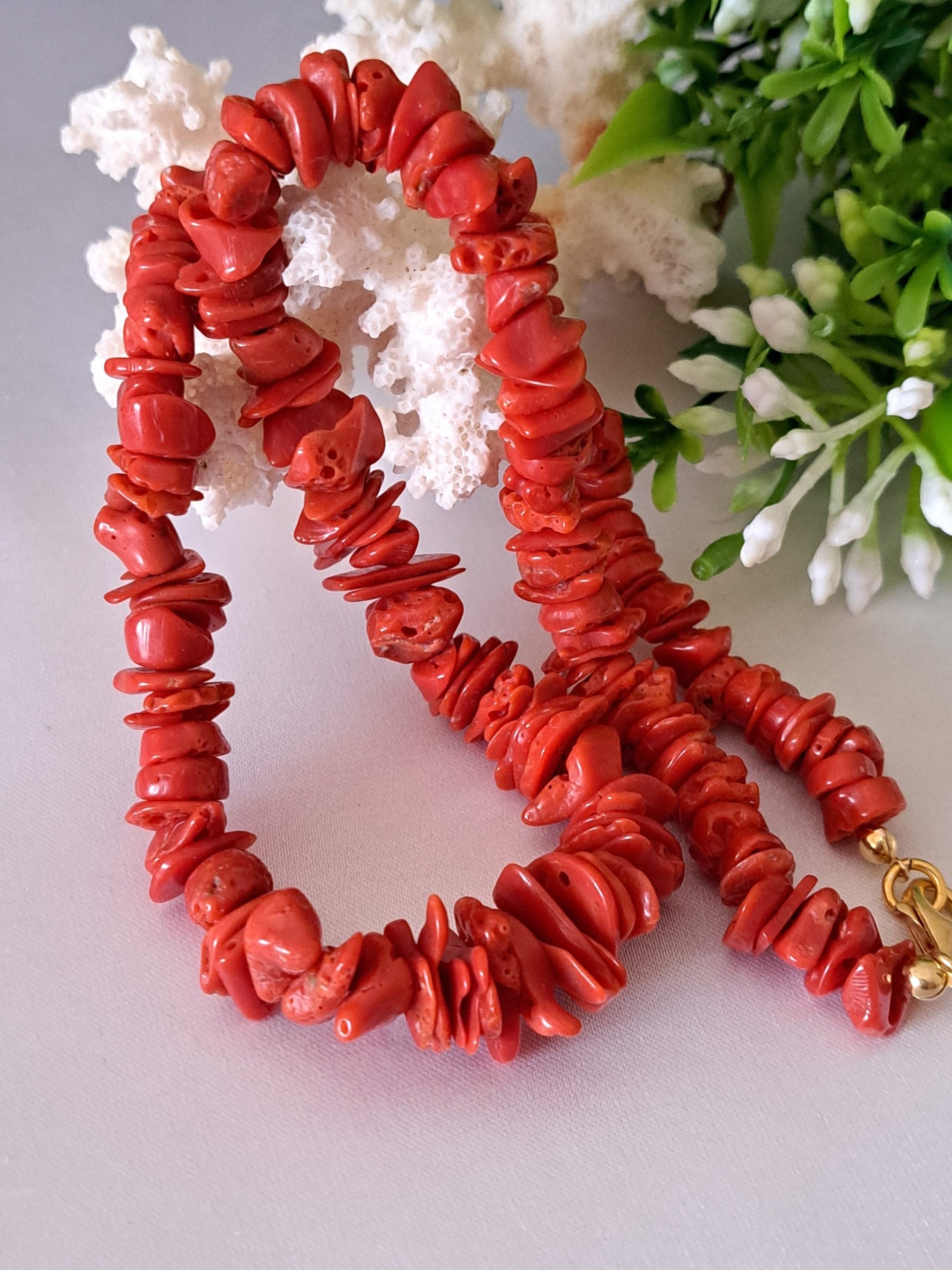 Collana girocollo realizzata con chips corallo naturale del mediterraneo, chiusura a moschettone in argento 925 placcato oro, lunghezza 46 cm.
