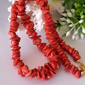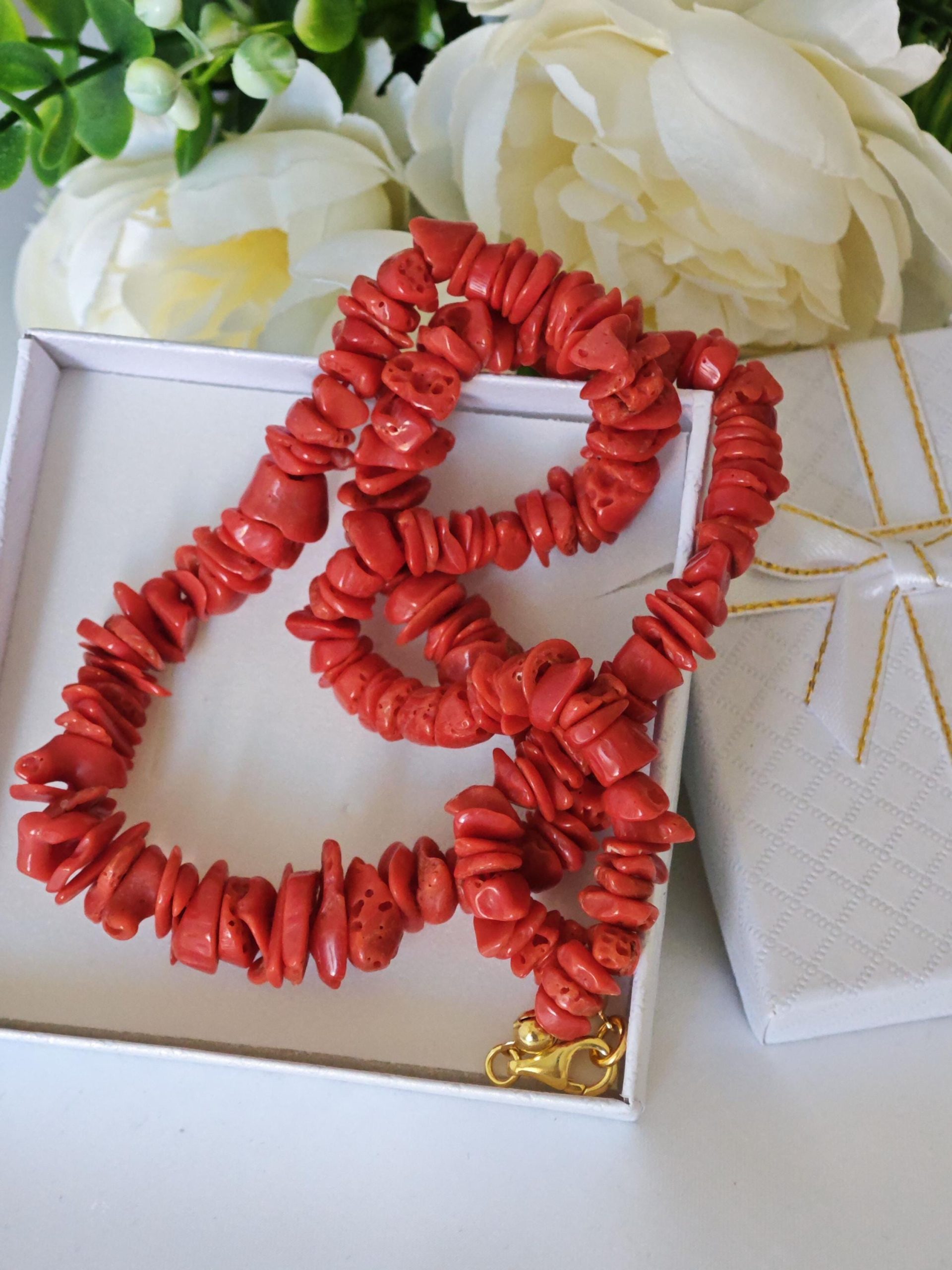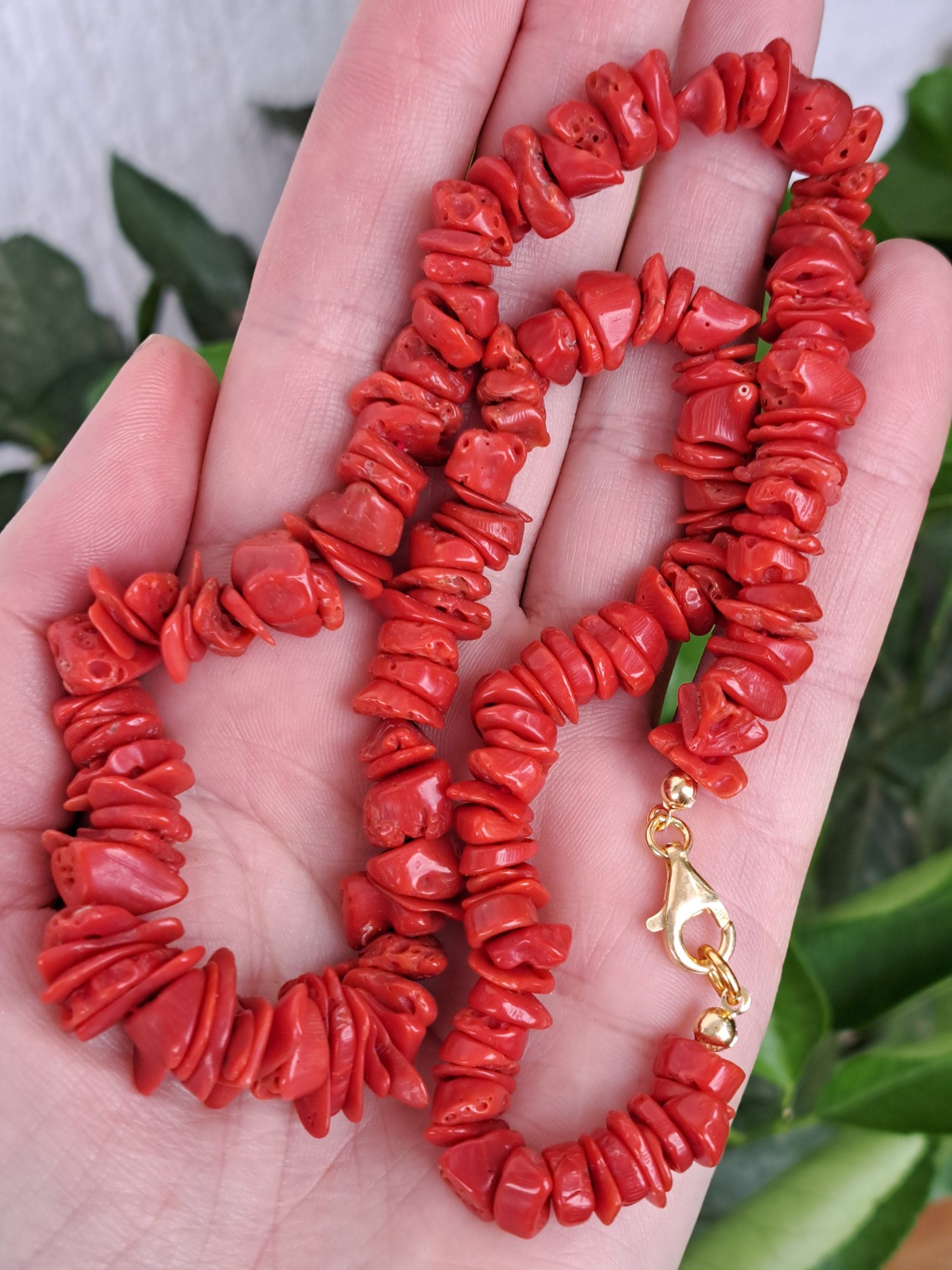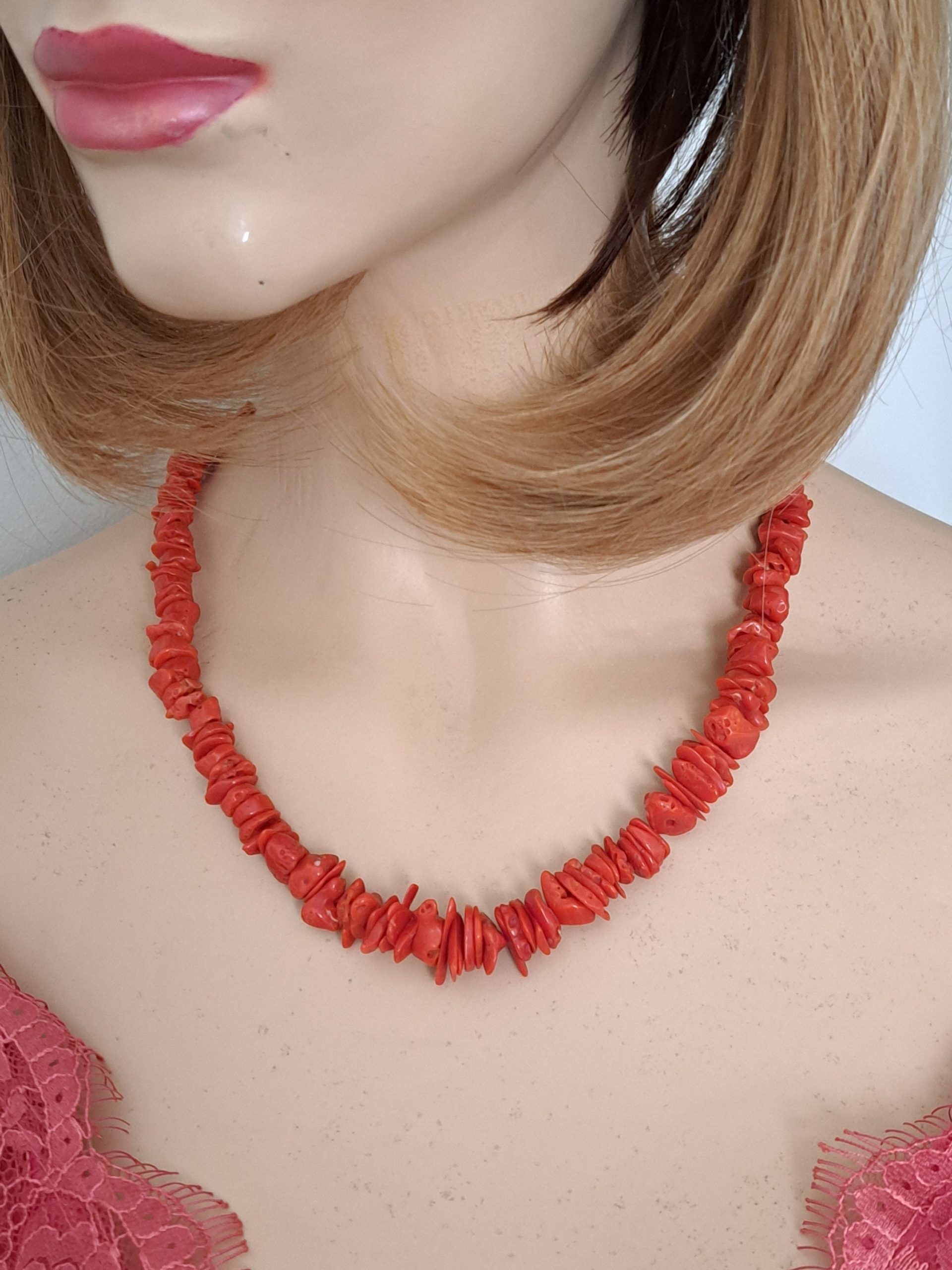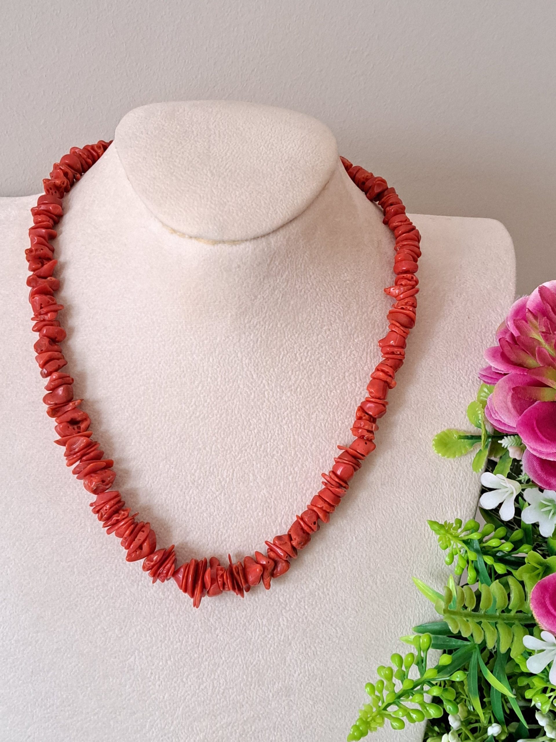 Collana girocollo realizzata con chips corallo naturale del mediterraneo, chiusura a moschettone in argento 925 placcato oro, lunghezza 46 cm.